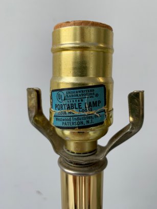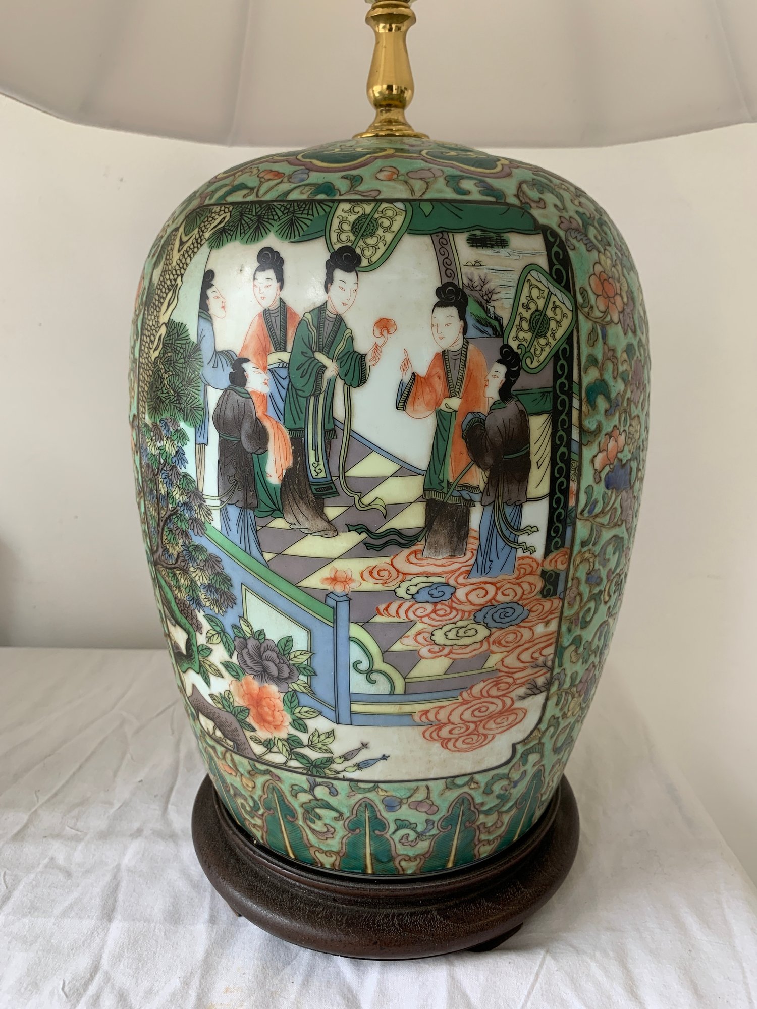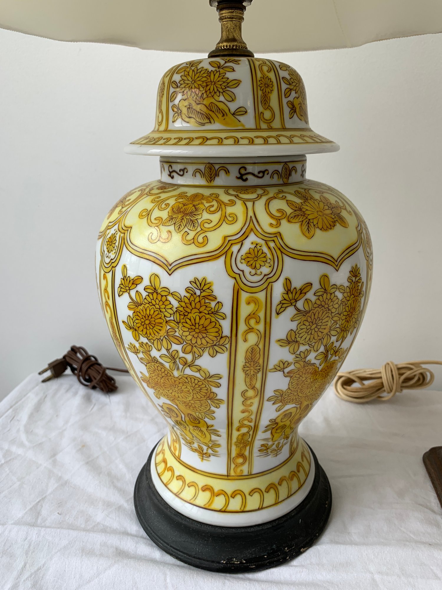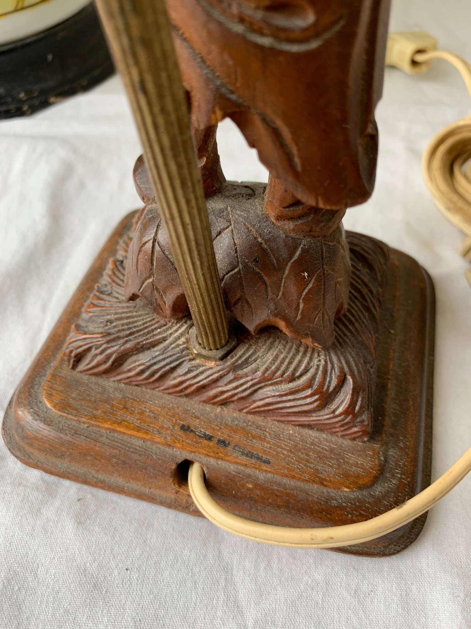 3 lamps are porcelain , 1 lamp is carved wood. Blue and white lamp marked Westwood industries, all lamps have silk shades.