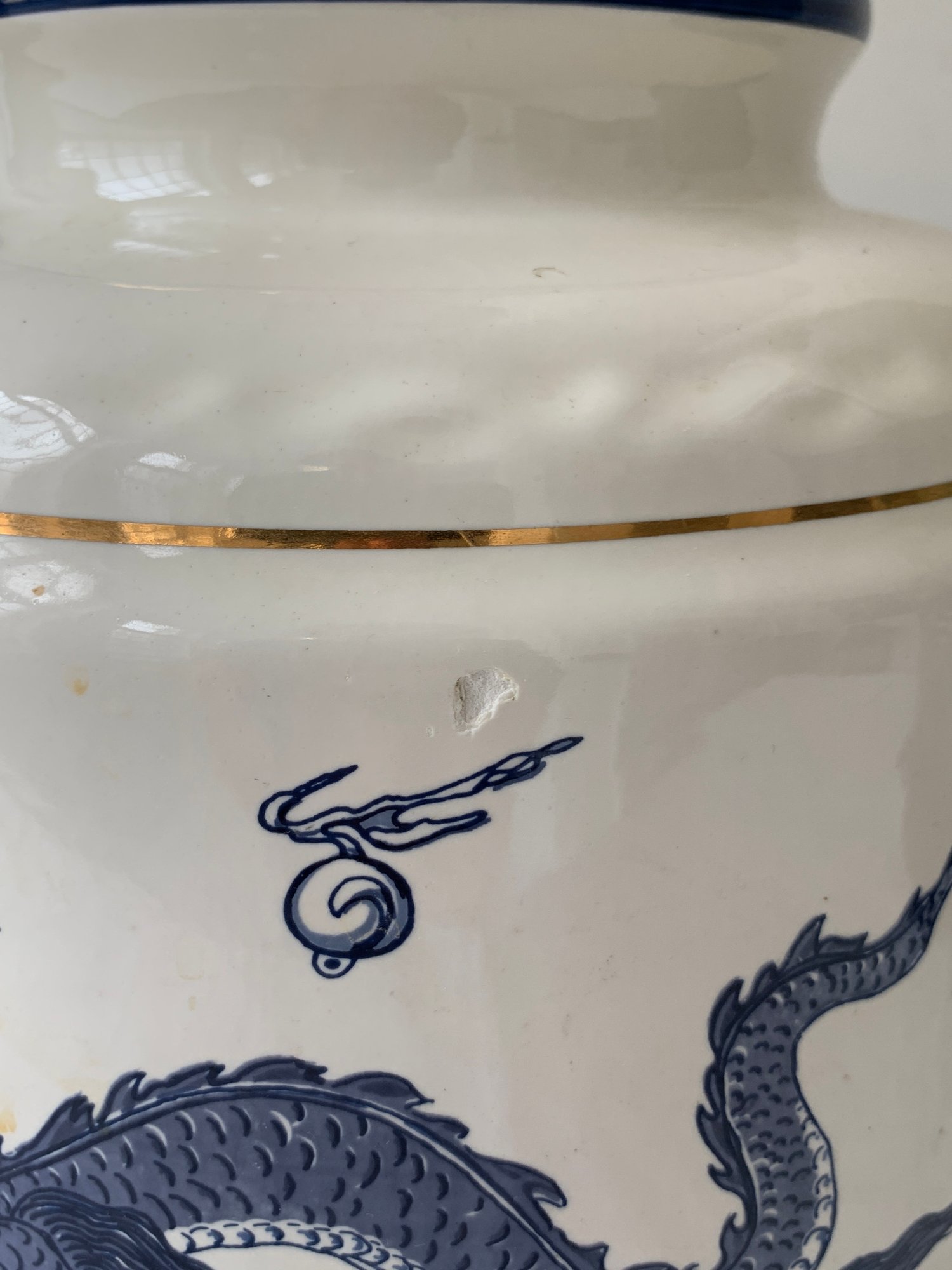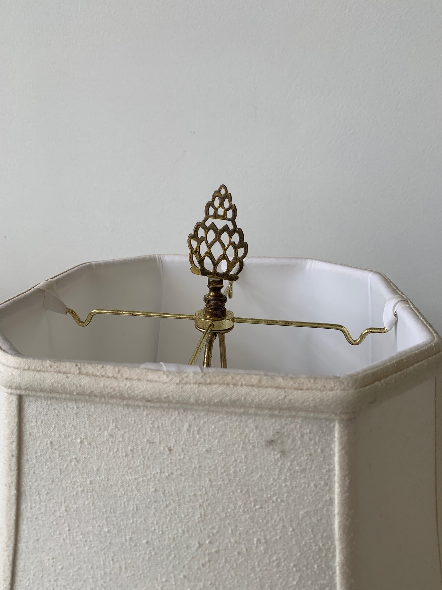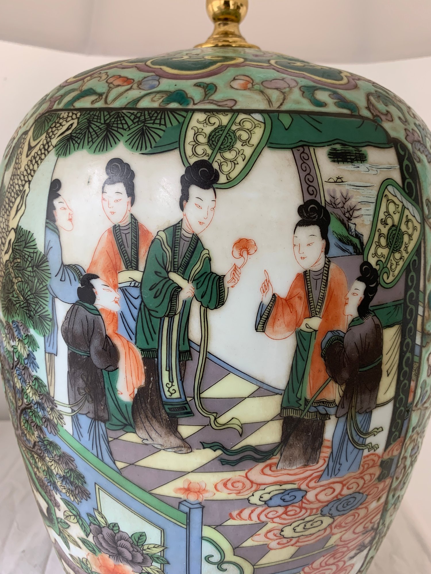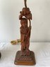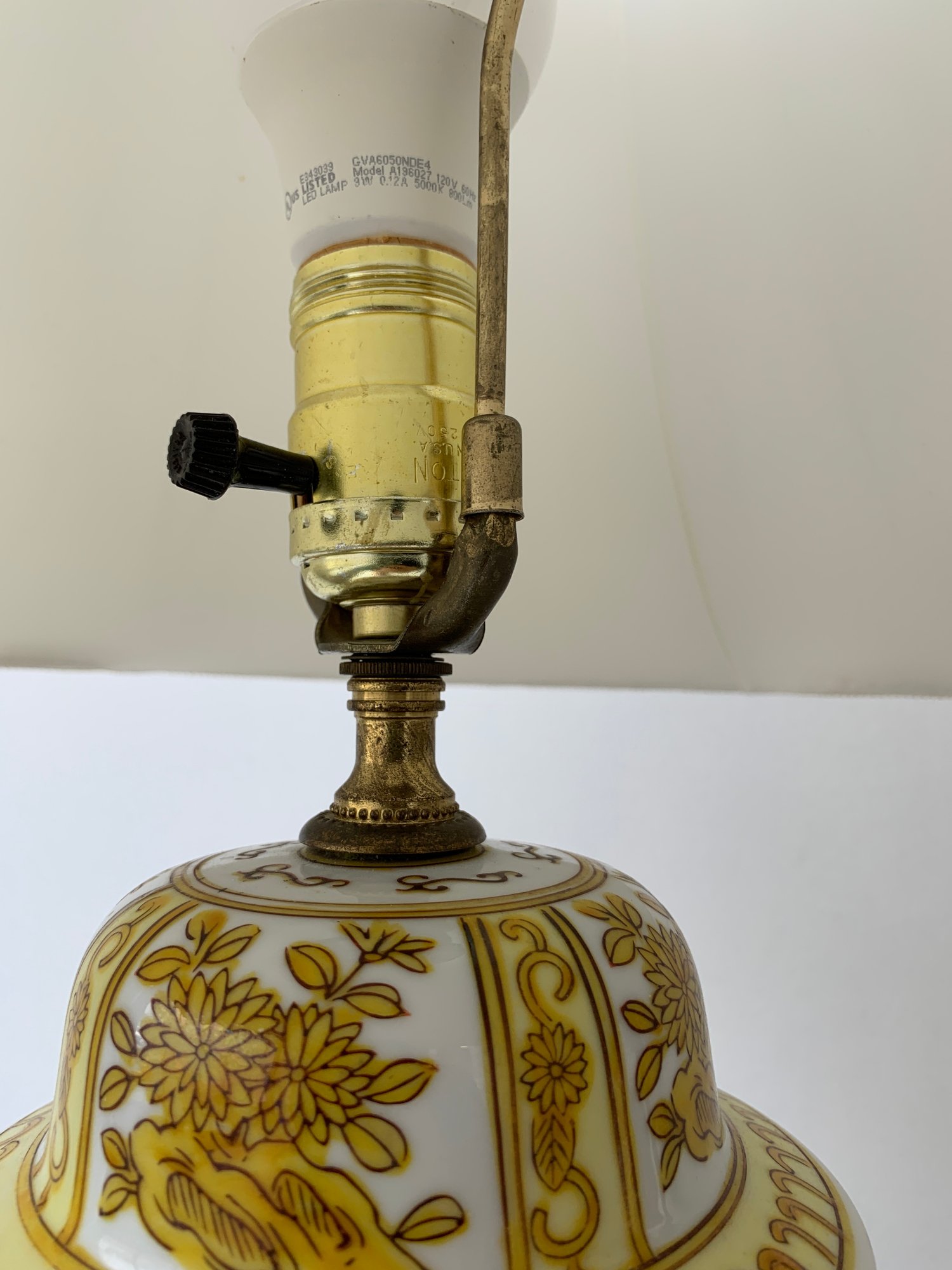 3 lamps are porcelain , 1 lamp is carved wood. Blue and white lamp marked Westwood industries, all lamps have silk shades.
