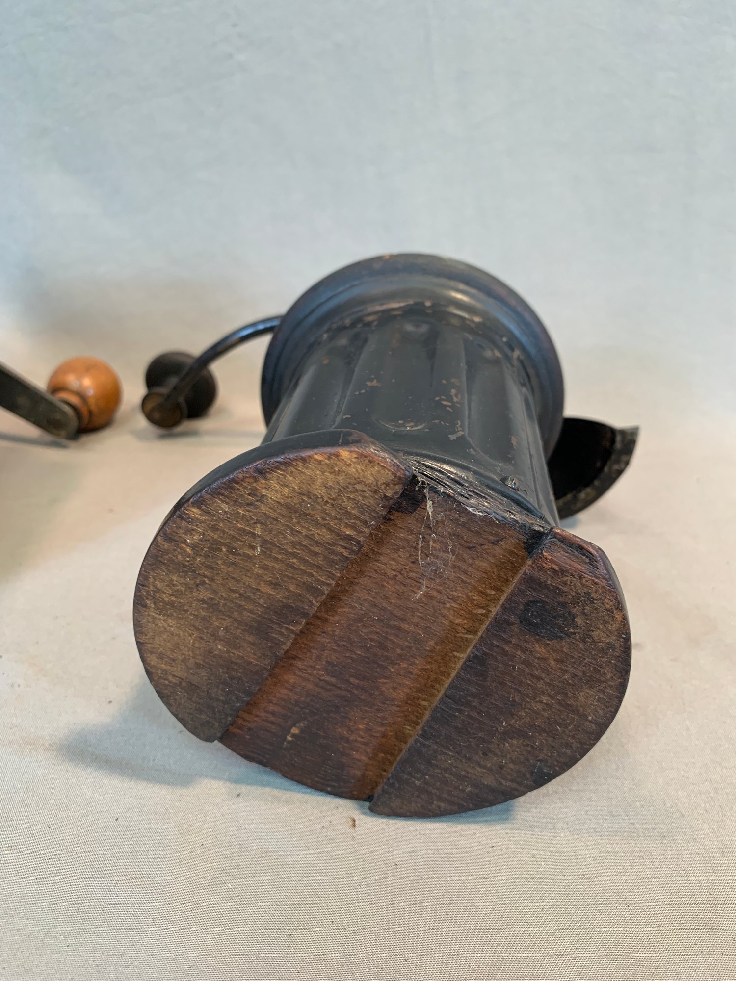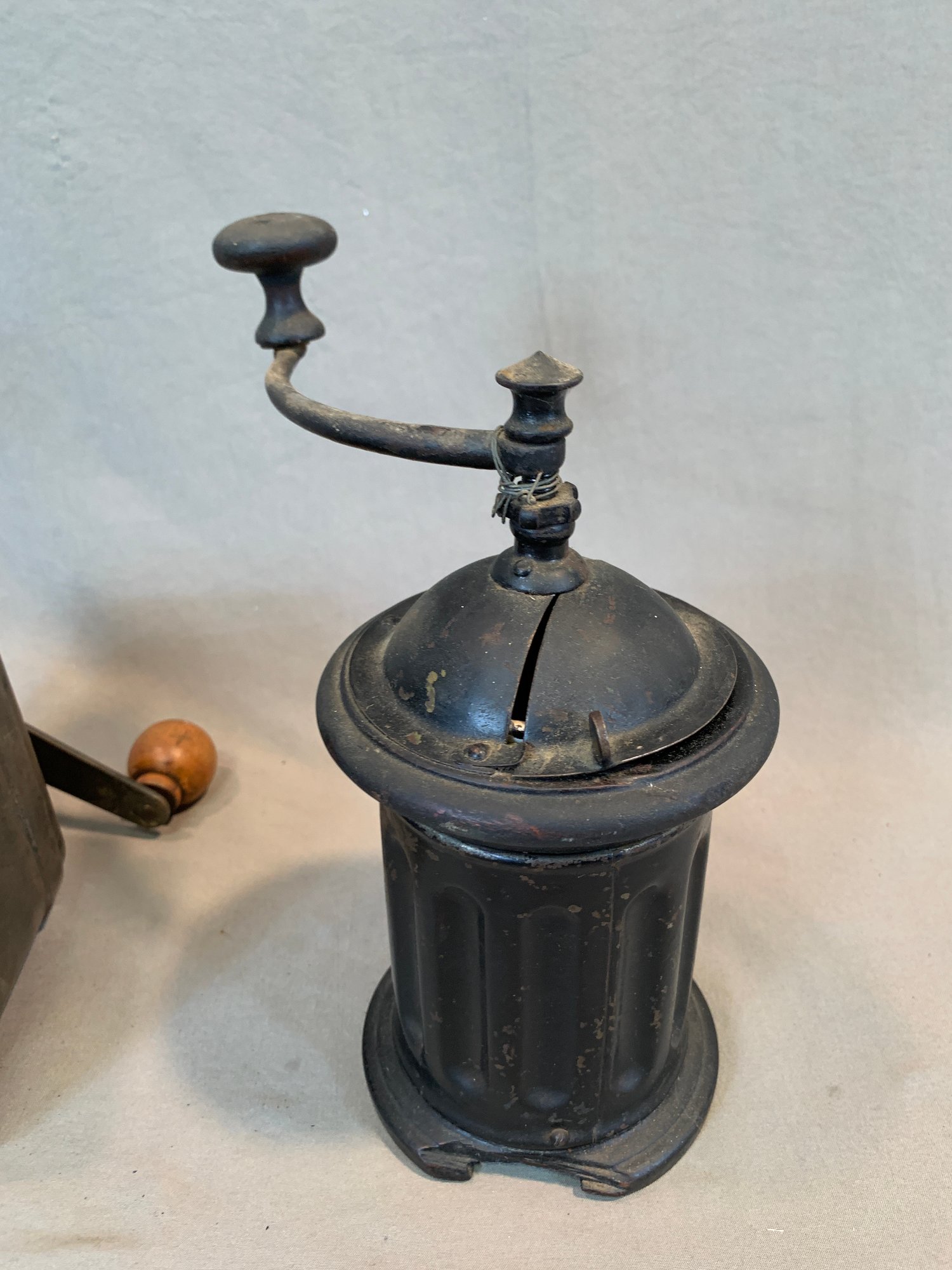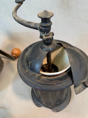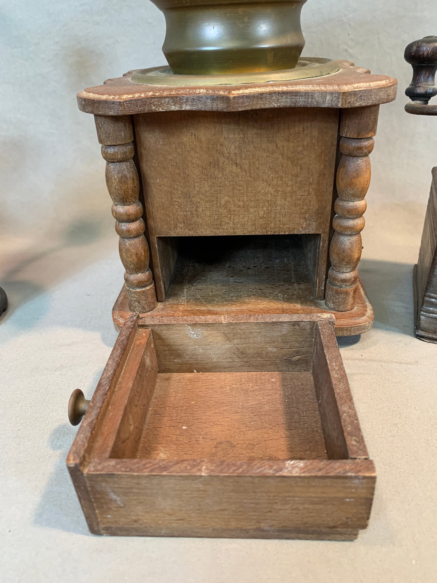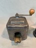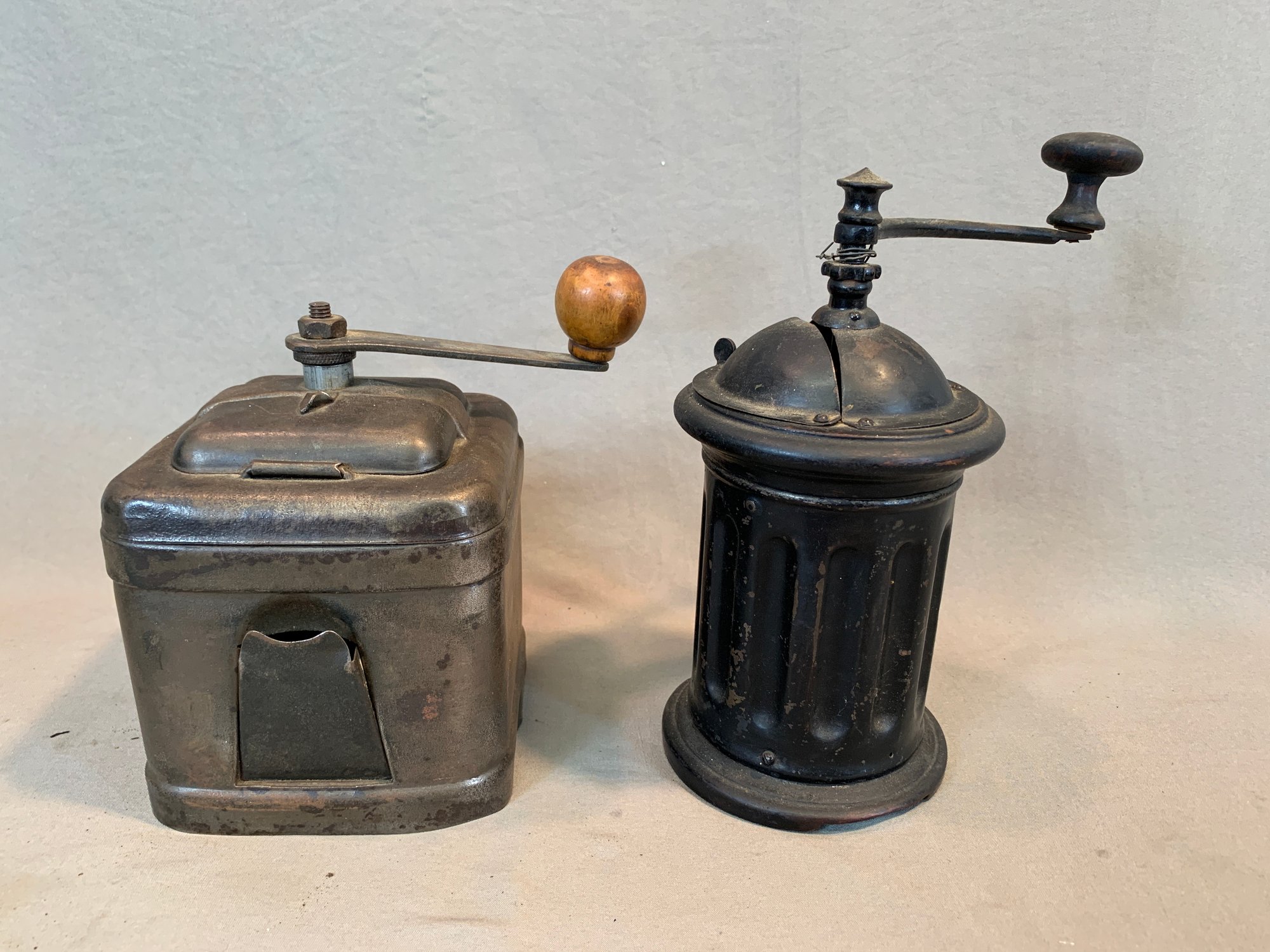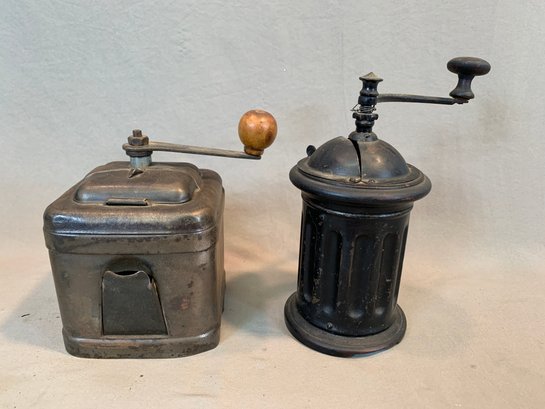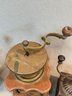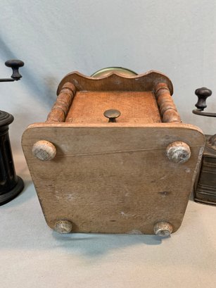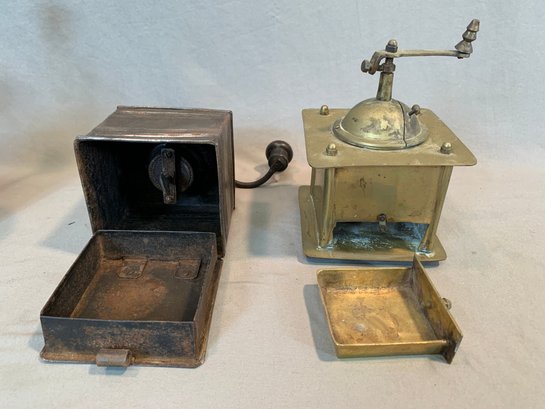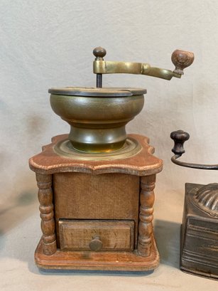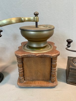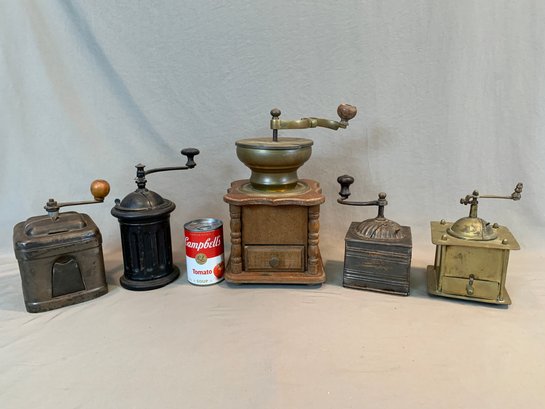 A collection of five antique European tabletop coffee grinders comprising a tin box grinder with side drawer and wooden knob handle (7" H); a pressed metal cylindrical grinder with column form, painted black (9" H); a large oak and brass table grinder with turned column supports, brass hopper, crank handle, and single drawer (12" H); a pressed metal box grinder with wooden knob (6.5" H); and a brass box grinder with drawer (7" H).