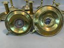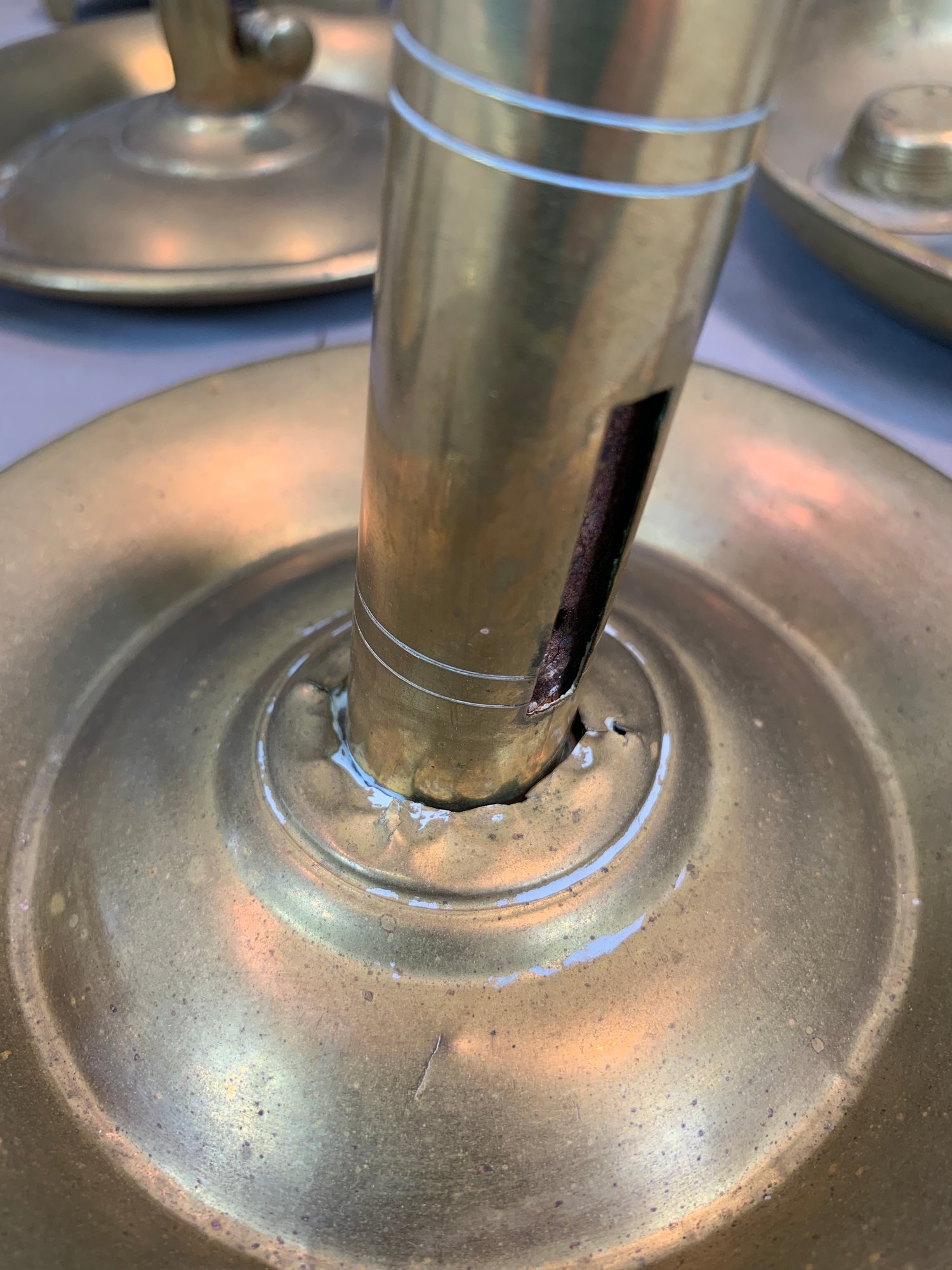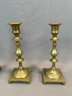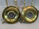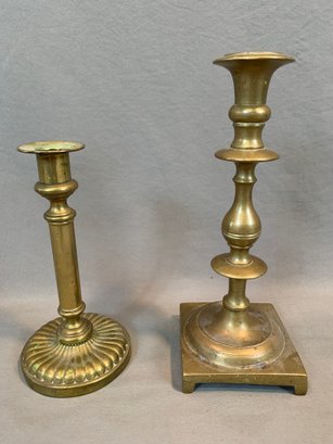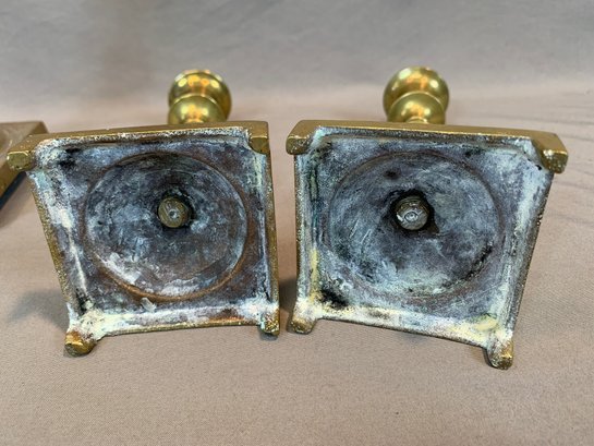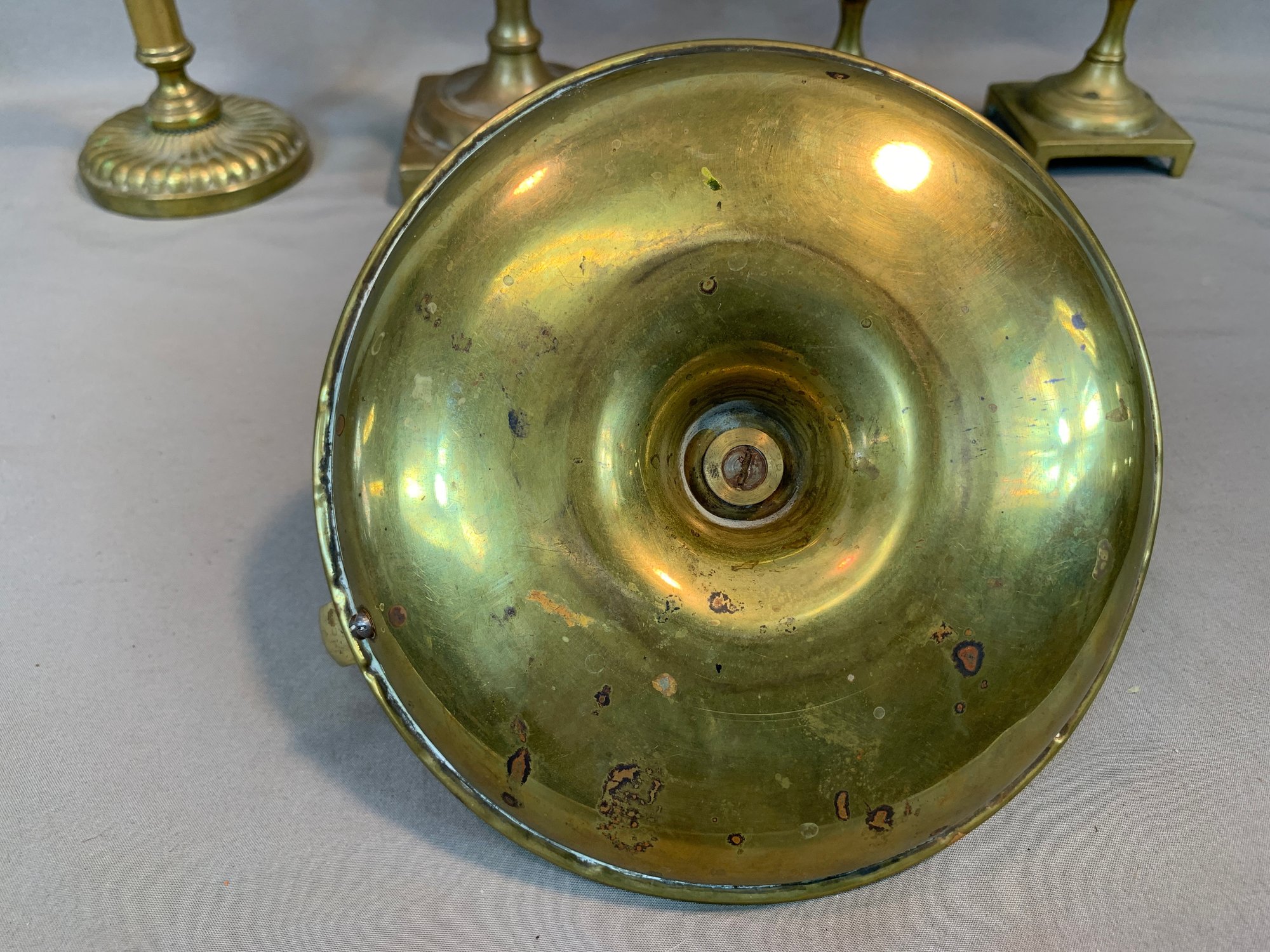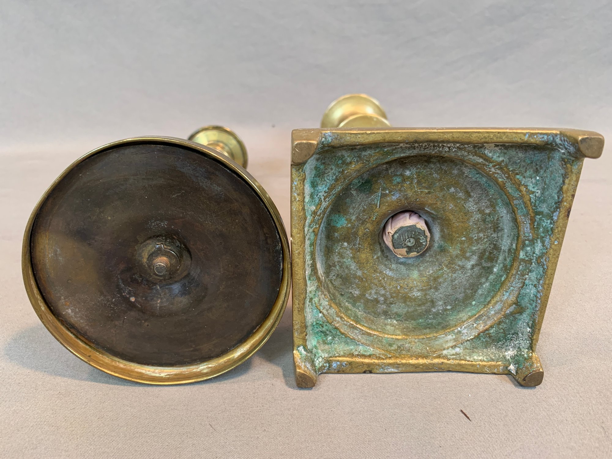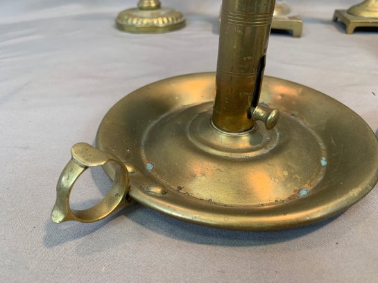 Condition: Good; one chamber stick is damaged at the base/stick, natural patina and wear throughout, verdigris to sockets, consistent with age and use