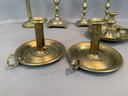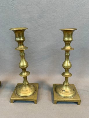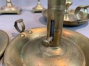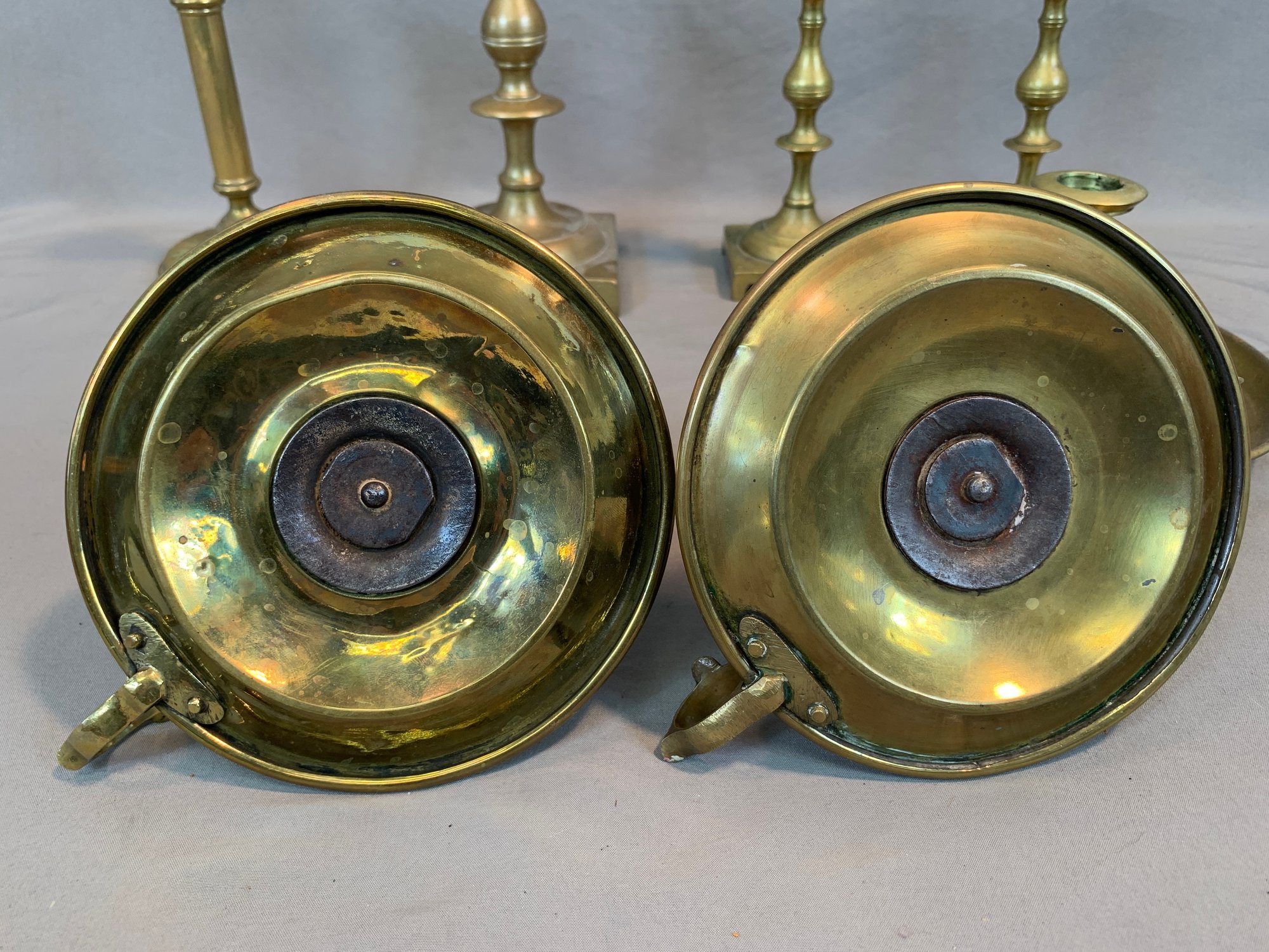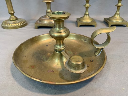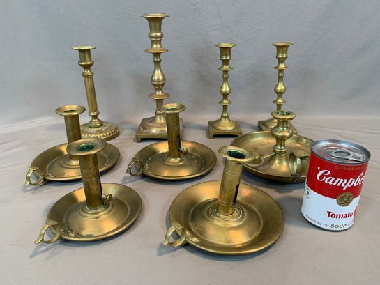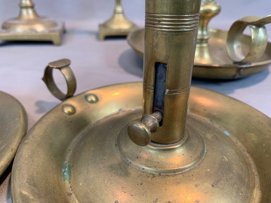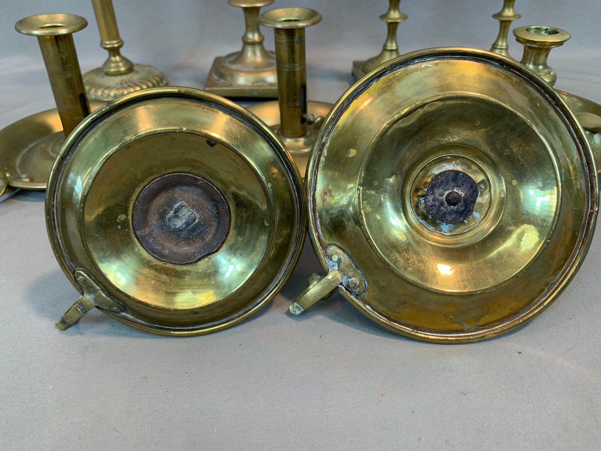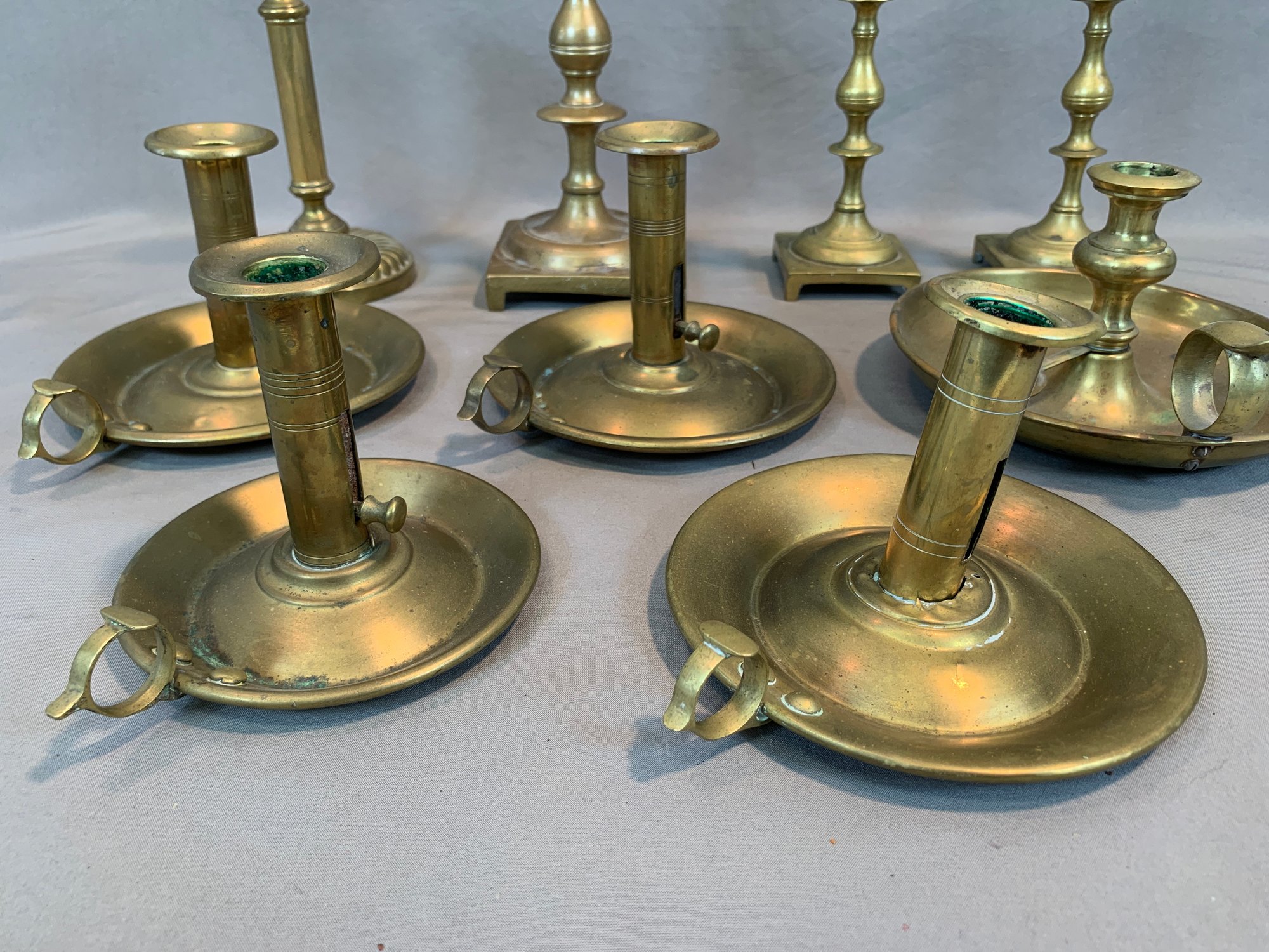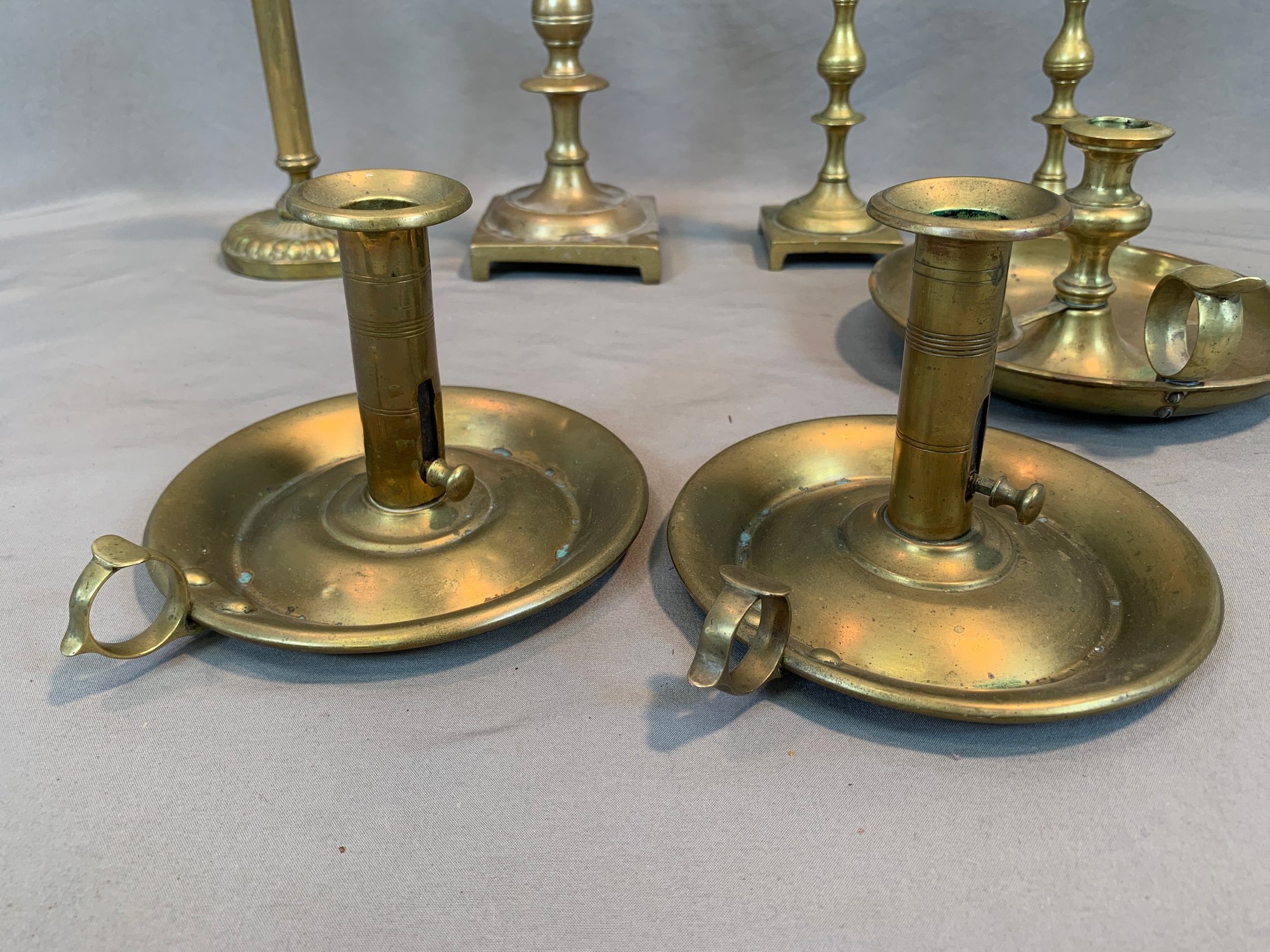 A collection of nine brass candleholders comprising several saucer-based chamber sticks with ring handles and push-up ejector mechanisms, a pair of baluster candlesticks on stepped square plinths with corner feet, and additional candlesticks of varying heights and form.