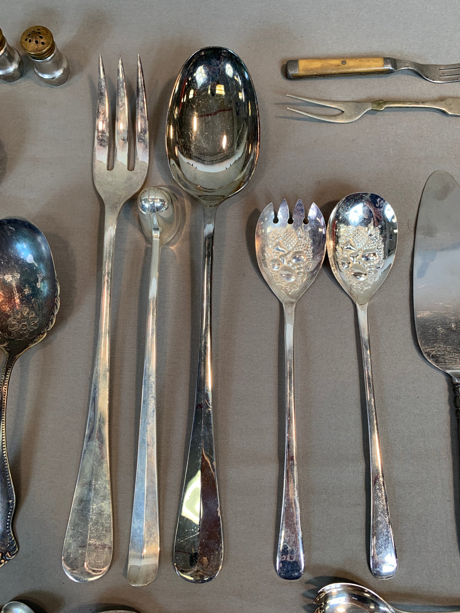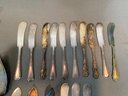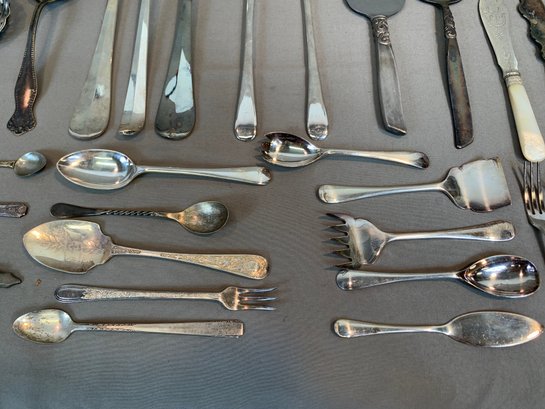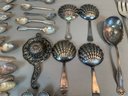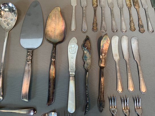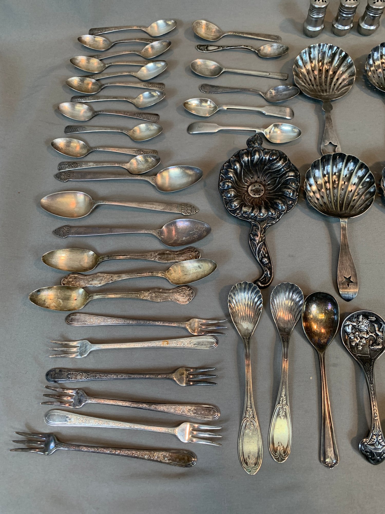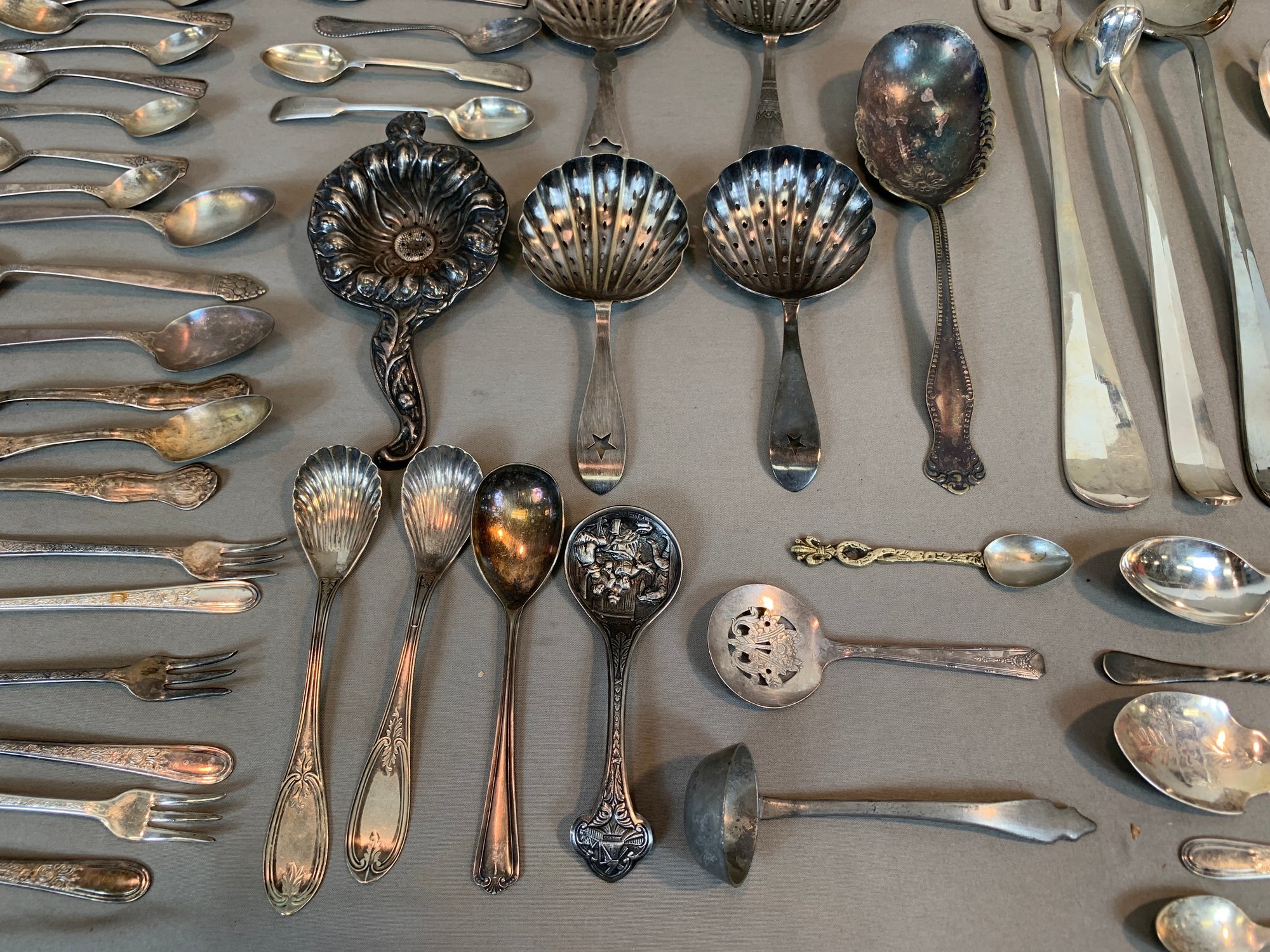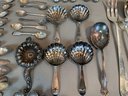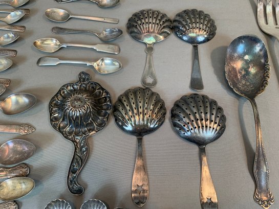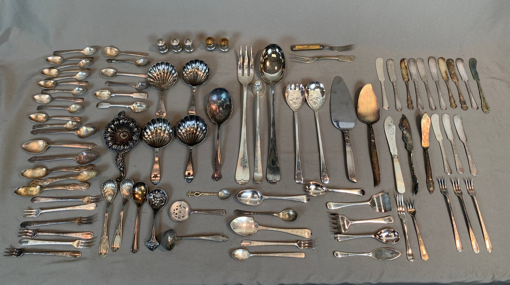 Including serving pieces, shrimp forks, tea strainers, butter knives, salt and peppers, tea spoons and other items, all in various patterns. Approximately 86 pieces in total.