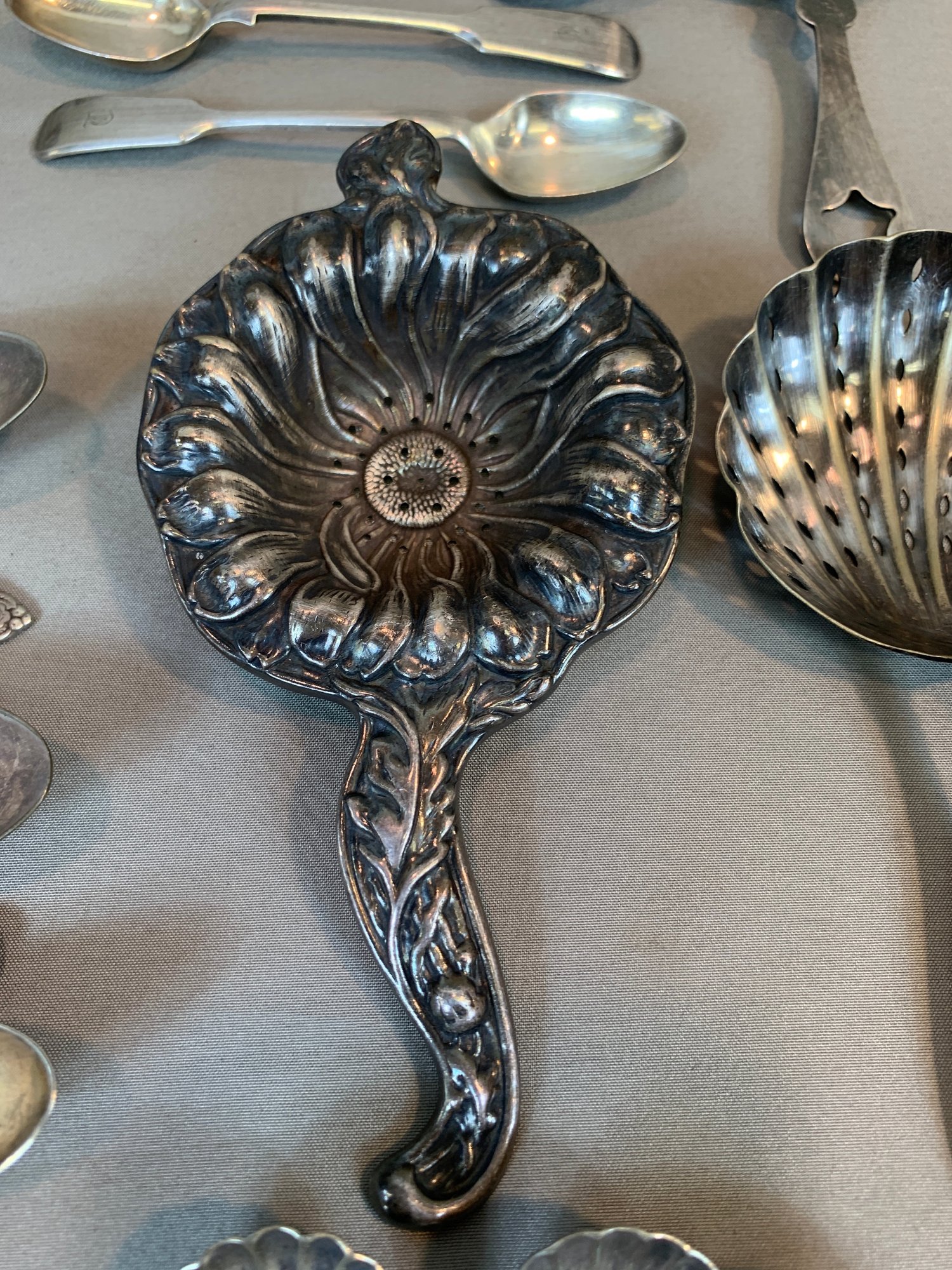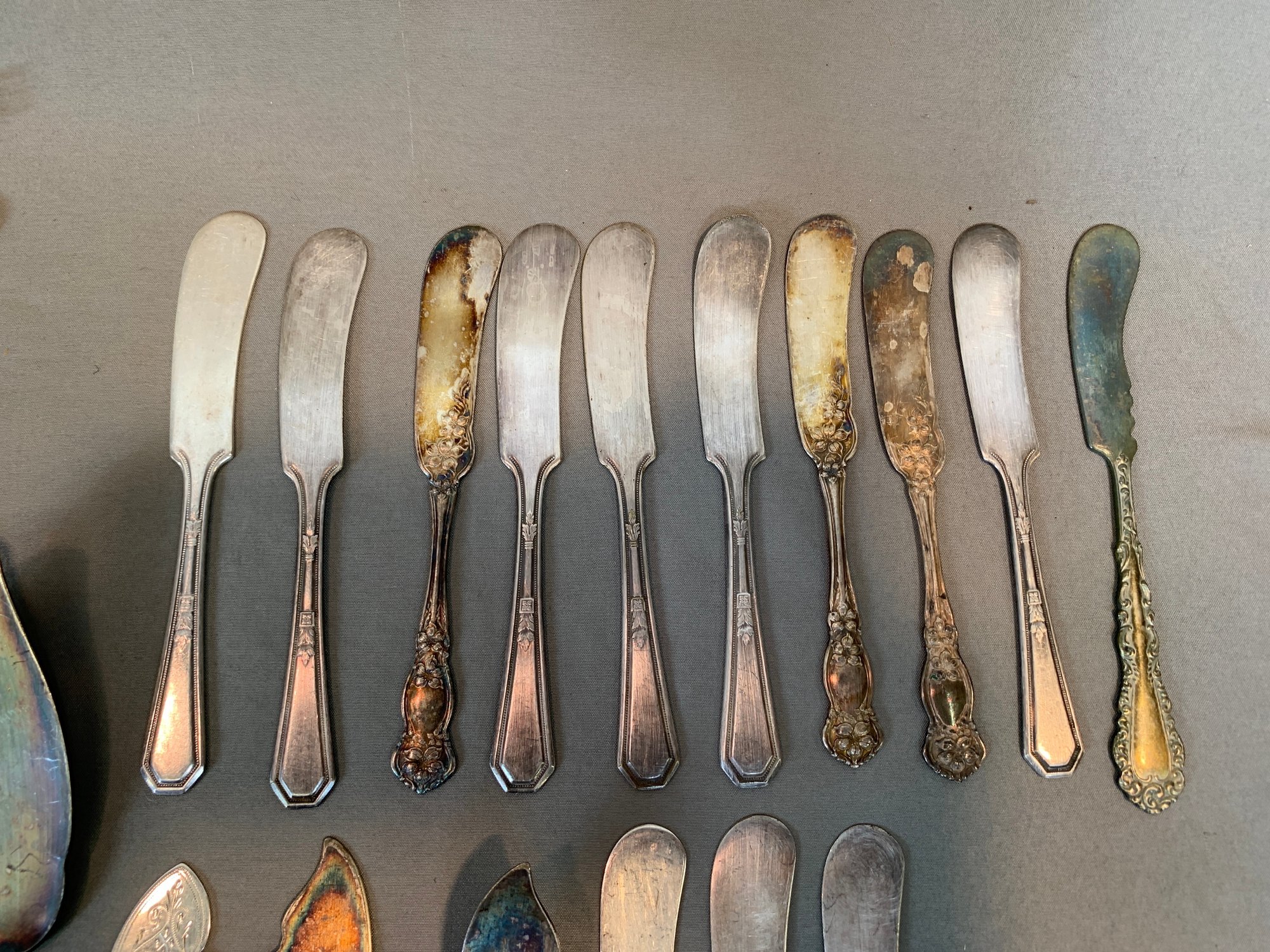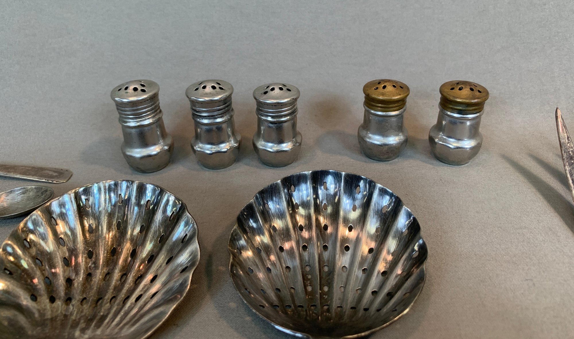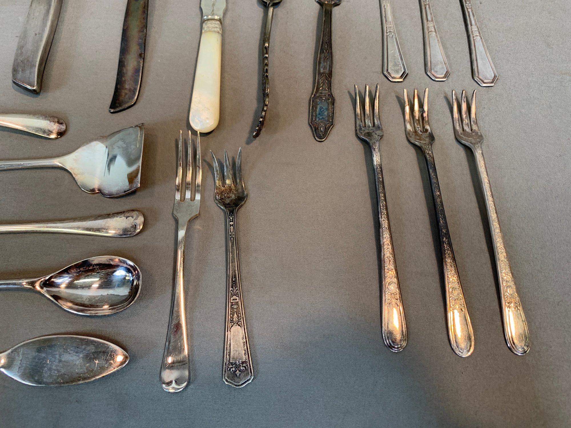 Including serving pieces, shrimp forks, tea strainers, butter knives, salt and peppers, tea spoons and other items, all in various patterns. Approximately 86 pieces in total.