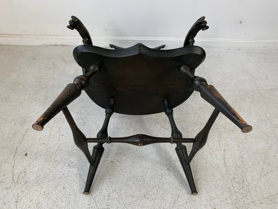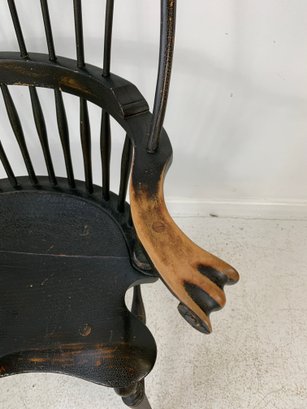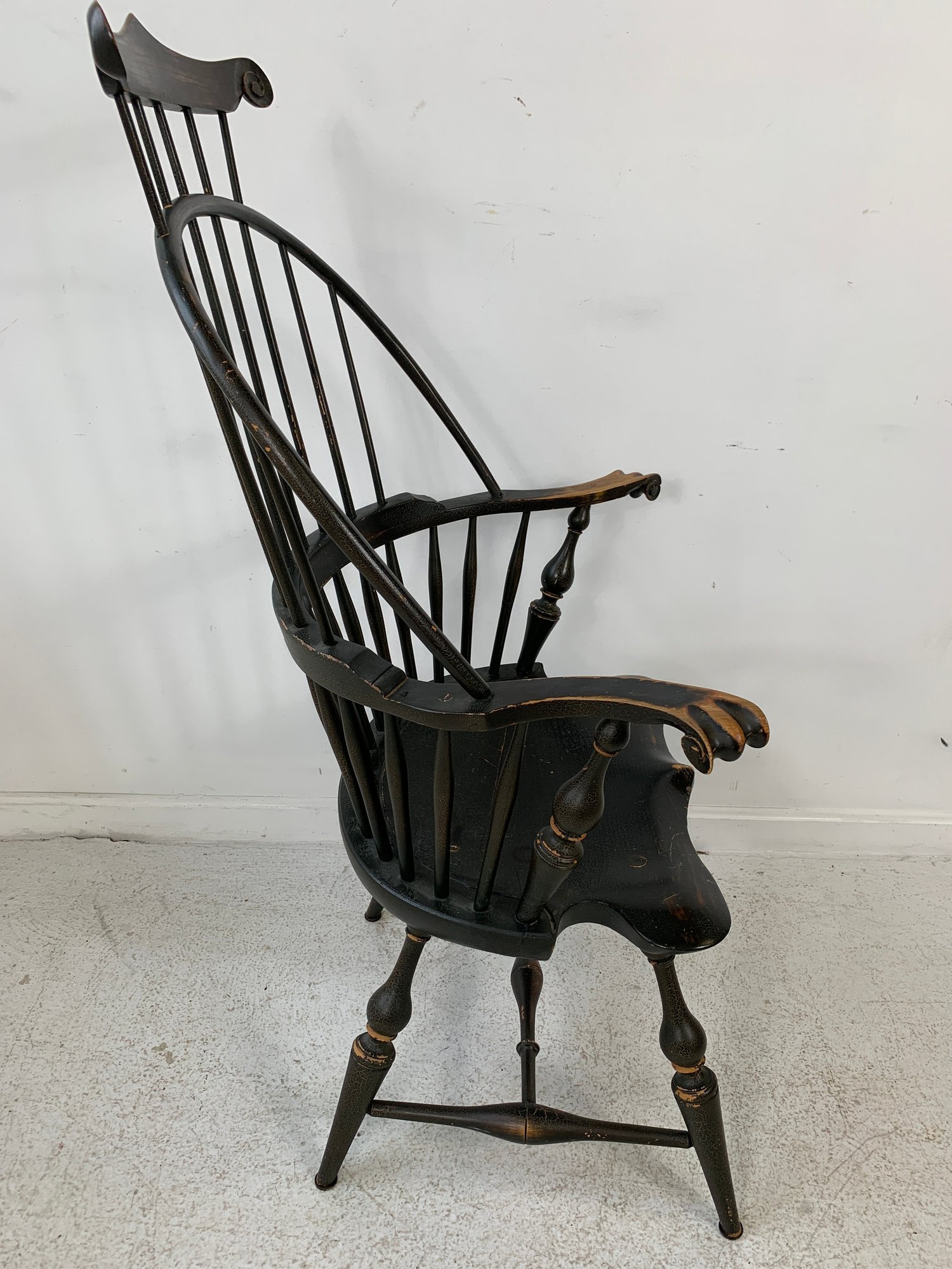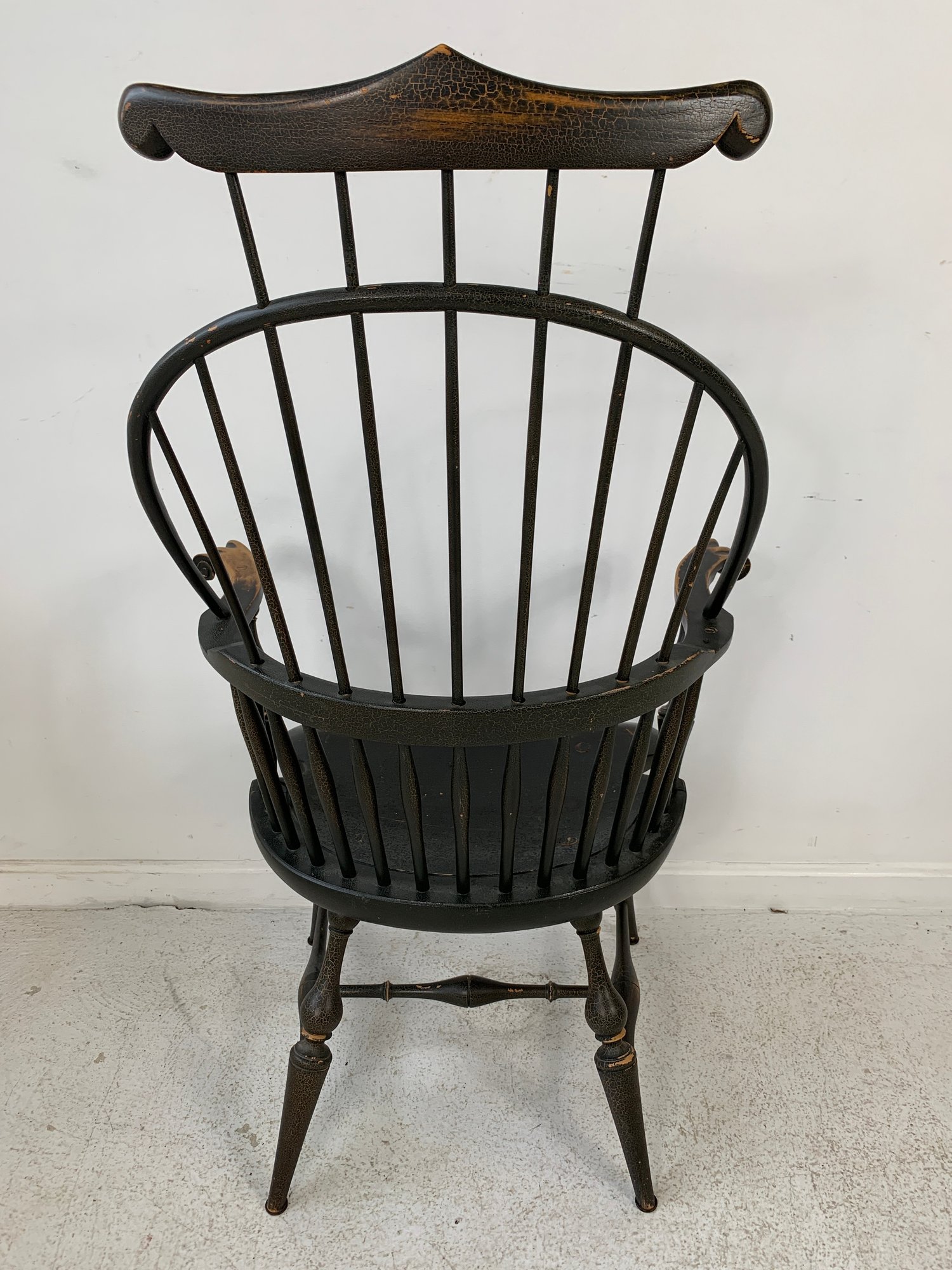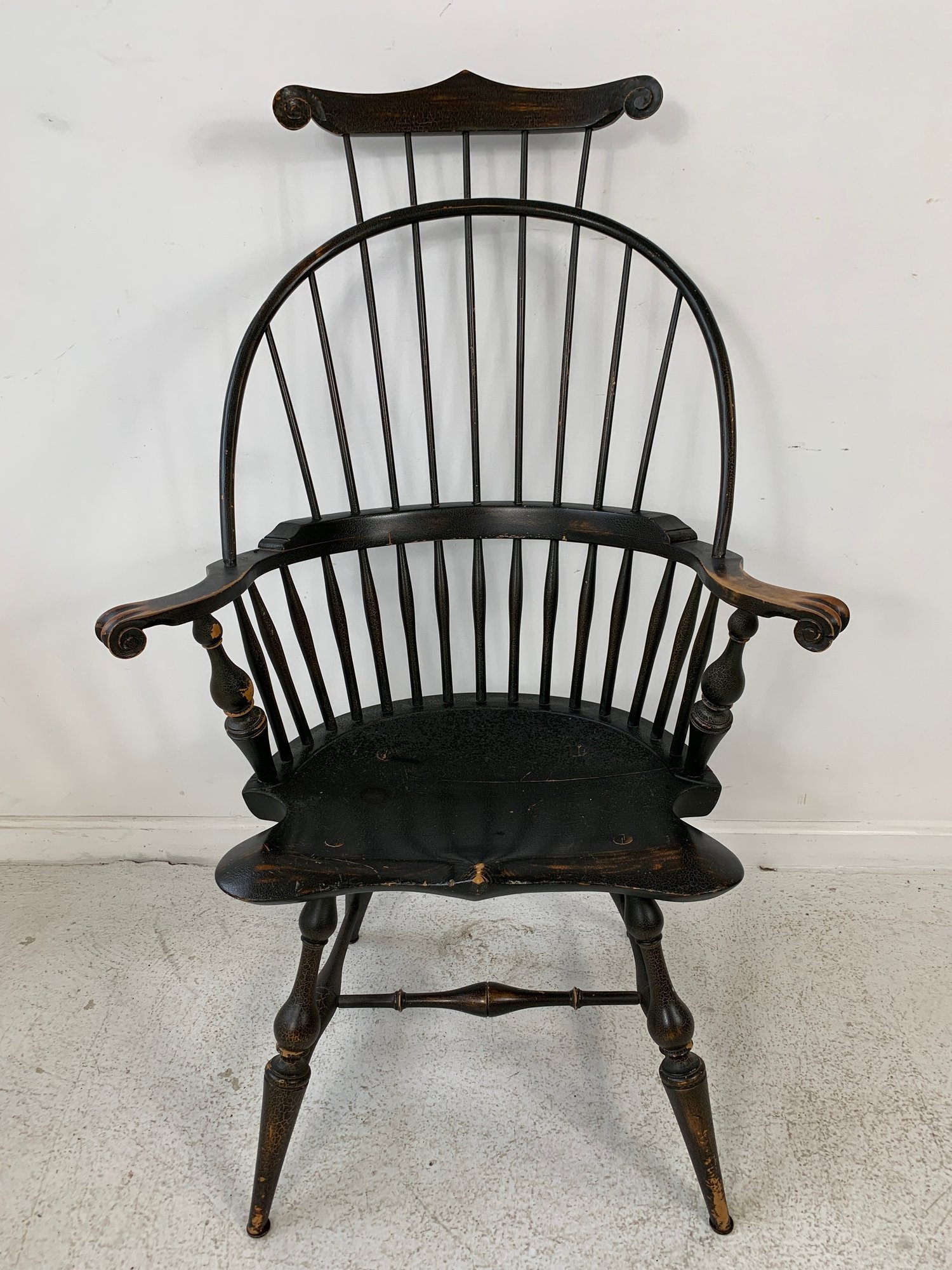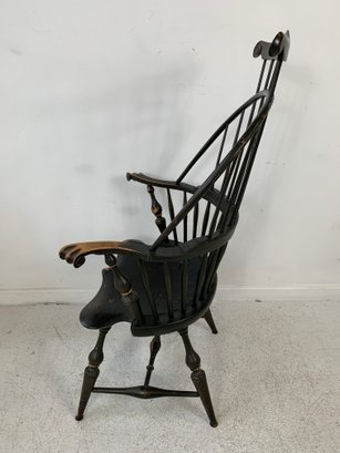 D.R. Dimes ebonized comb back Windsor armchair with scrolled crest rail, curved hoop back, spindle back, shaped saddle seat, scrolled arms, turned legs and stretchers. A high quality American reproduction Windsor in the Philadelphia style with desirable distressed black painted finish.