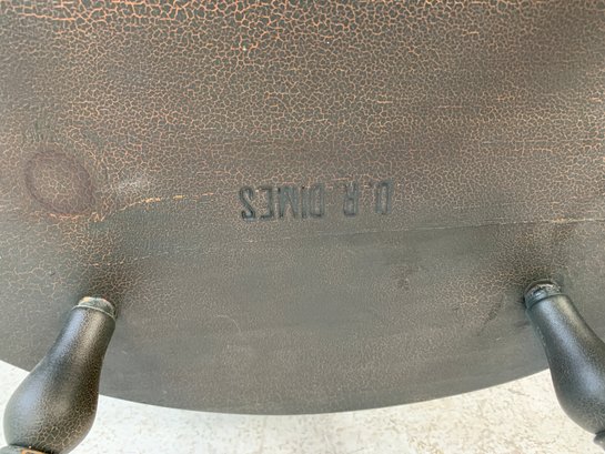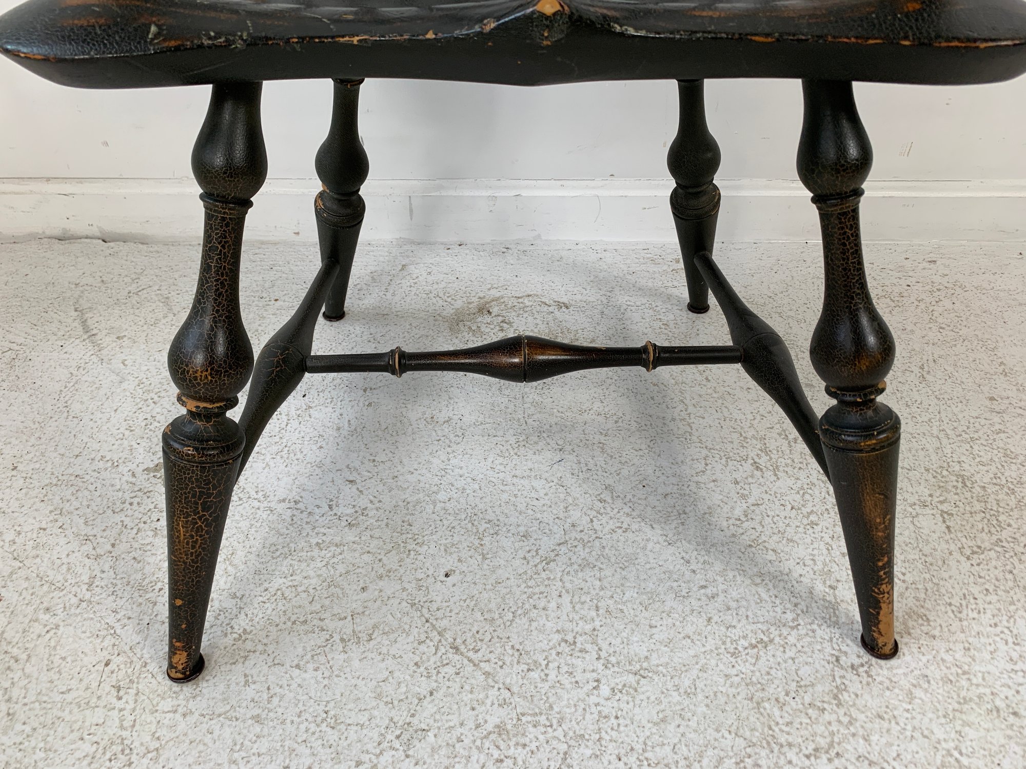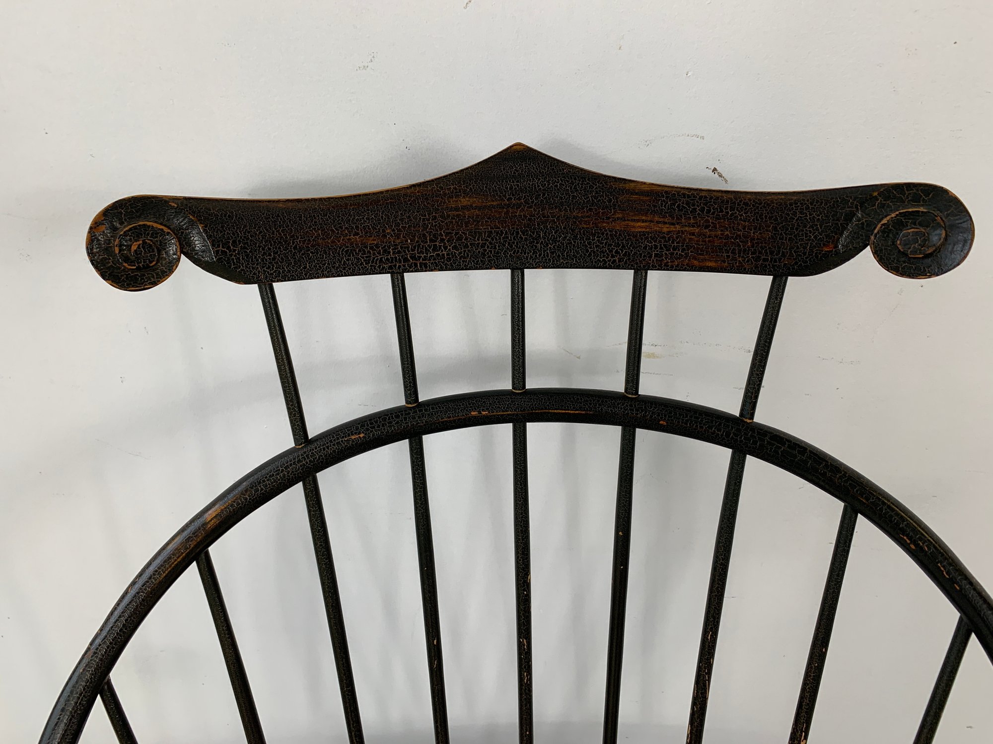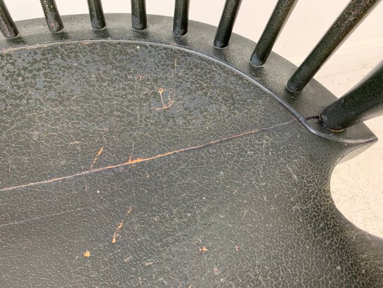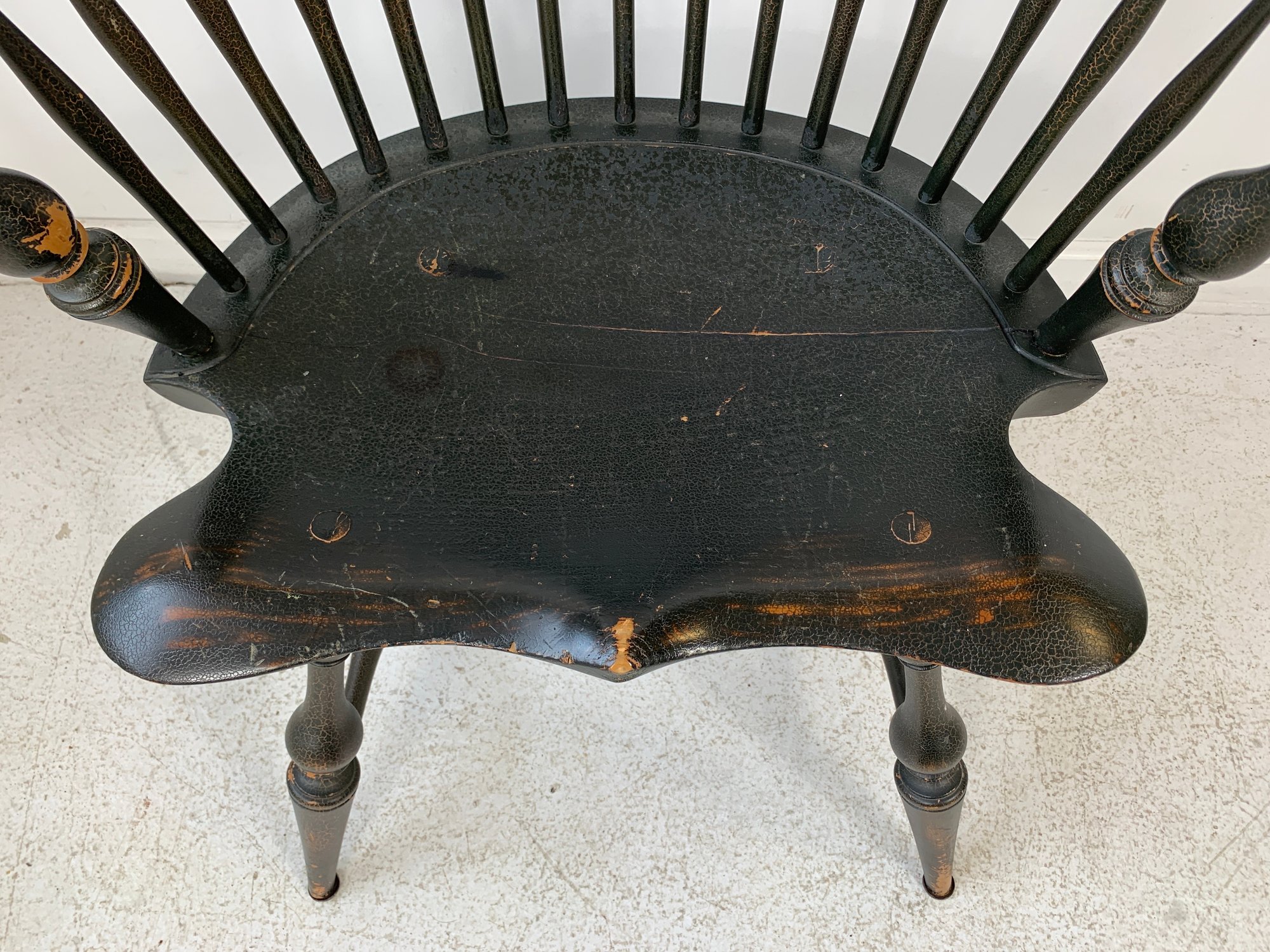 D.R. Dimes ebonized comb back Windsor armchair with scrolled crest rail, curved hoop back, spindle back, shaped saddle seat, scrolled arms, turned legs and stretchers. A high quality American reproduction Windsor in the Philadelphia style with desirable distressed black painted finish.