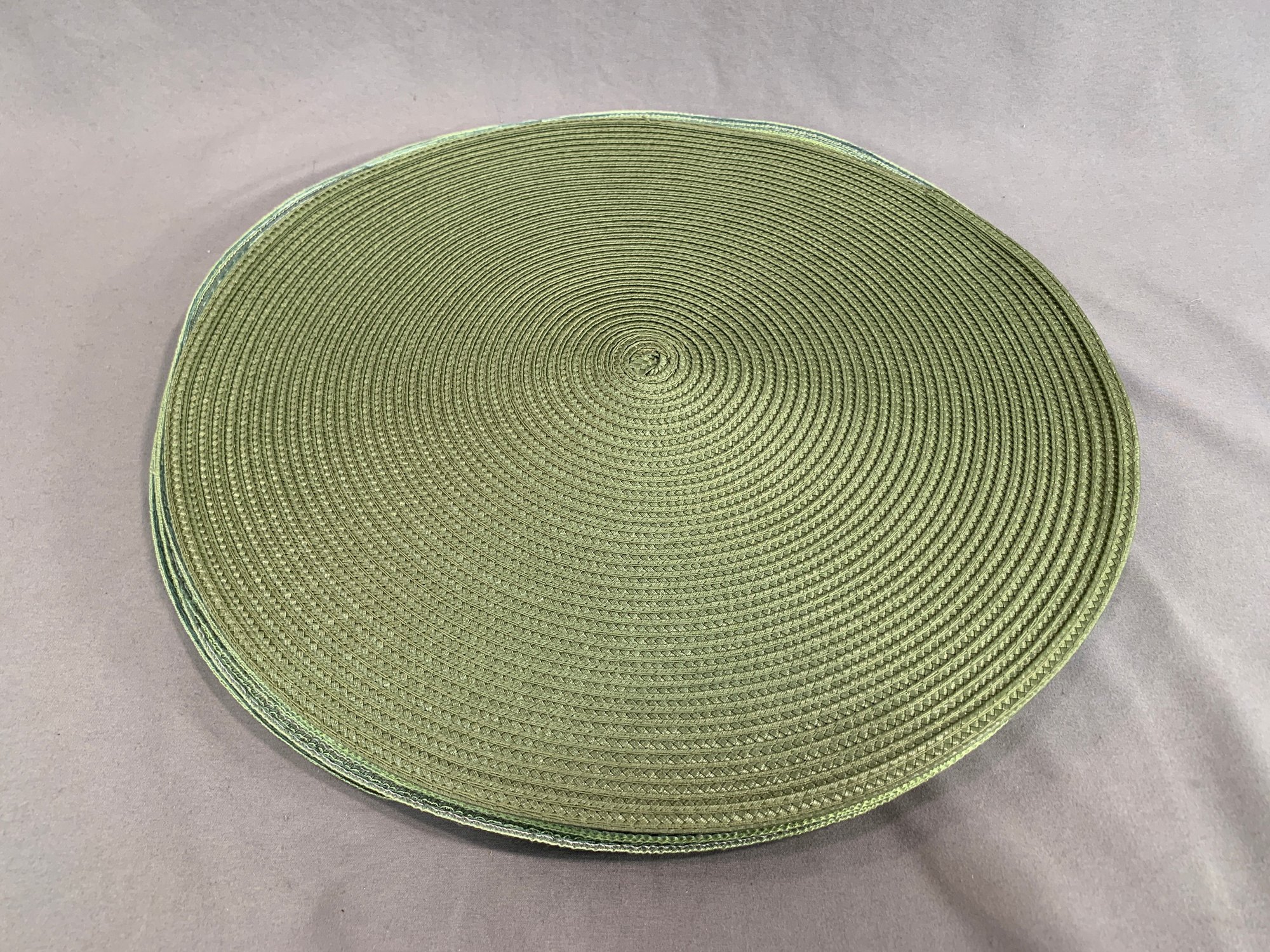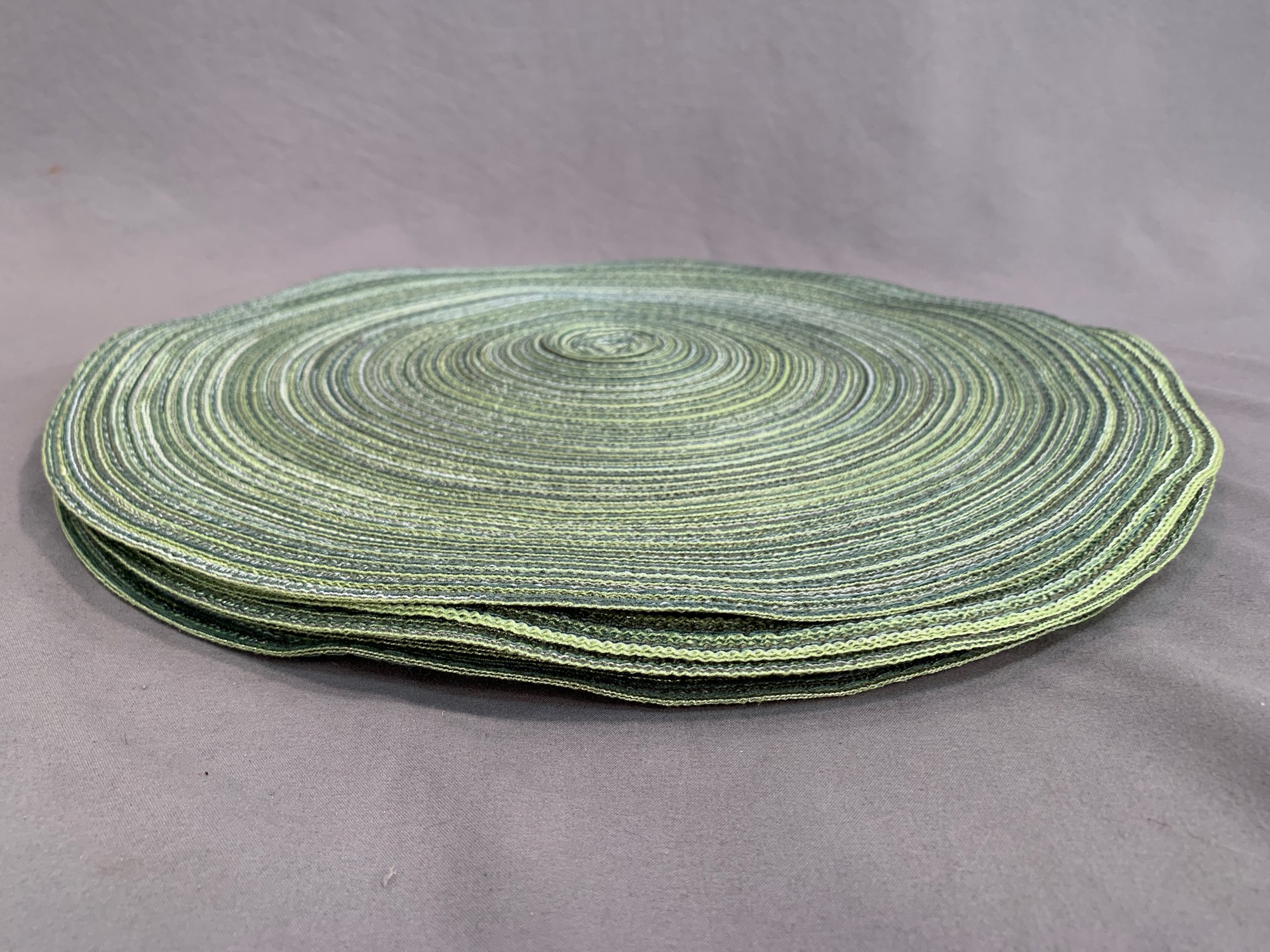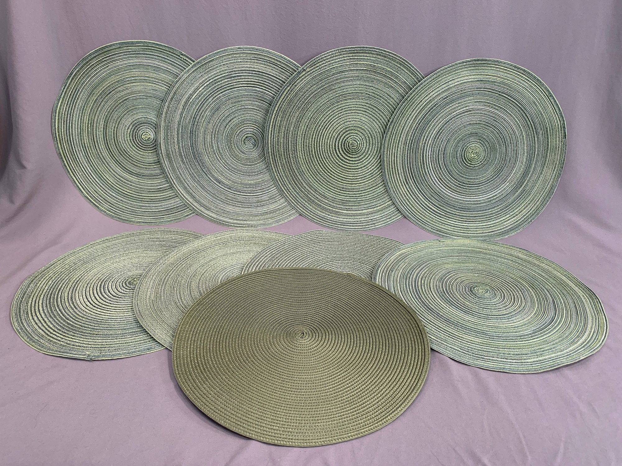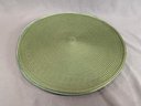 Lot Of 8 Lime Green Round Woven Placemats, one is a natural green.