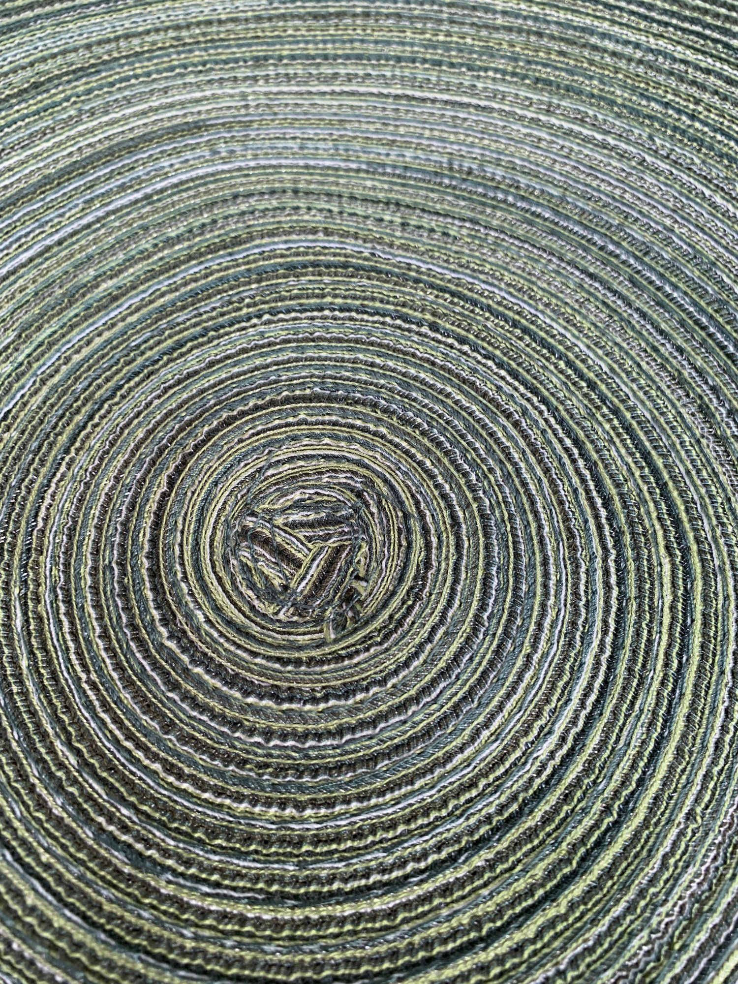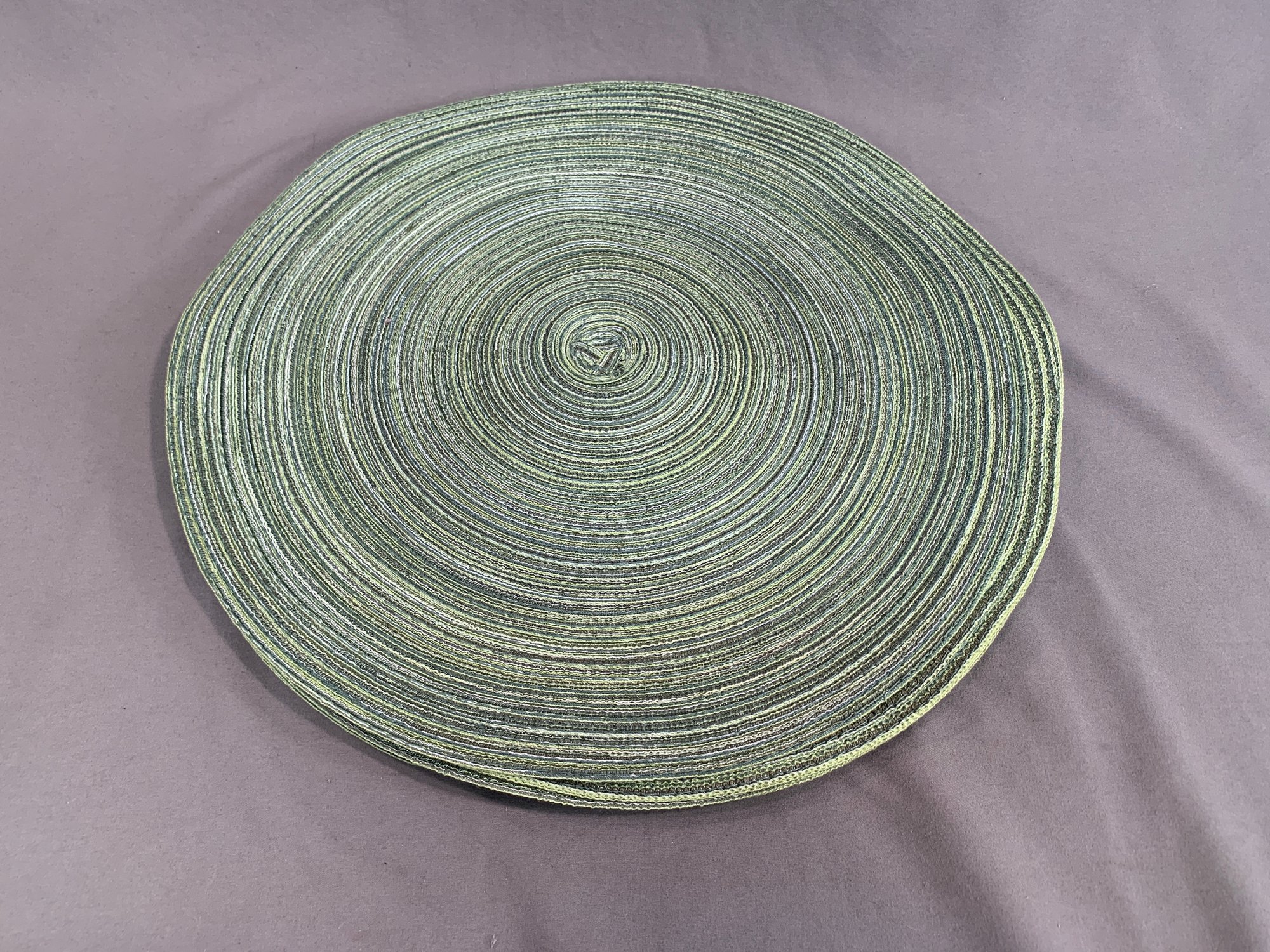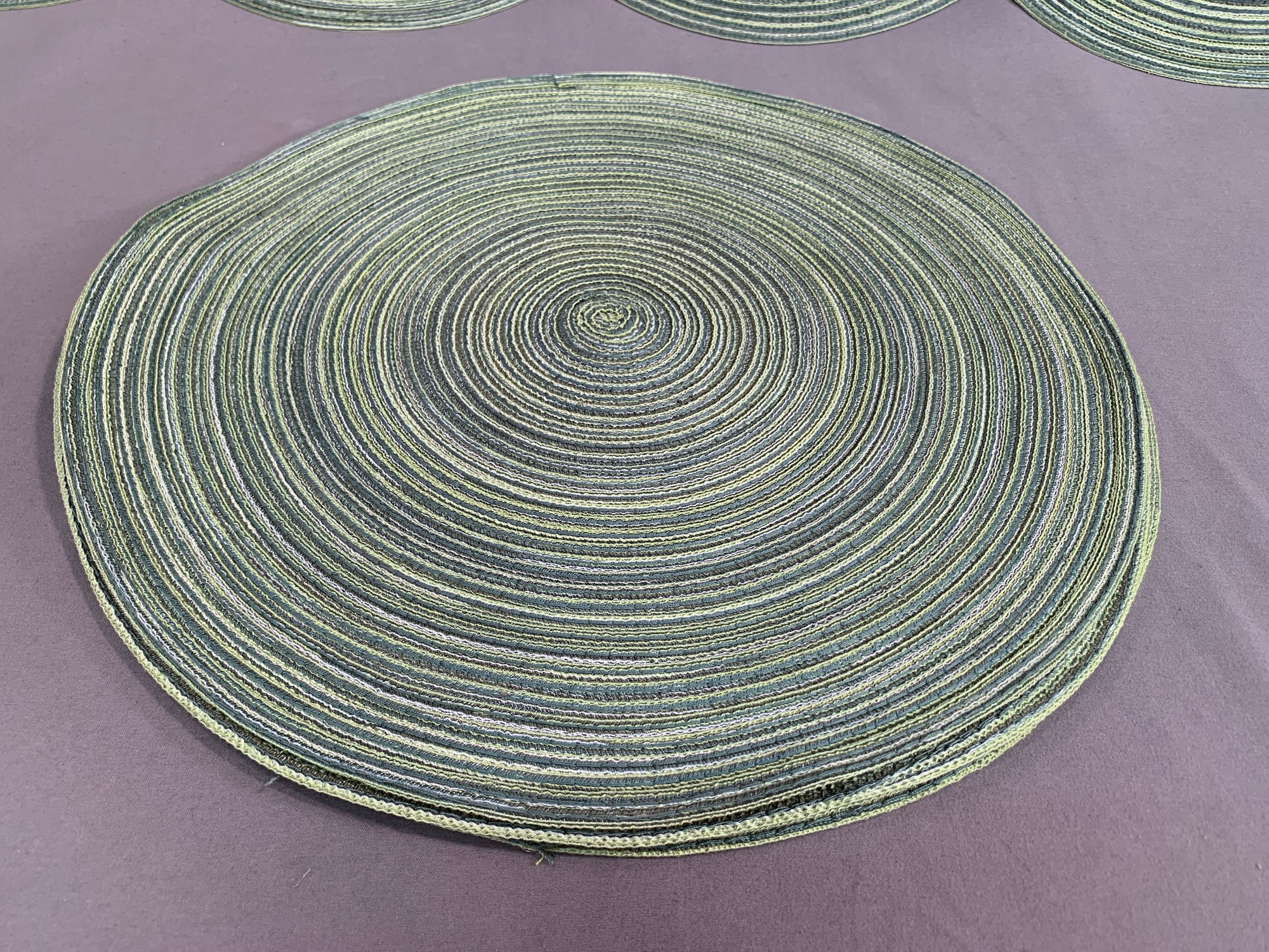 Lot Of 8 Lime Green Round Woven Placemats, one is a natural green.