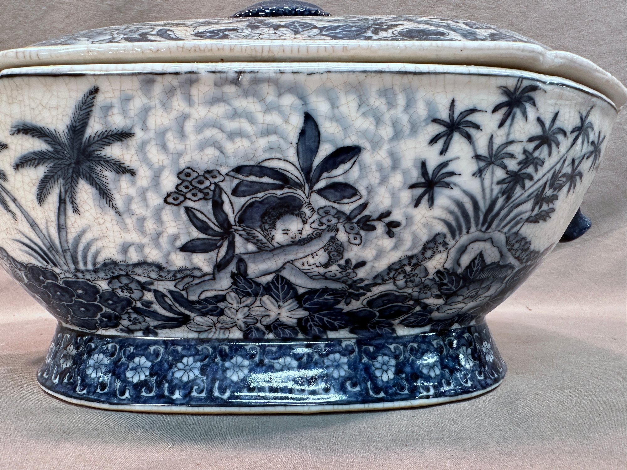 Blue and White hand painted with floral and cherub motif, 2 sculpted handles, stamped on the bottom .