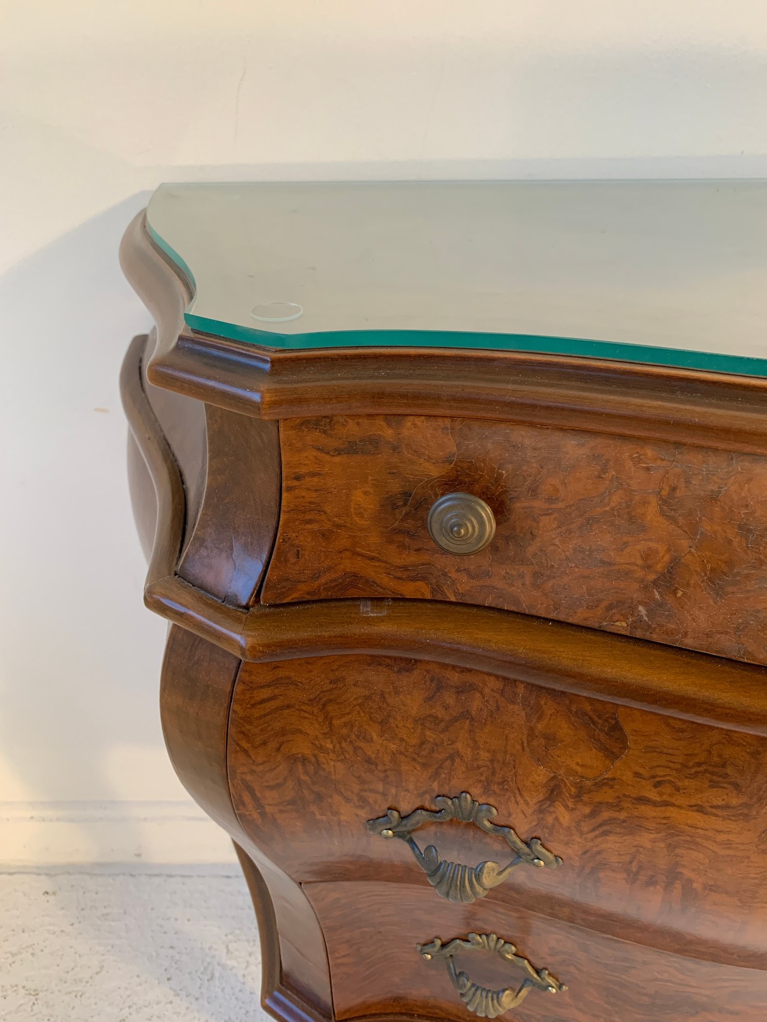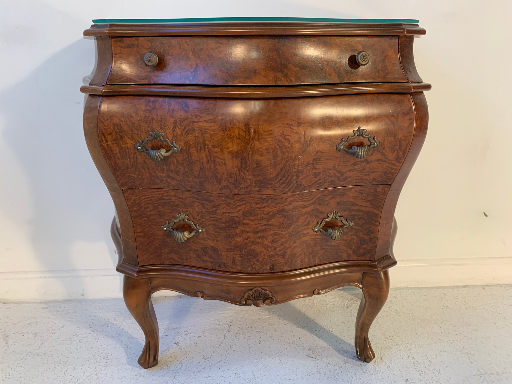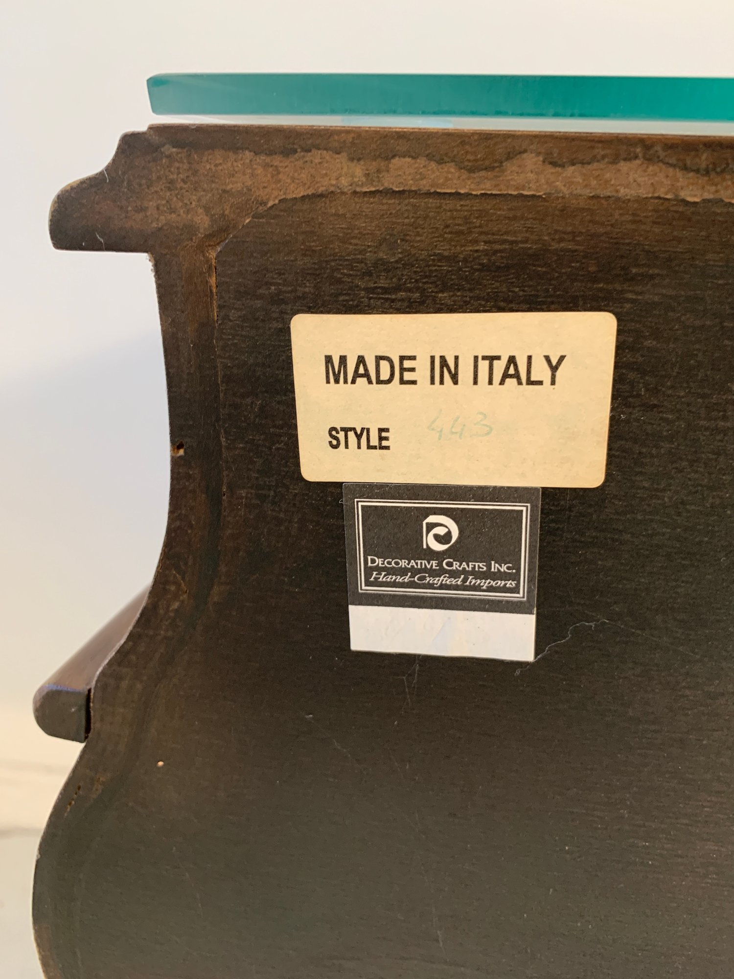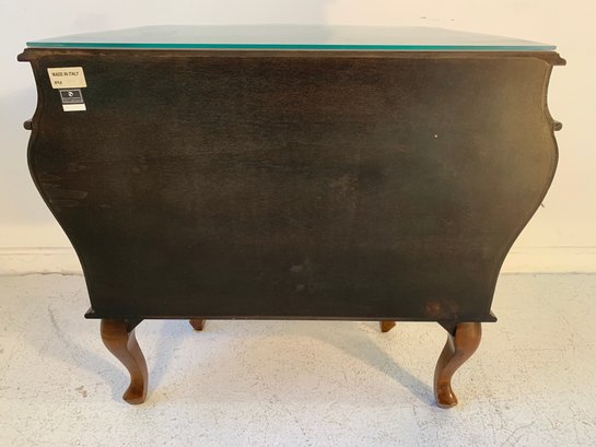 With shell crest design, metal drawer pulls, and fitted glass top. Labeled Made in Italy for Decorative Crafts. Elegant petite bombe silhouette perfect for upscale interiors, entryways, or bedside use.