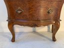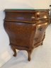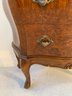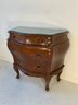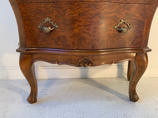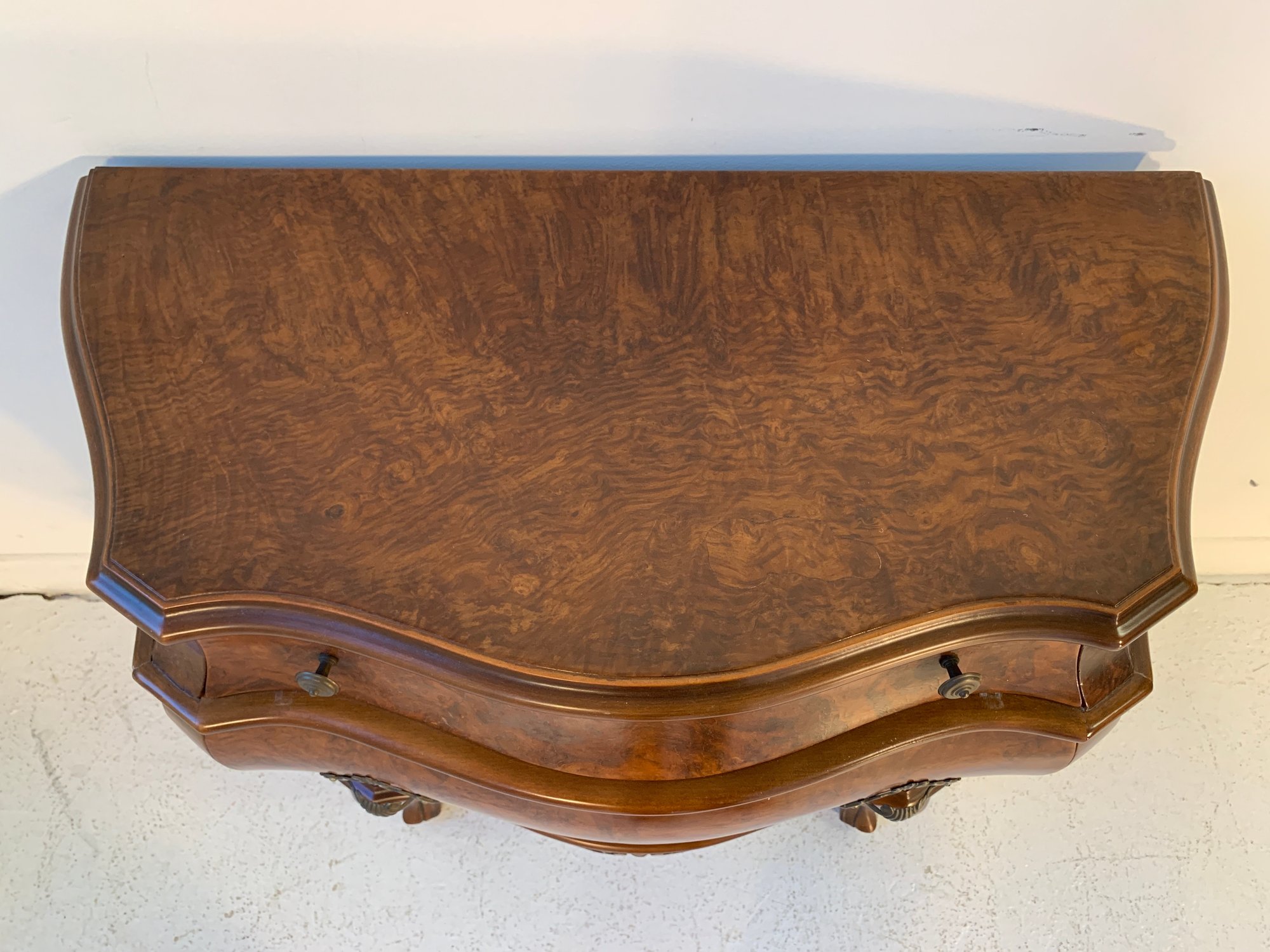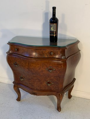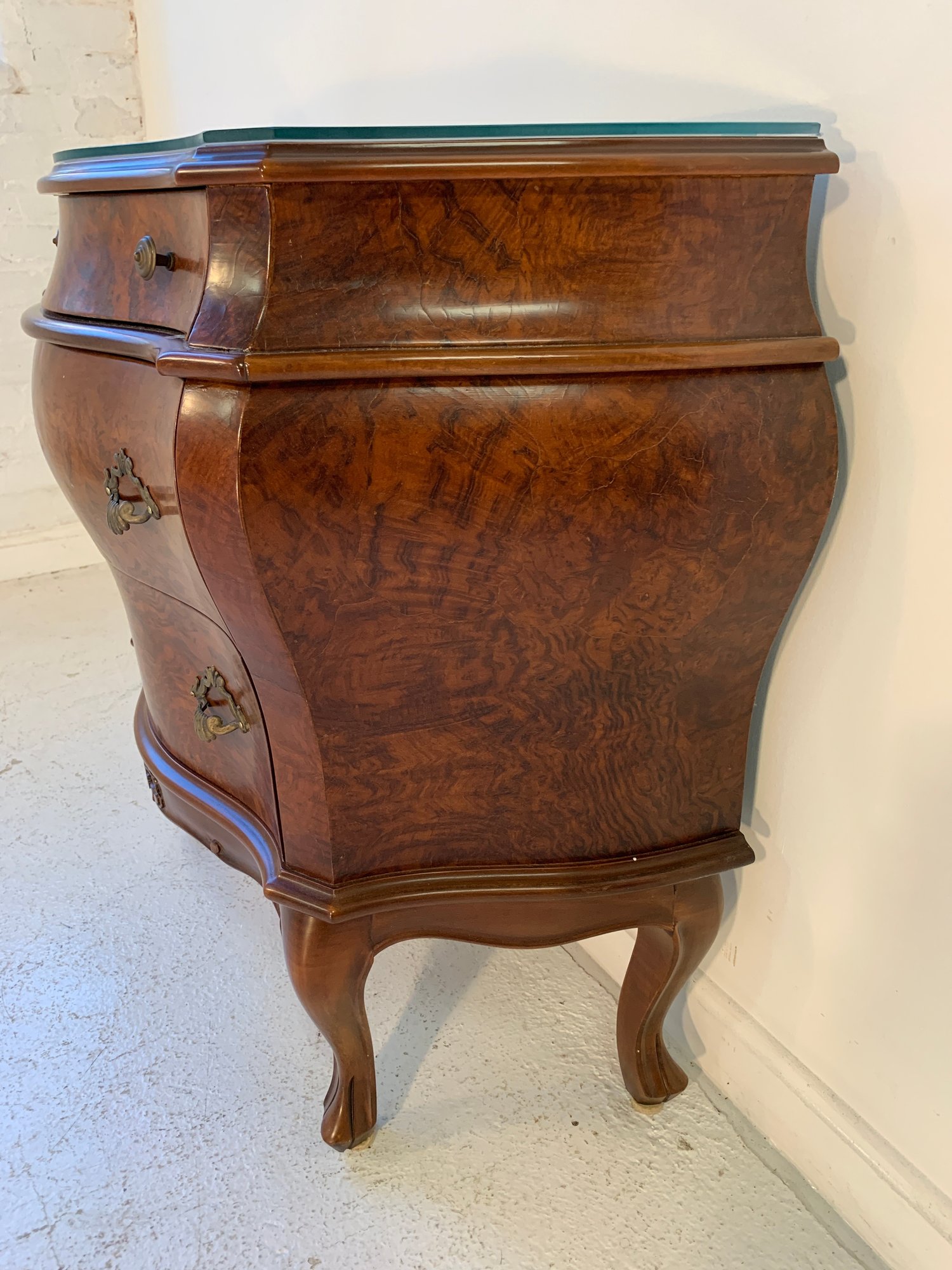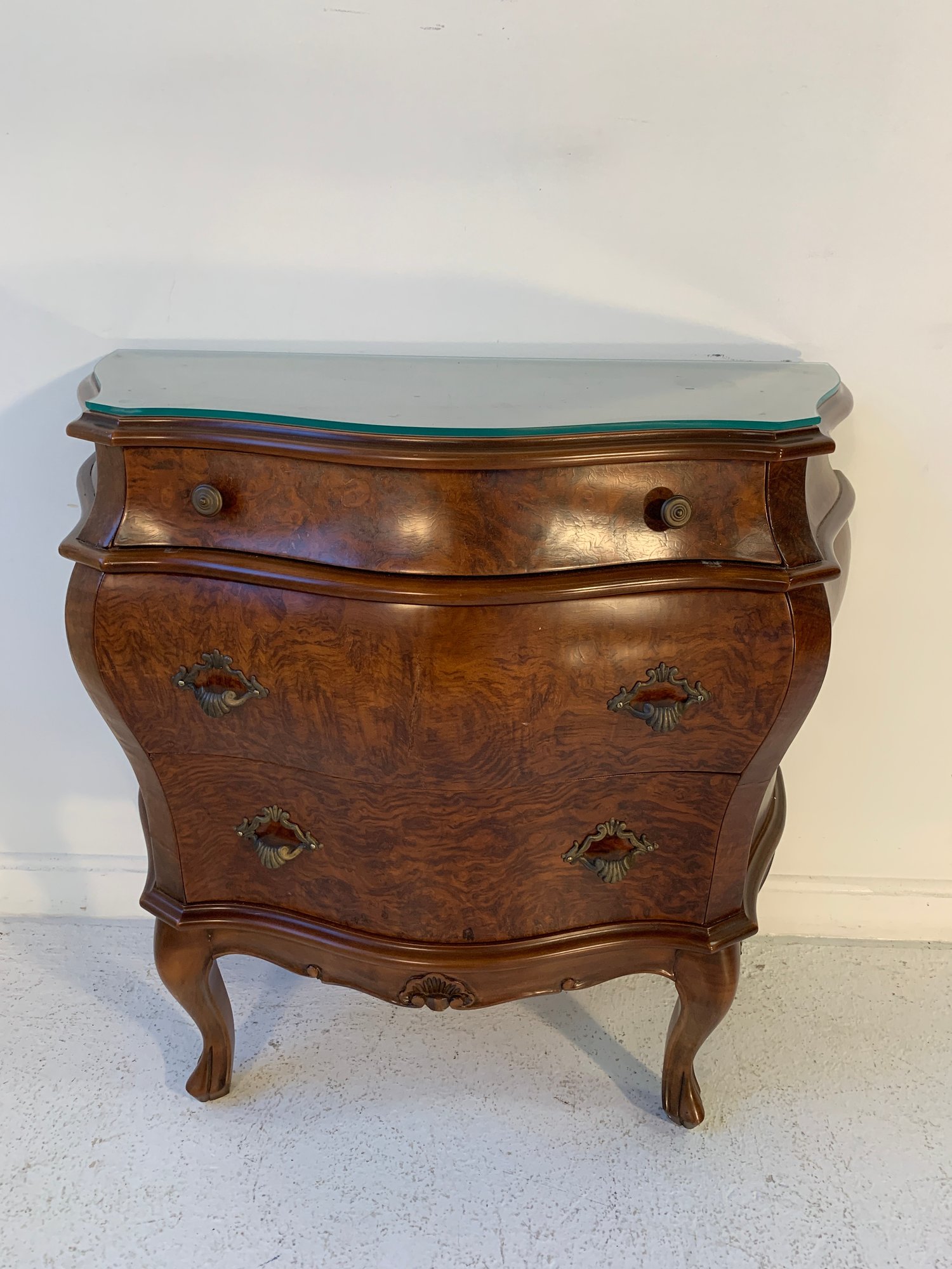 With shell crest design, metal drawer pulls, and fitted glass top. Labeled Made in Italy for Decorative Crafts. Elegant petite bombe silhouette perfect for upscale interiors, entryways, or bedside use.