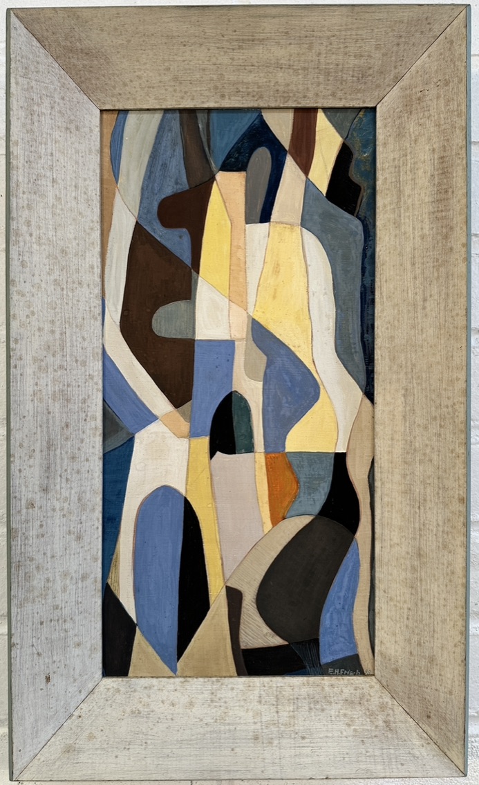 A modernist geometric abstract composition. Oil on artist board, in white painted frame.