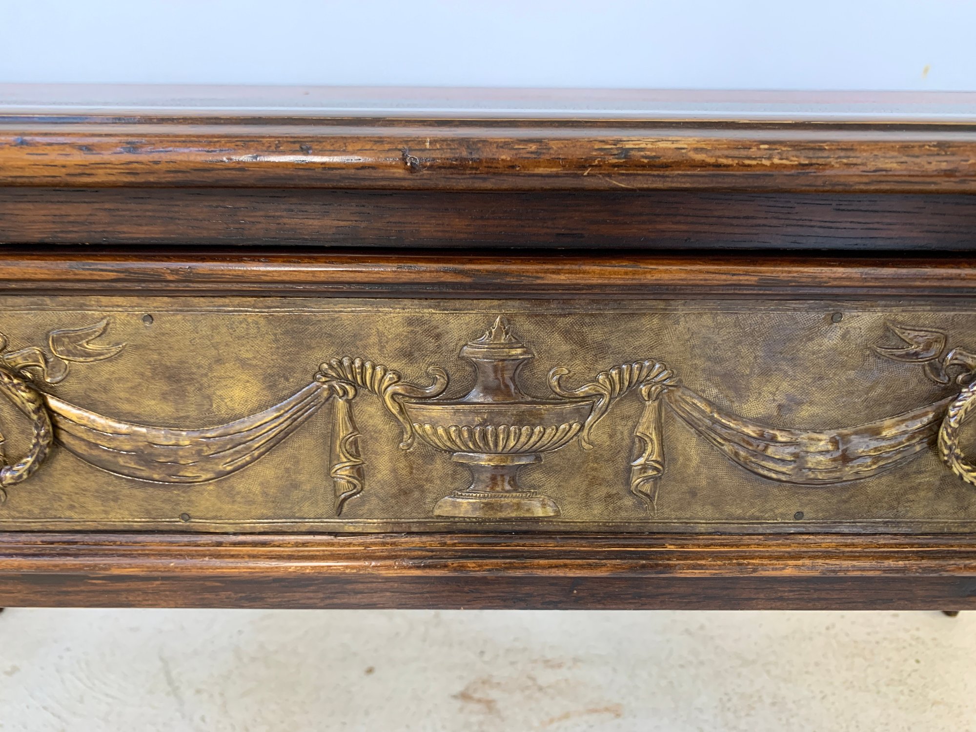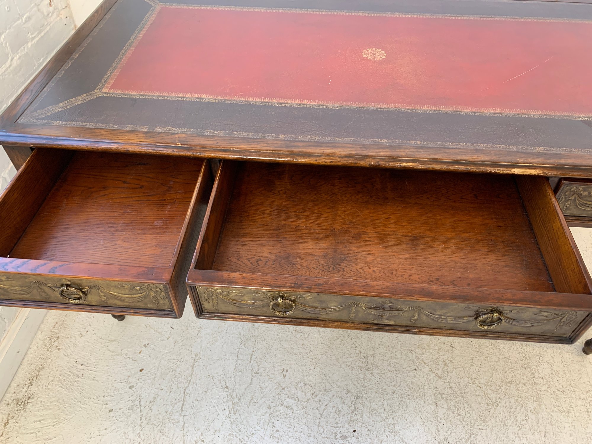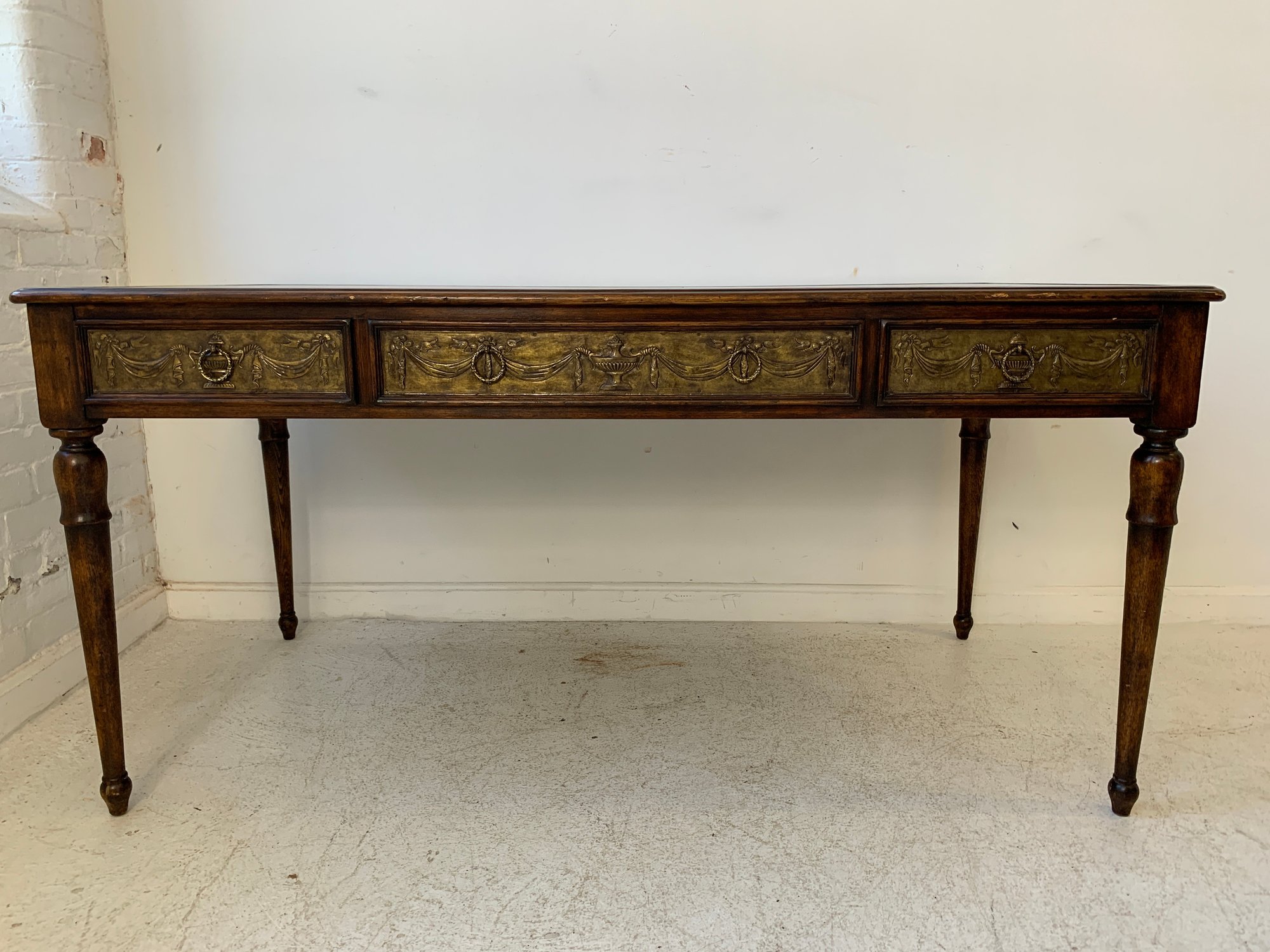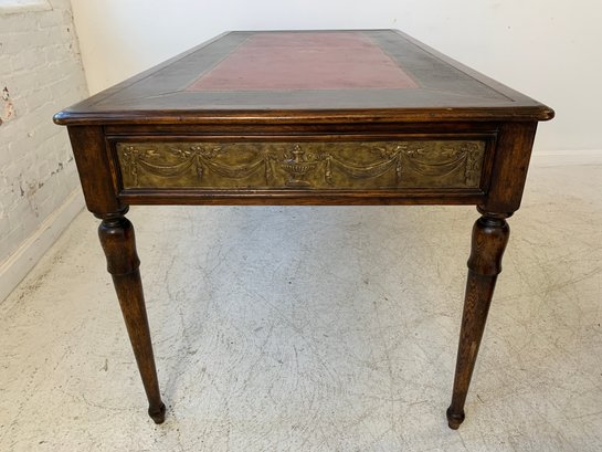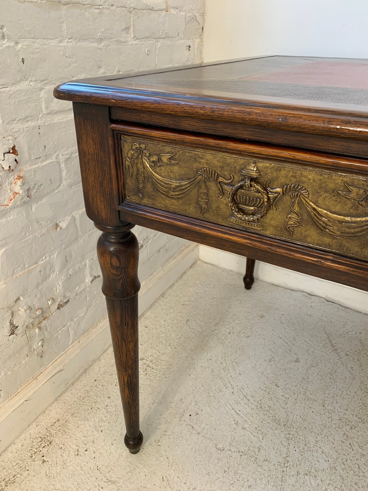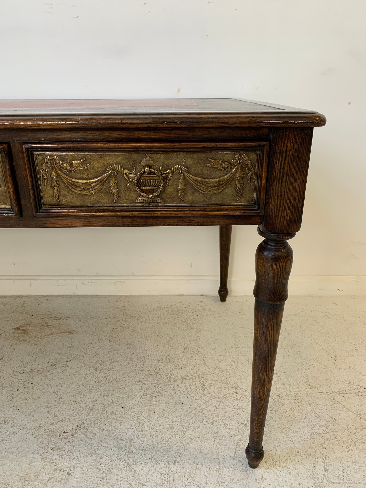 A freestanding oak library table with a two-tone red and black leather top, gold-tooled with foliate borders and a central rosette medallion. Fitted with three drawers to the front, the entire frieze faced in embossed brass panels depicting draped swags, urns, ribbon-tied bows, and classical figures, running continuously around all four sides, allowing the piece to sit beautifully in the center of a room. Rope-twist ring pulls throughout. Standing on turned and tapered legs ending in spade feet. C. late 20th century.