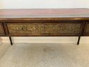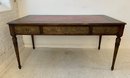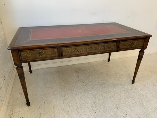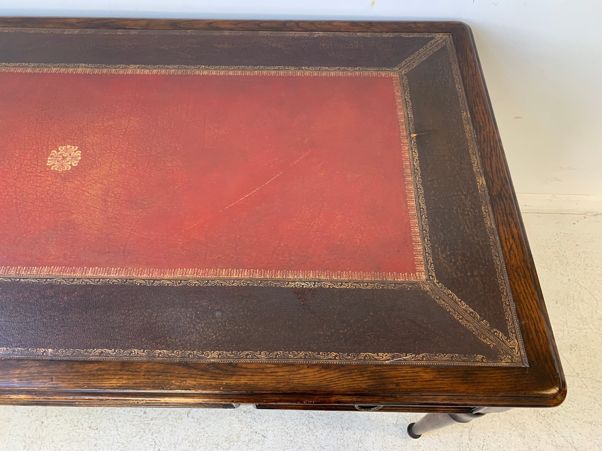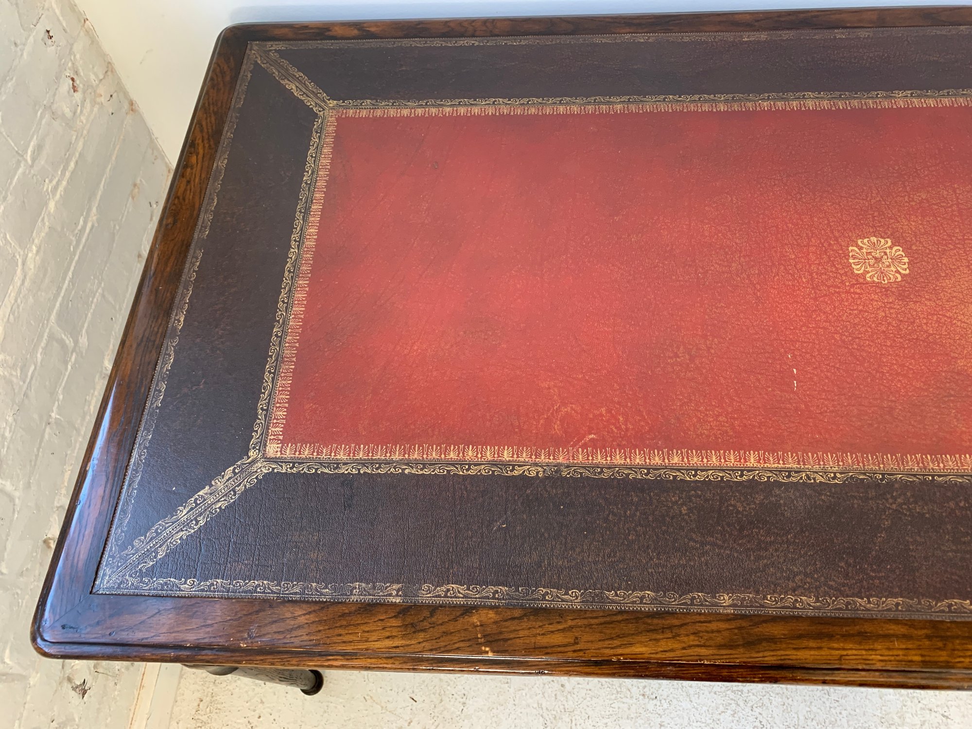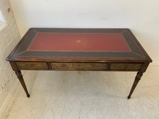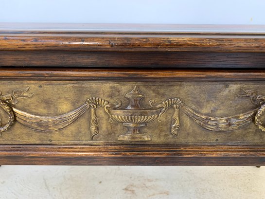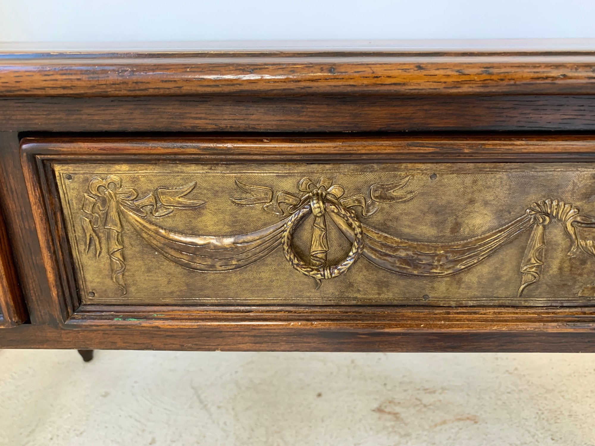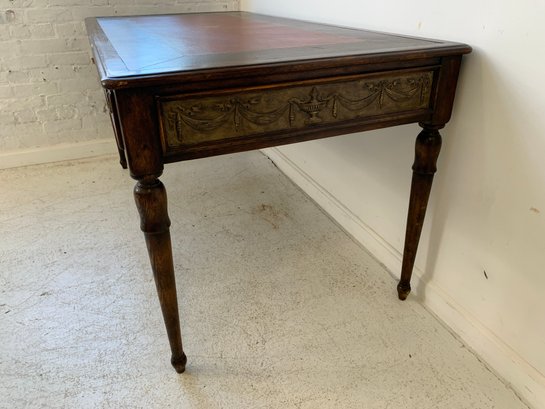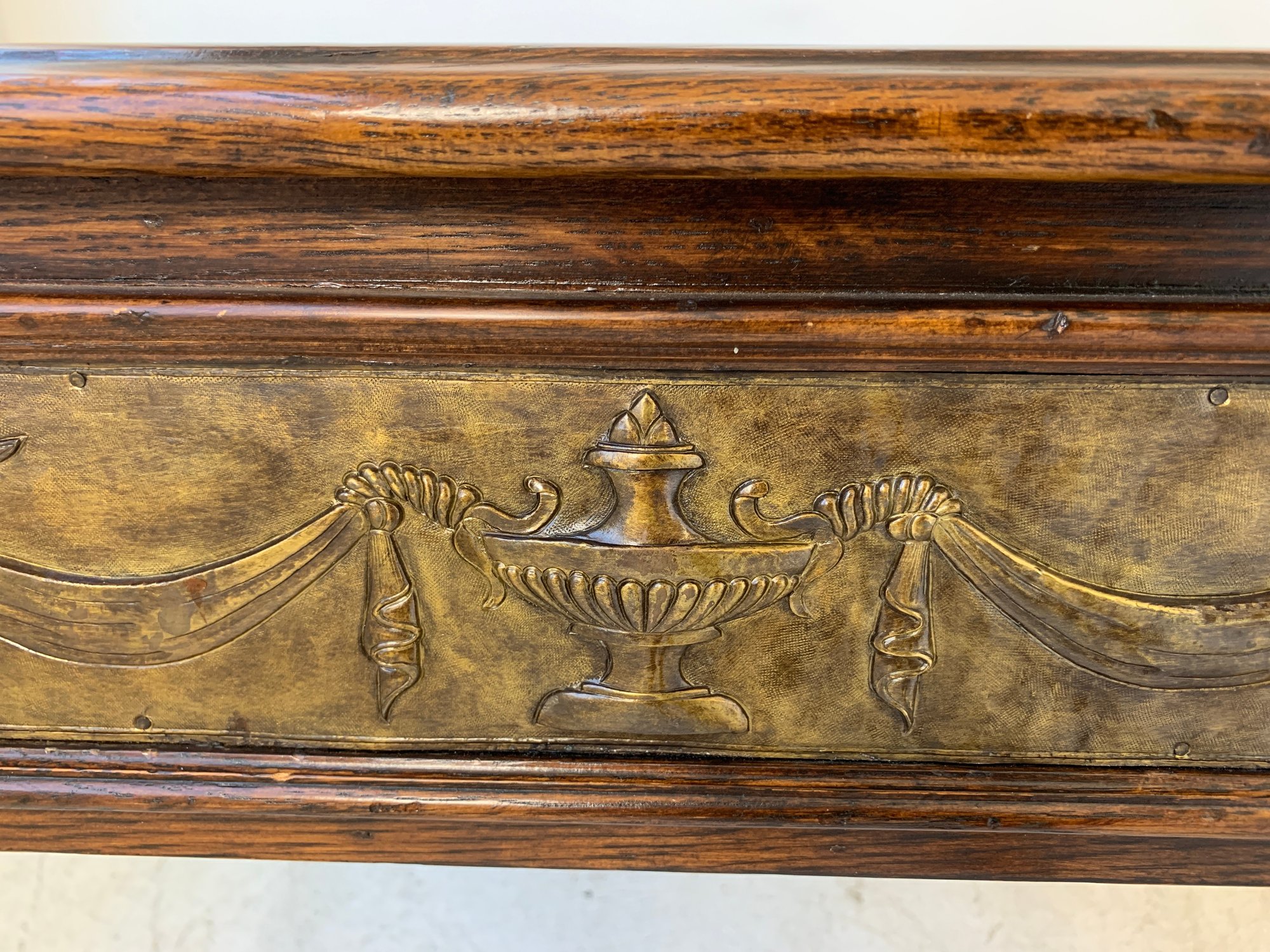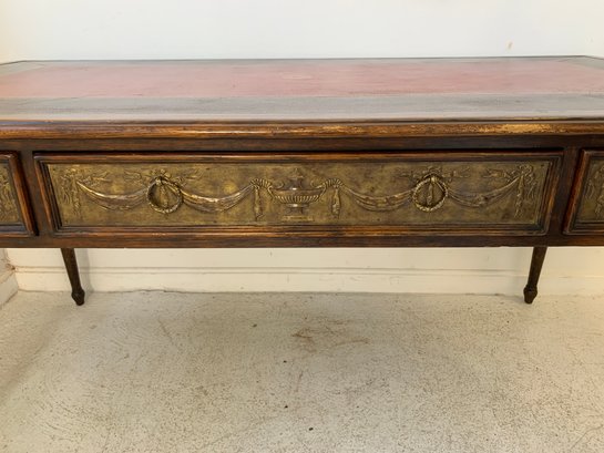 A freestanding oak library table with a two-tone red and black leather top, gold-tooled with foliate borders and a central rosette medallion. Fitted with three drawers to the front, the entire frieze faced in embossed brass panels depicting draped swags, urns, ribbon-tied bows, and classical figures, running continuously around all four sides, allowing the piece to sit beautifully in the center of a room. Rope-twist ring pulls throughout. Standing on turned and tapered legs ending in spade feet. C. late 20th century.