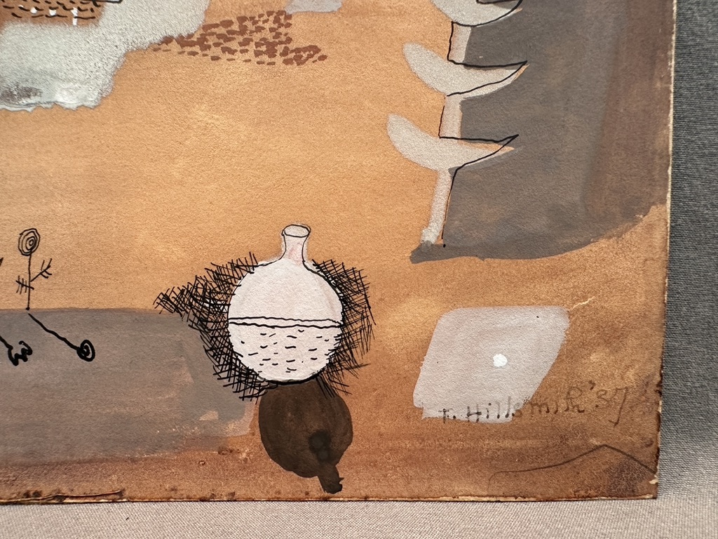 An original mixed media work on paper signed and dated F. Hillsmith '37 lower right. The image features abstract shapes and lines in a muted color palette, predominantly browns, oranges, and grays.