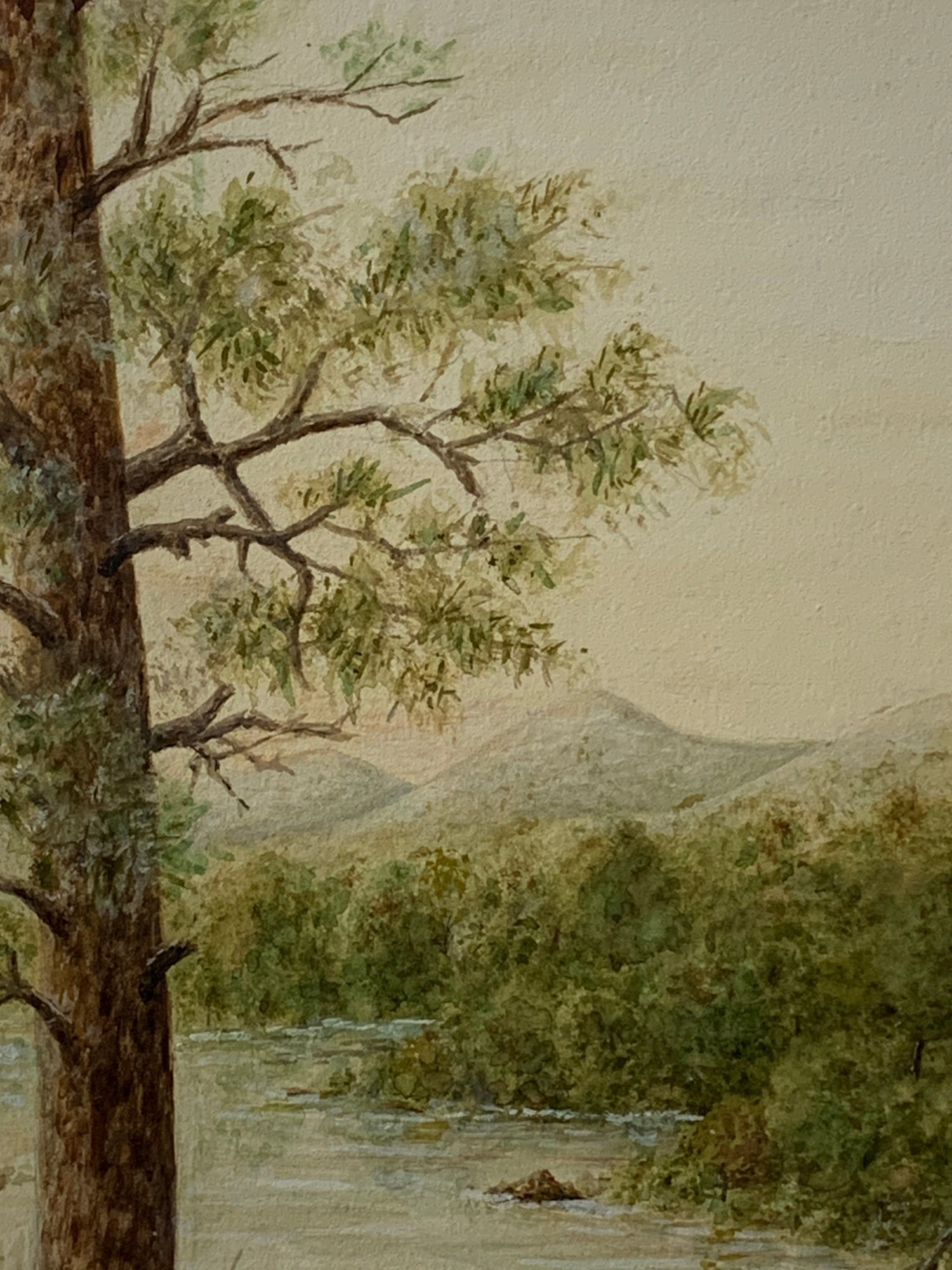 Charming watercolor landscape depicting a river scene with a large foreground tree, rolling hills, and mountain vista beyond, signed Frank Ostrander and dated 1941. Presented in a gilt beaded frame with linen mat under glass.