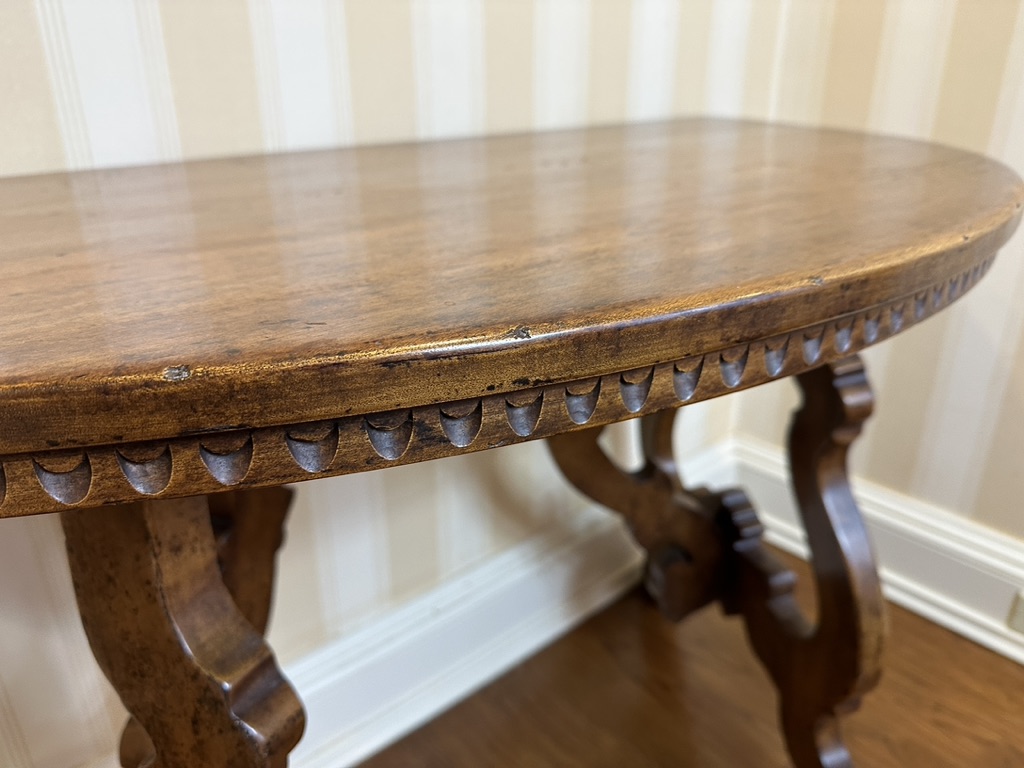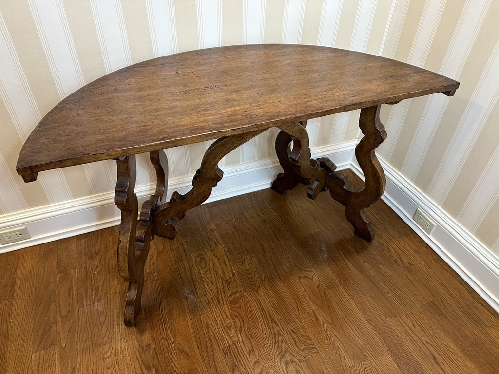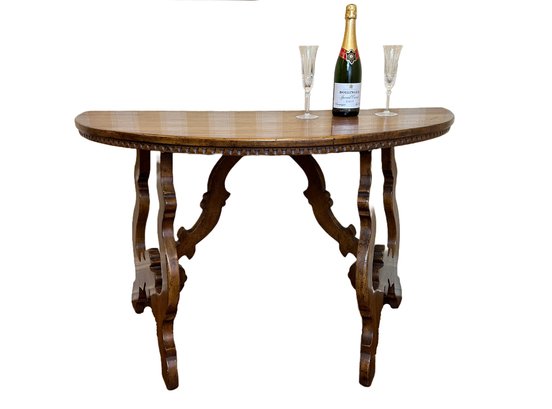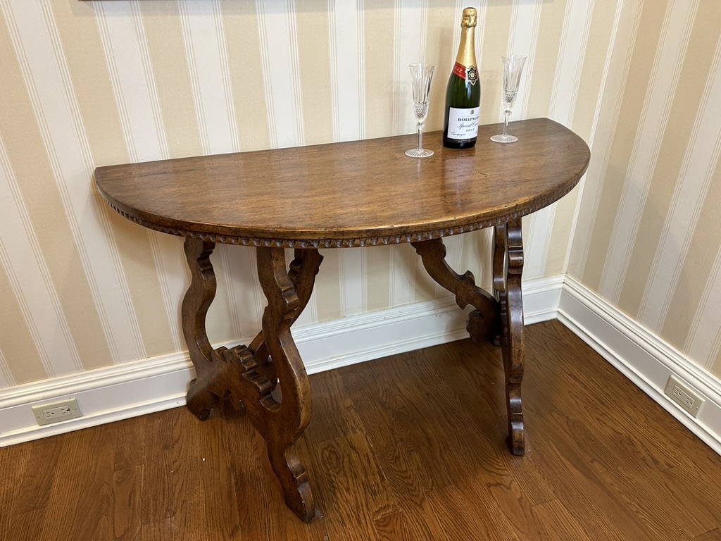 Half-moon shaped walnut entryway table with chip carved apron, on classical lyre-shaped legs. Circa 20th century.