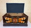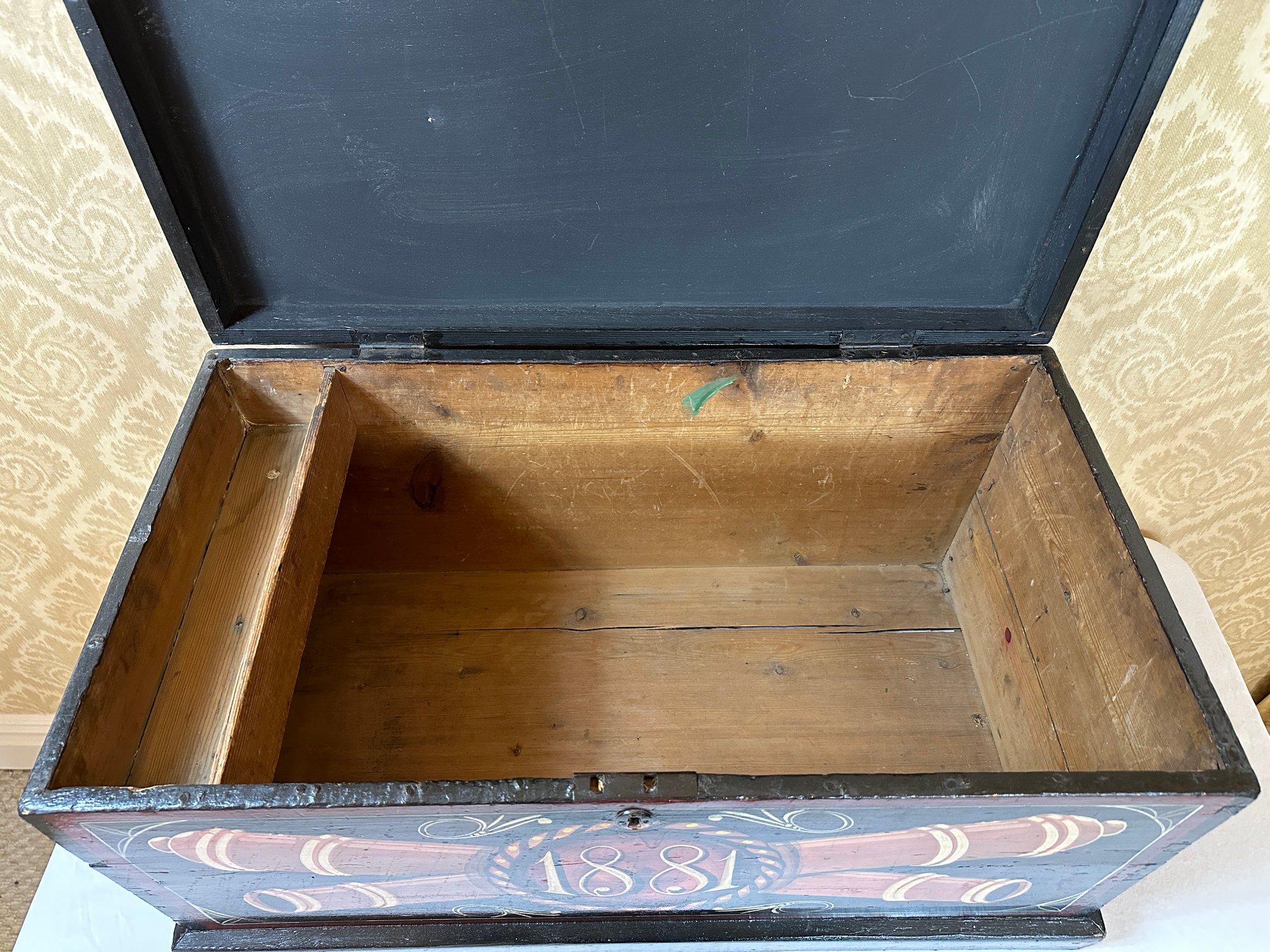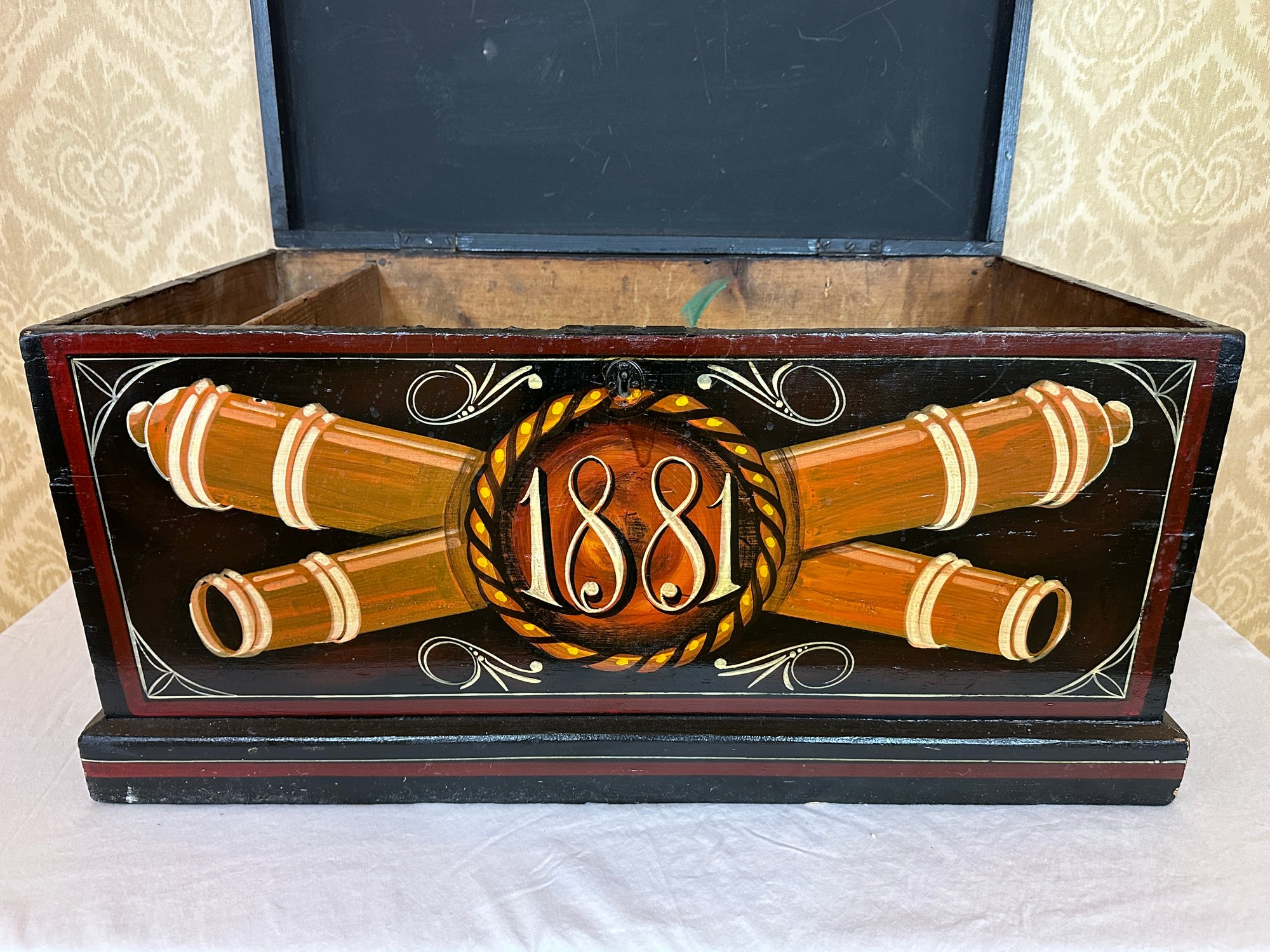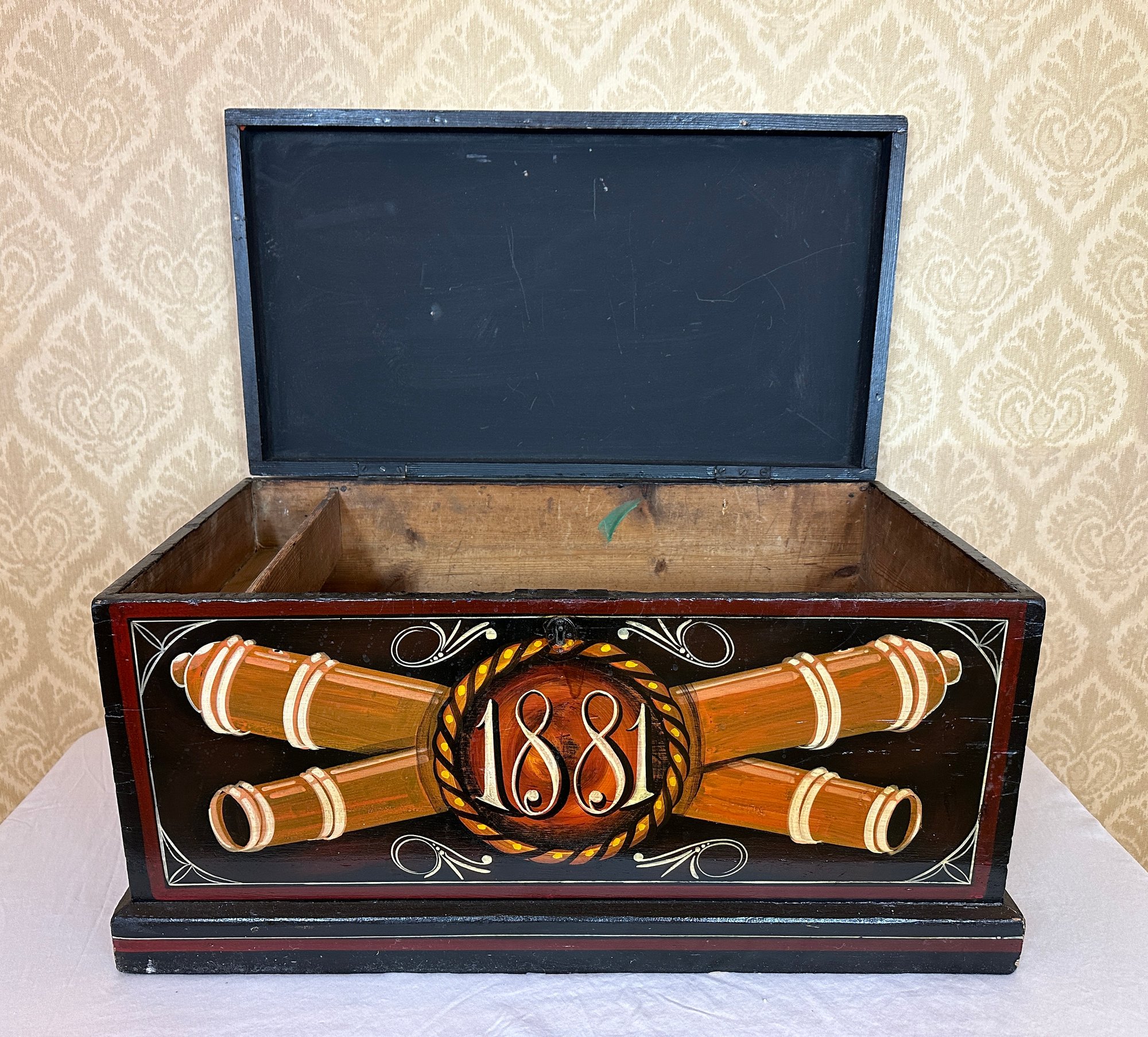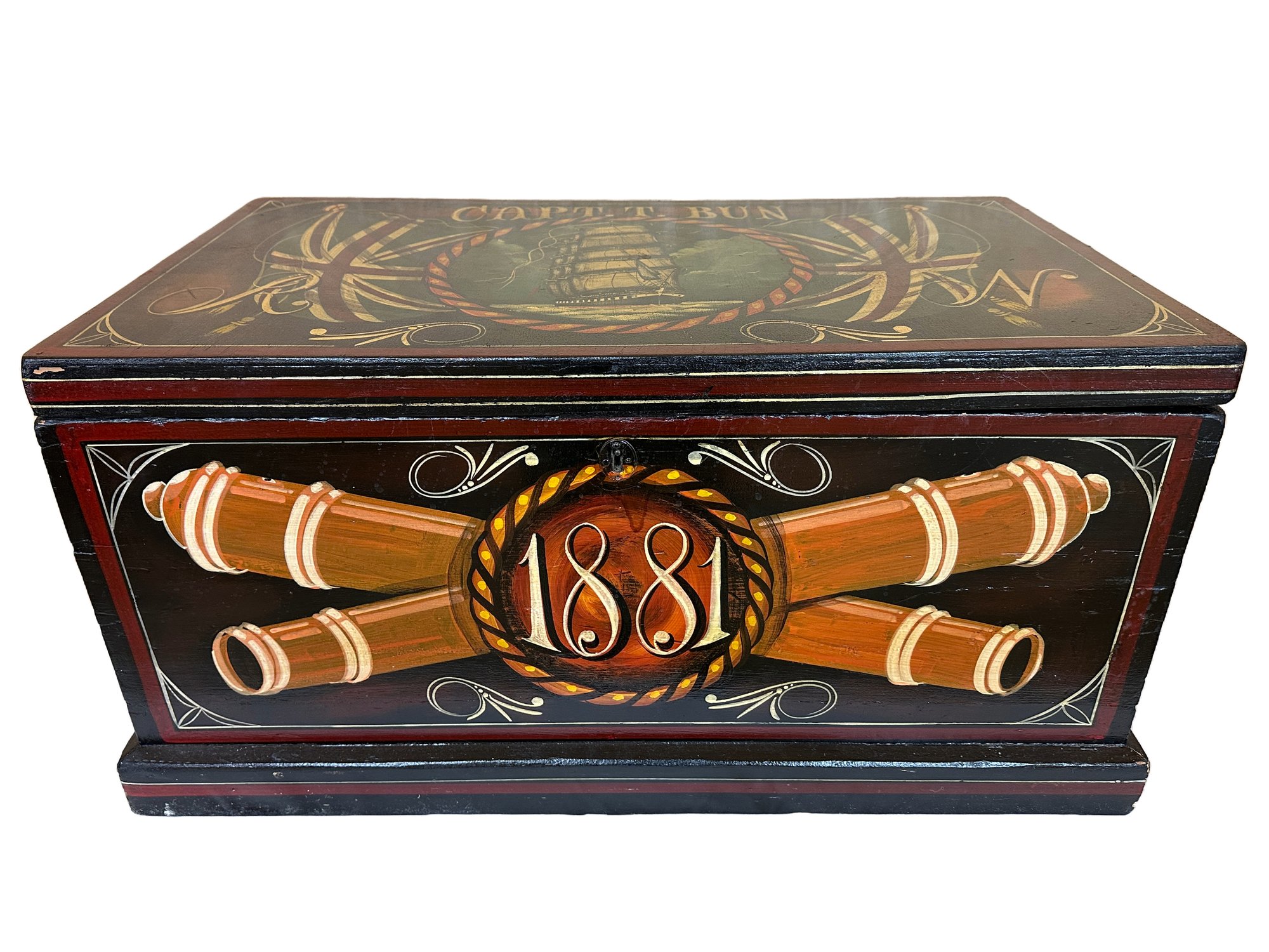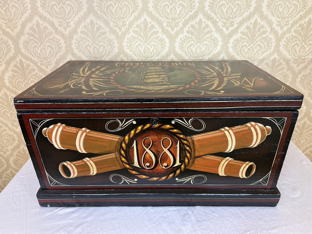 A sea captain's chest dated 1881 with cannon decoration on the front, a ship's portrait on top with name Captain T. Bun, and on the back says "Bristol". Dovetailed. 20th century reproduction