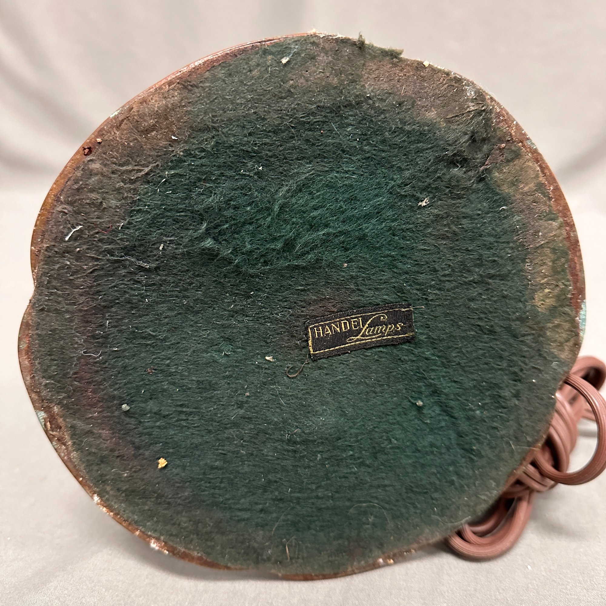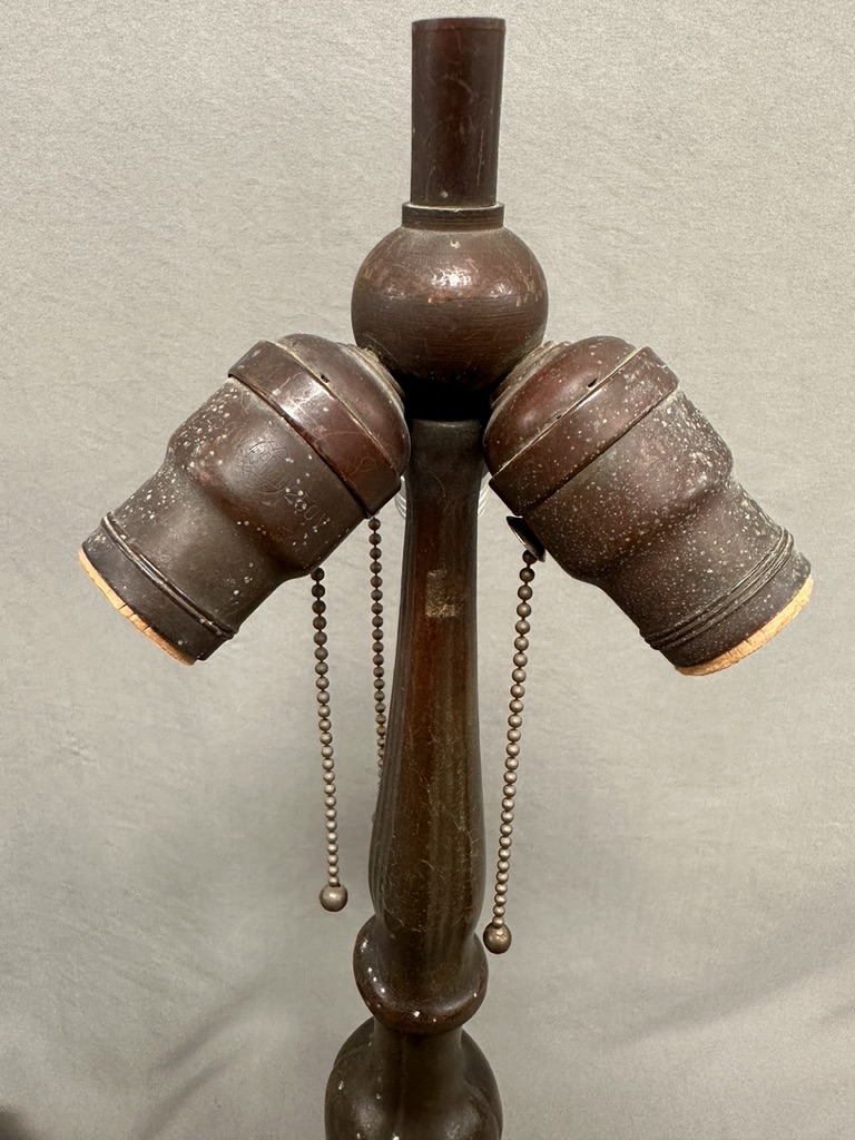 Original Handel bronze 3 light lamp base, with 2 complete sockets, missing heat cap and finial , original patina. Labeled Handel Lamps cloth label on underside.