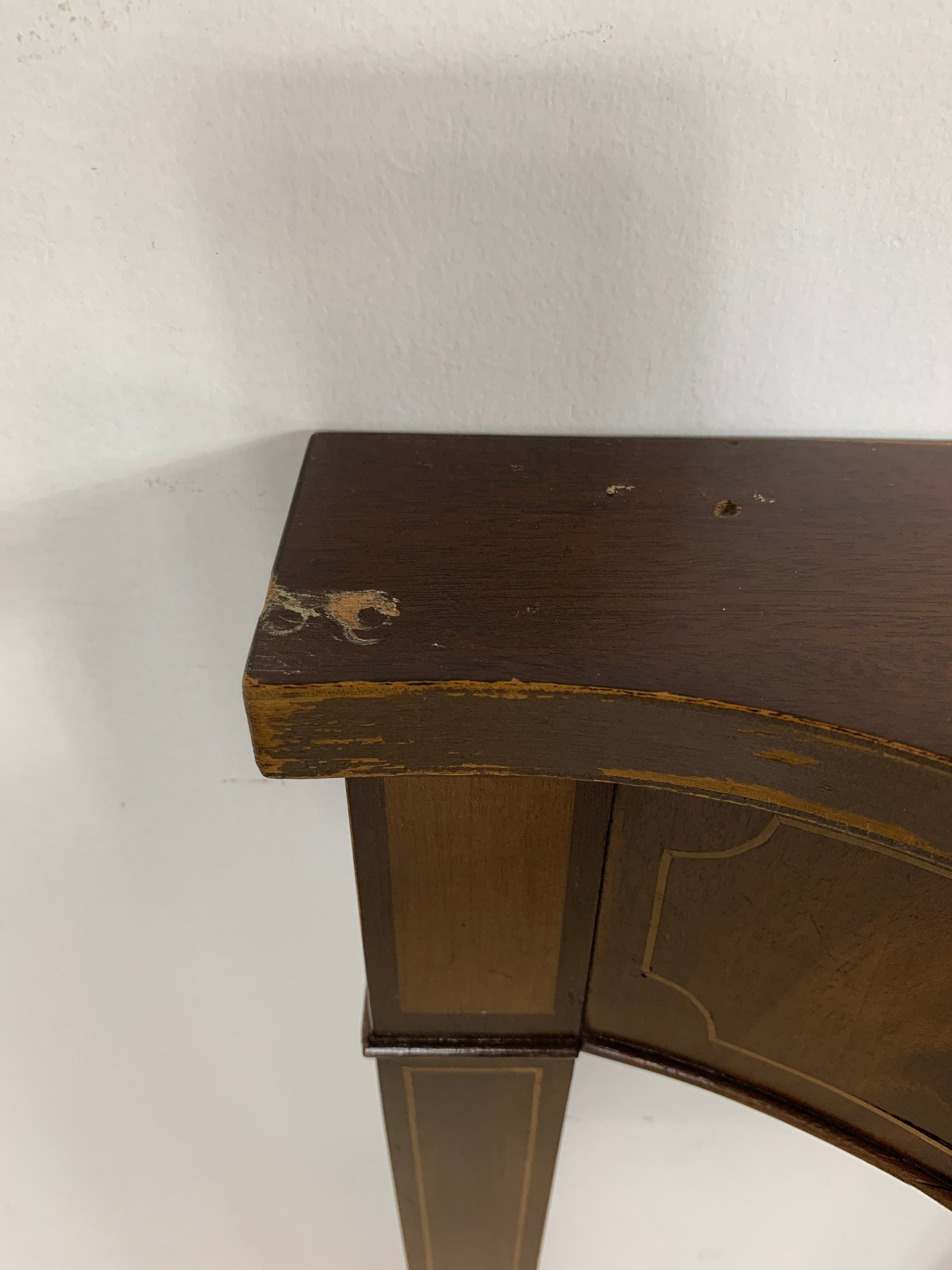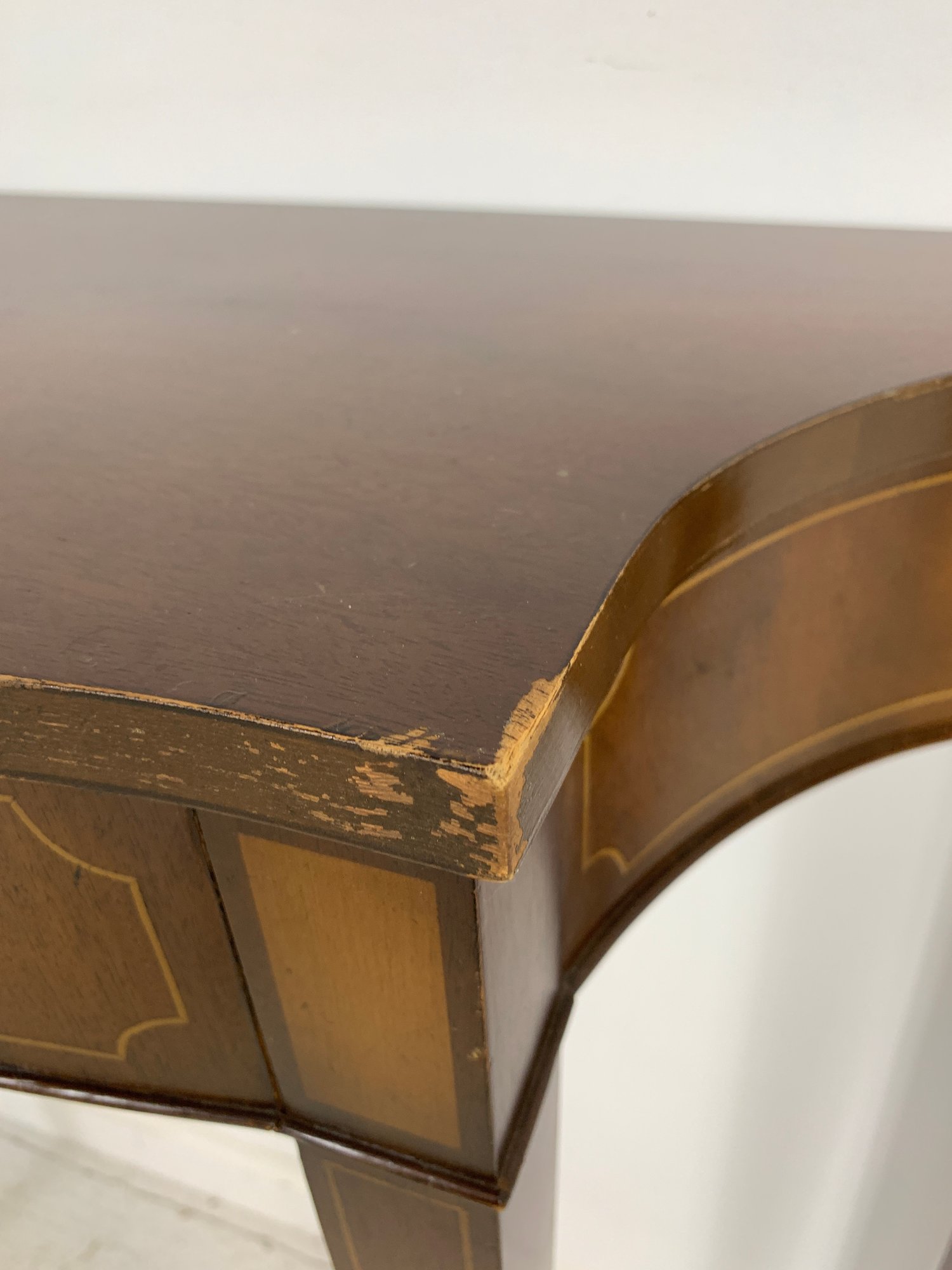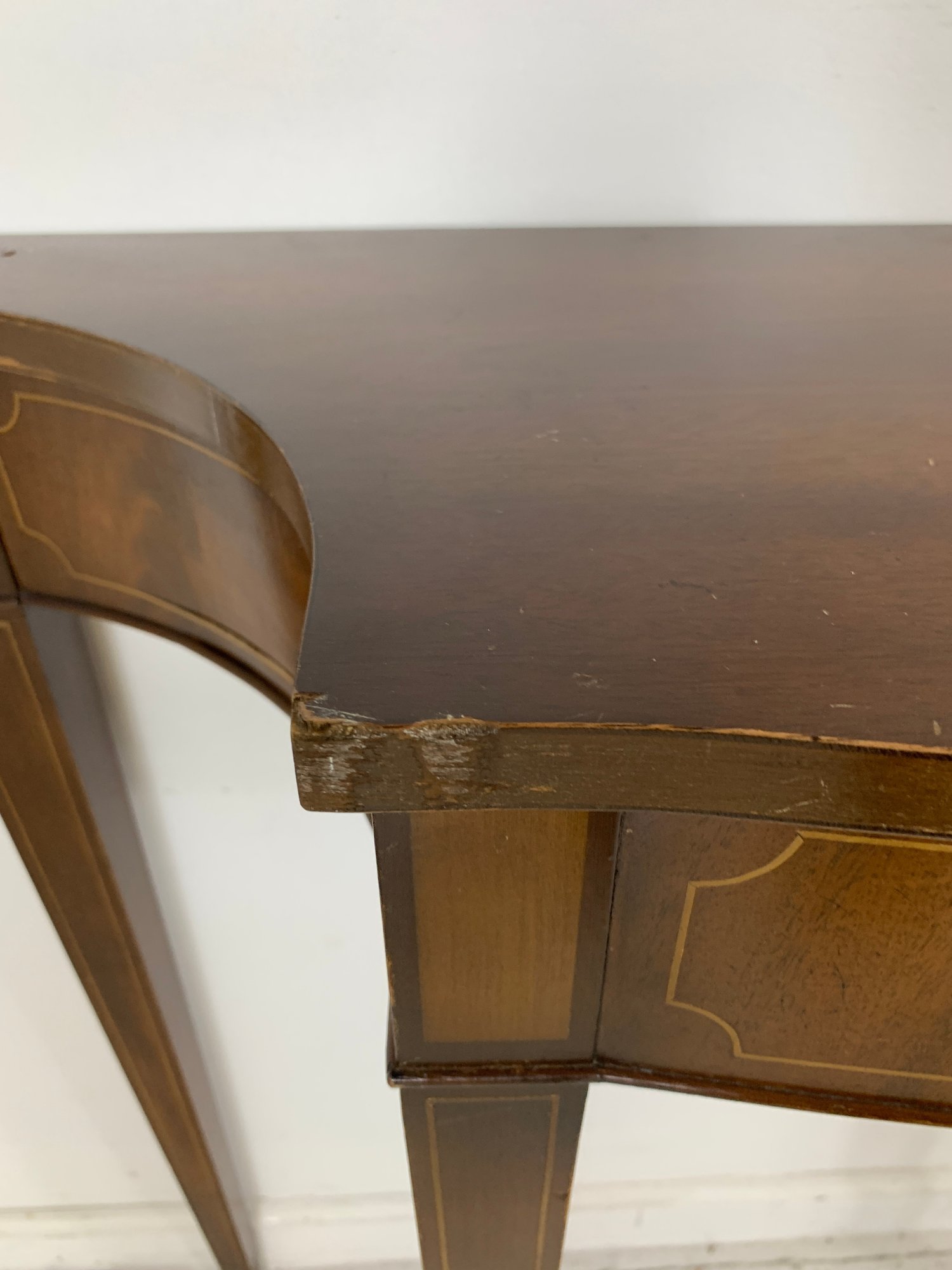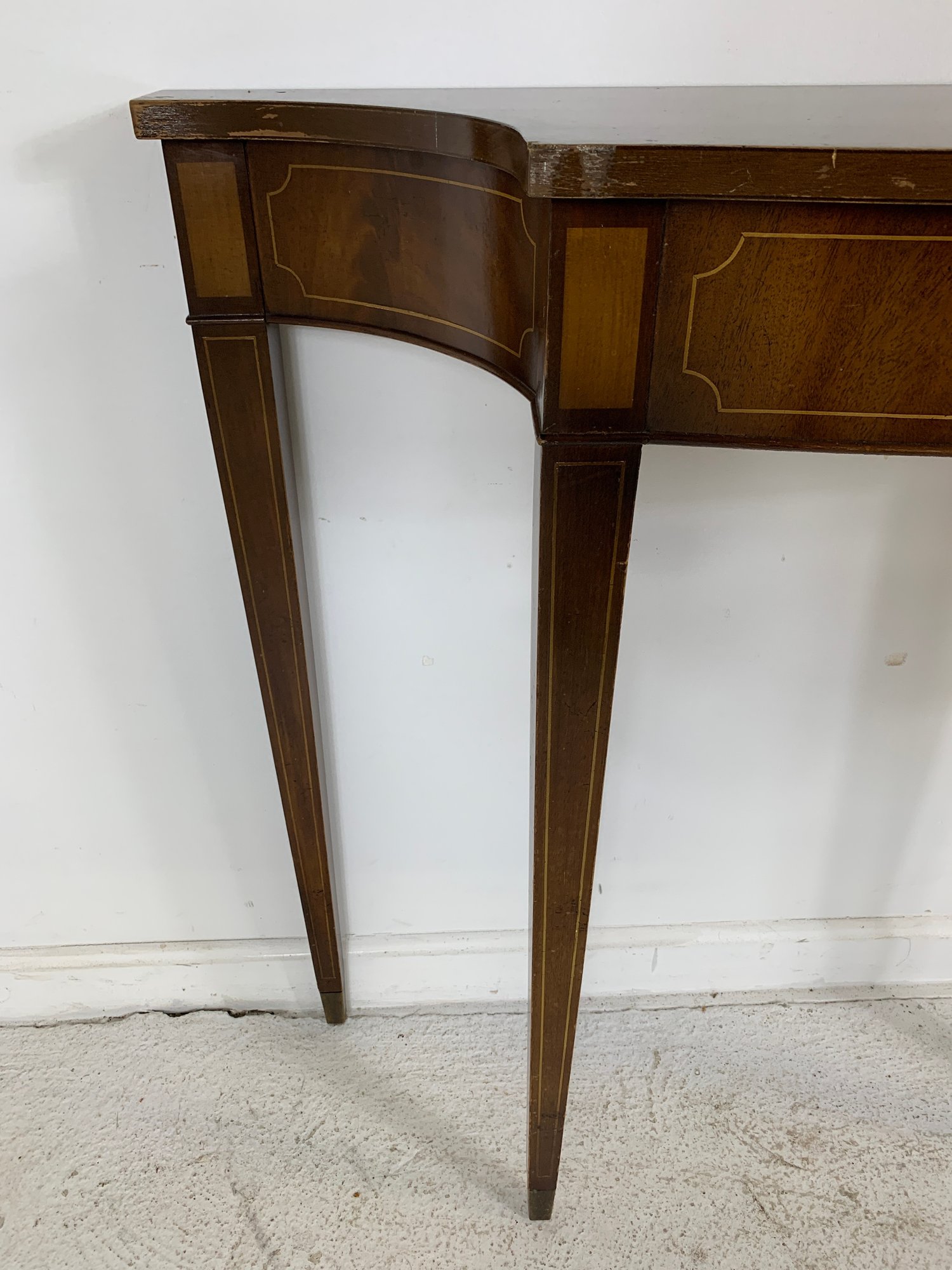 Hepplewhite style mahogany demilune console table with satinwood crossbanding and string inlay on the shaped apron and square tapered legs.