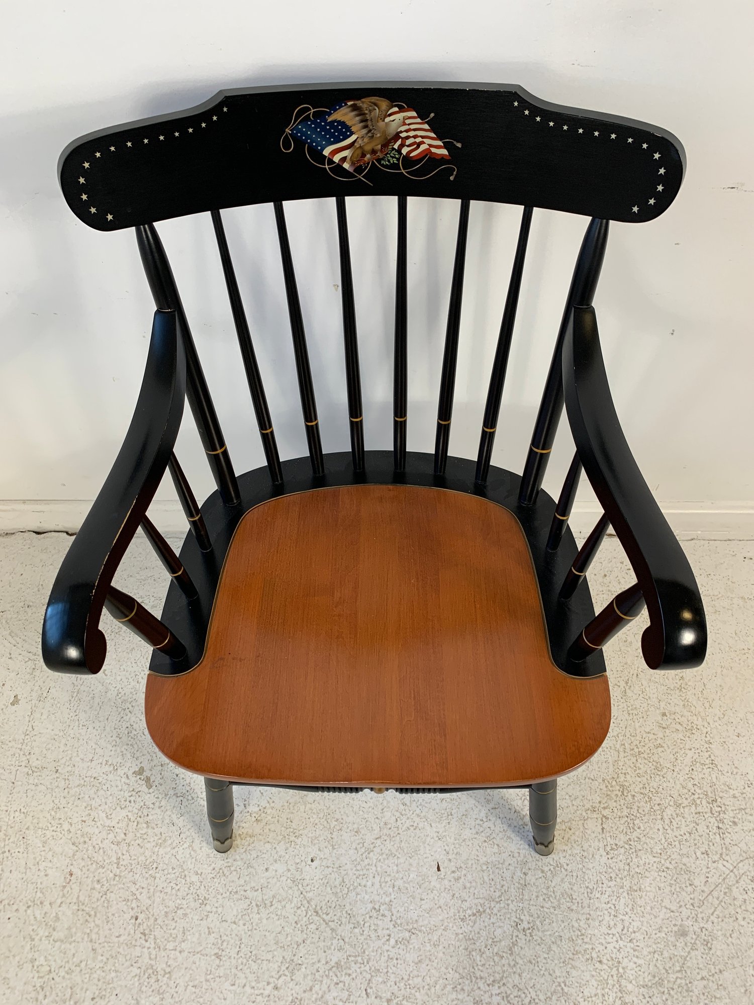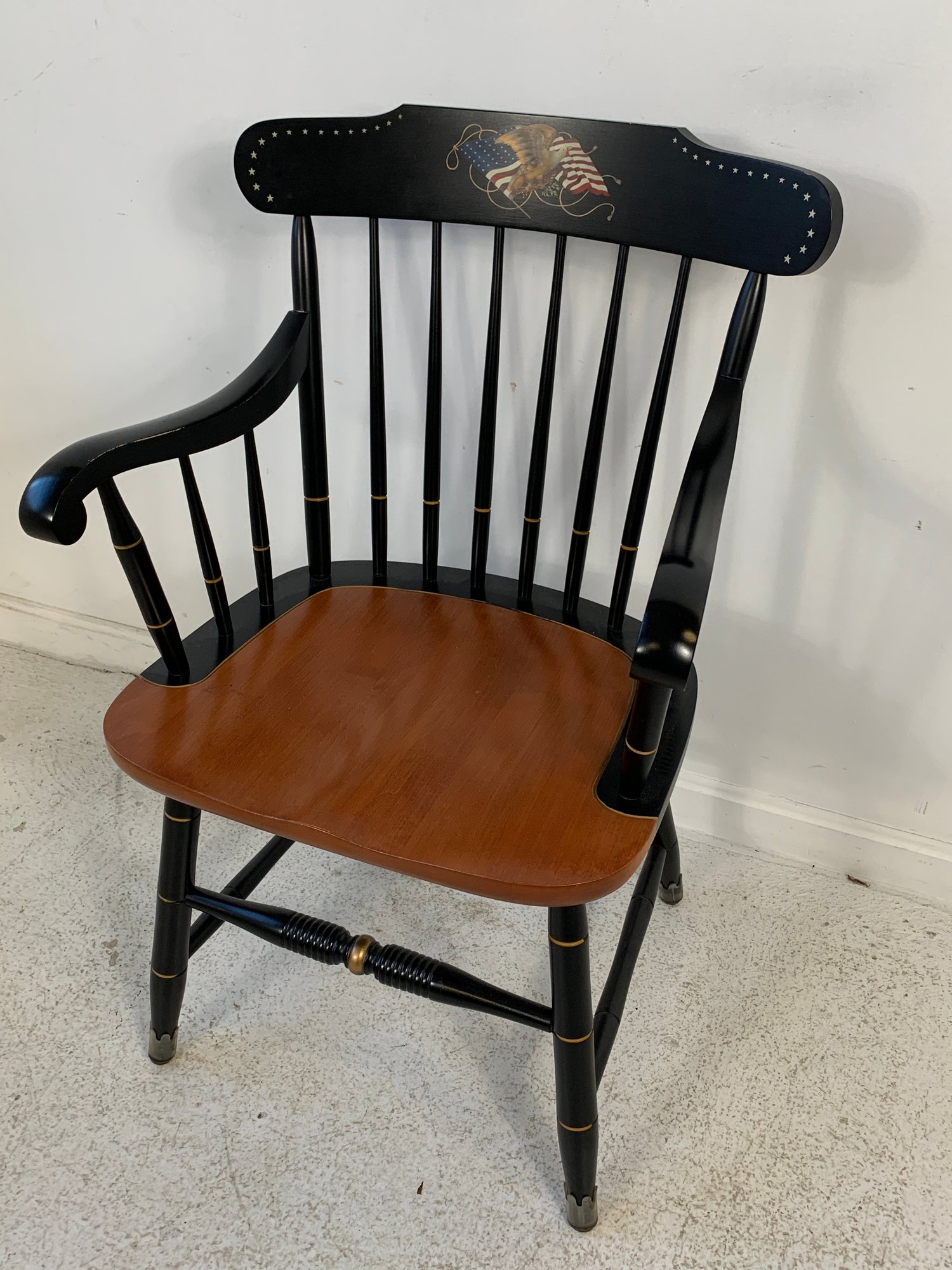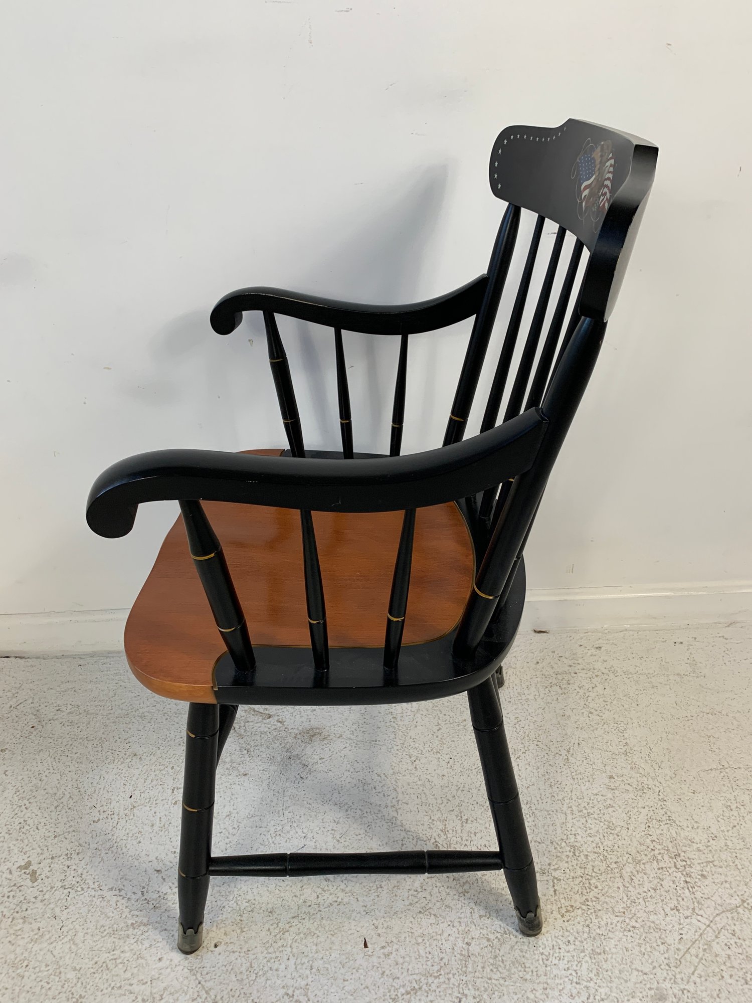 Hitchcock ebonized and stenciled captain's Windsor armchair featuring a hand-painted American eagle and flag motif with star border on the crest rail, spindle back, shaped arms with gold banding, natural cherry saddle seat, and turned legs with stretchers.