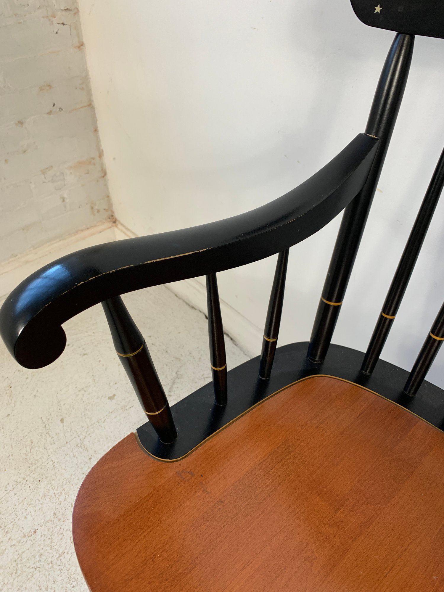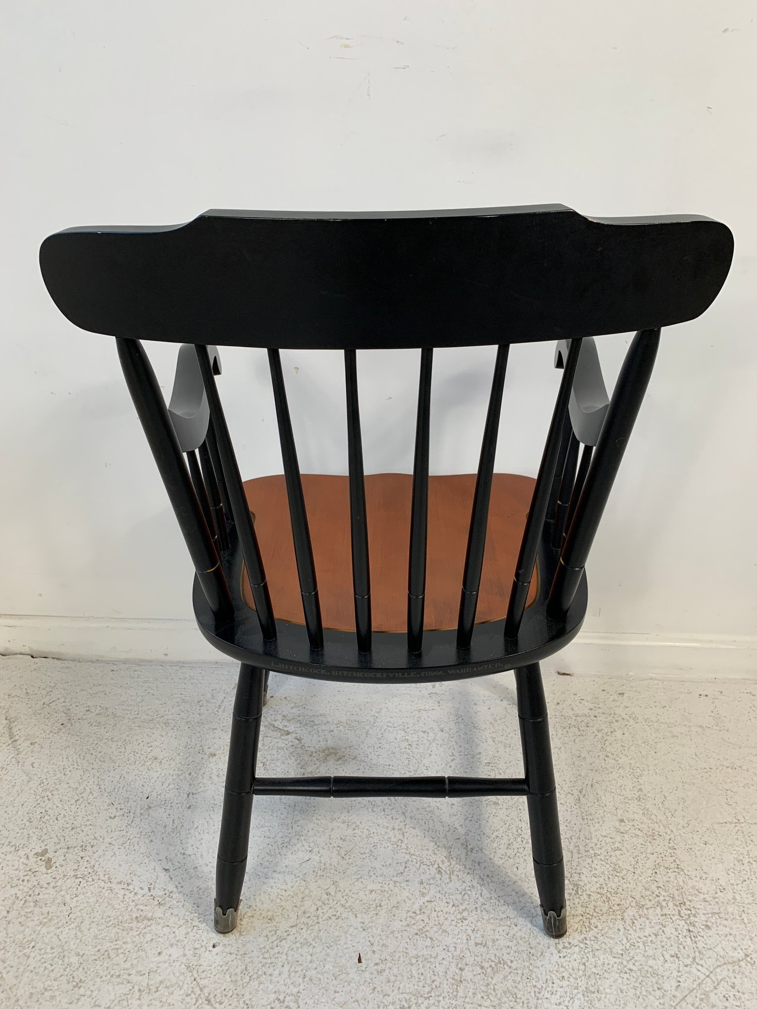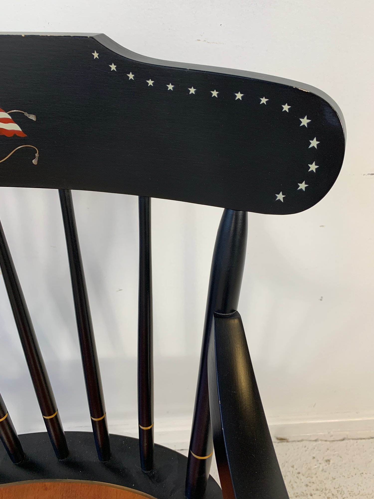 Hitchcock ebonized and stenciled captain's Windsor armchair featuring a hand-painted American eagle and flag motif with star border on the crest rail, spindle back, shaped arms with gold banding, natural cherry saddle seat, and turned legs with stretchers.