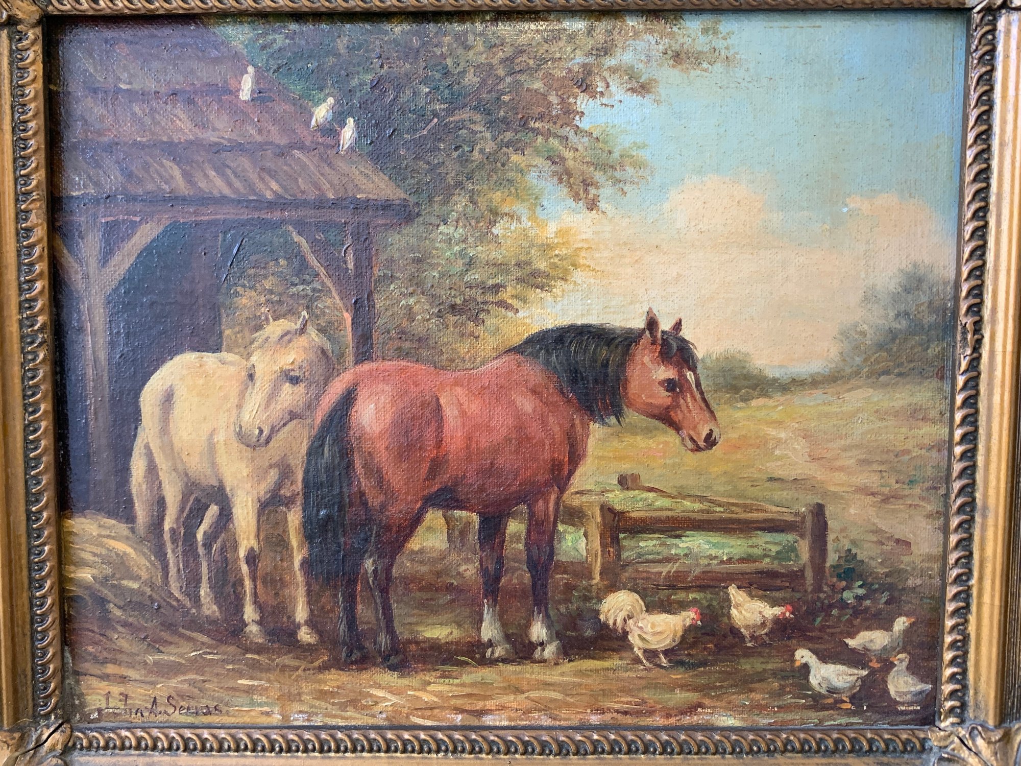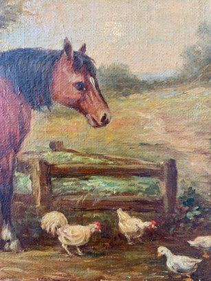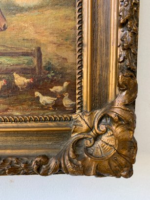 A charming pastoral scene depicting two horses and a flock of chickens in a farmyard setting. Signed lower left.