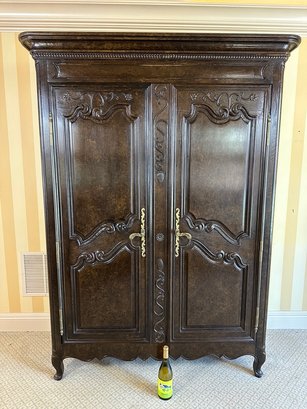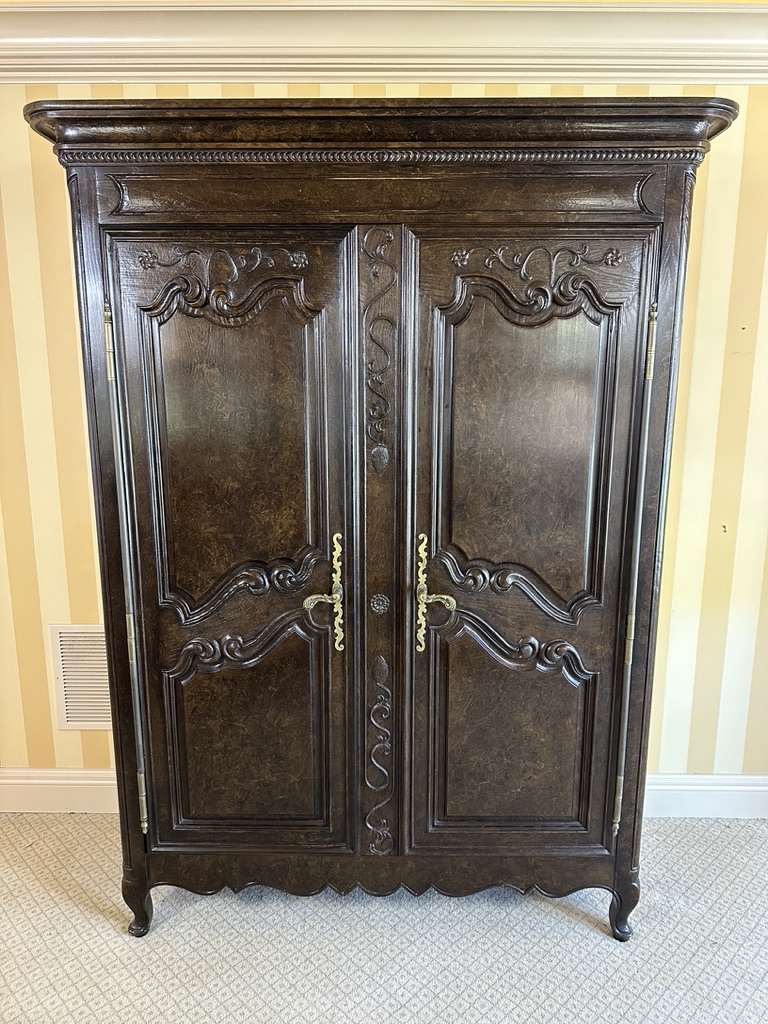 Two-door carved panel front with bronze hardware brackets. Interior has three drawers and one shelf. This is one piece and does not come apart; very heavy. Must bring help to move.