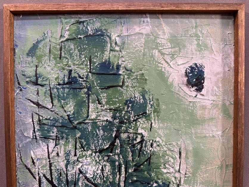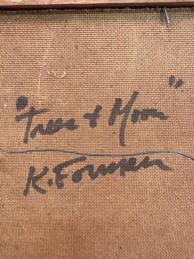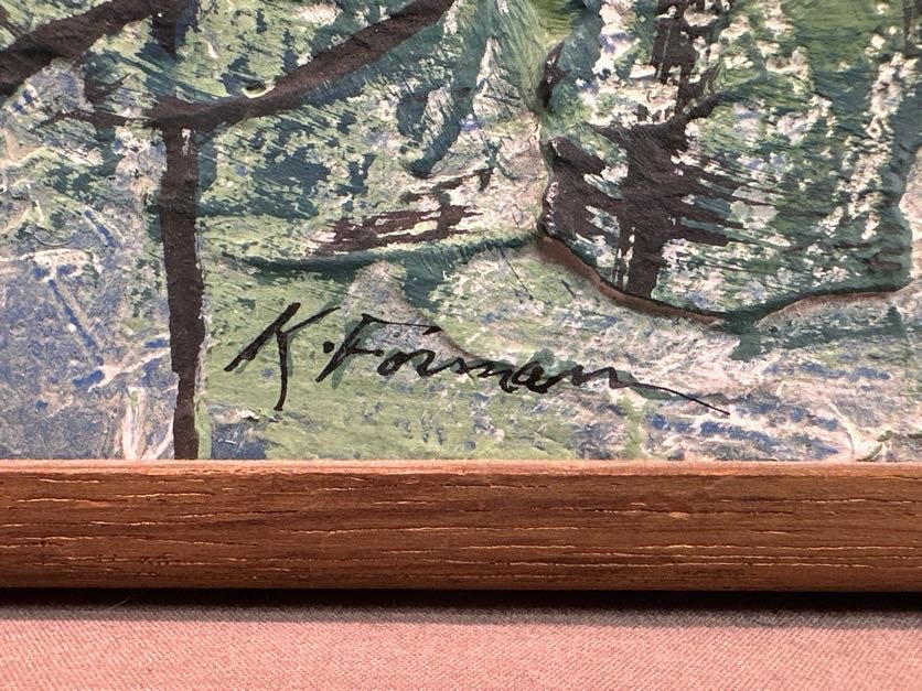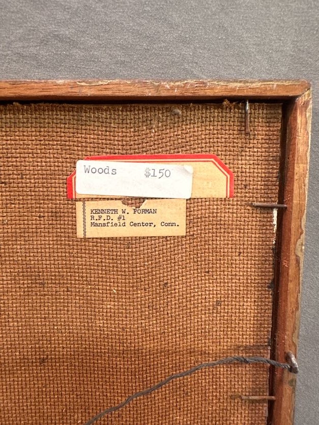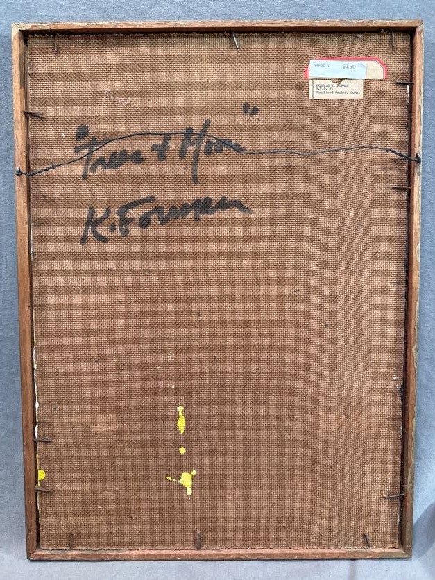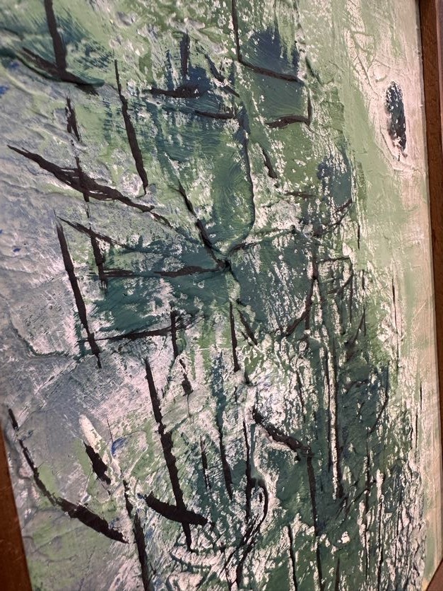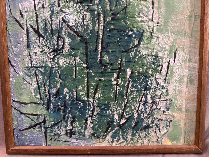 Signed lower left and on the reverse, framed artwork depicting an abstract wooded scene.