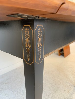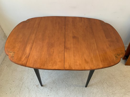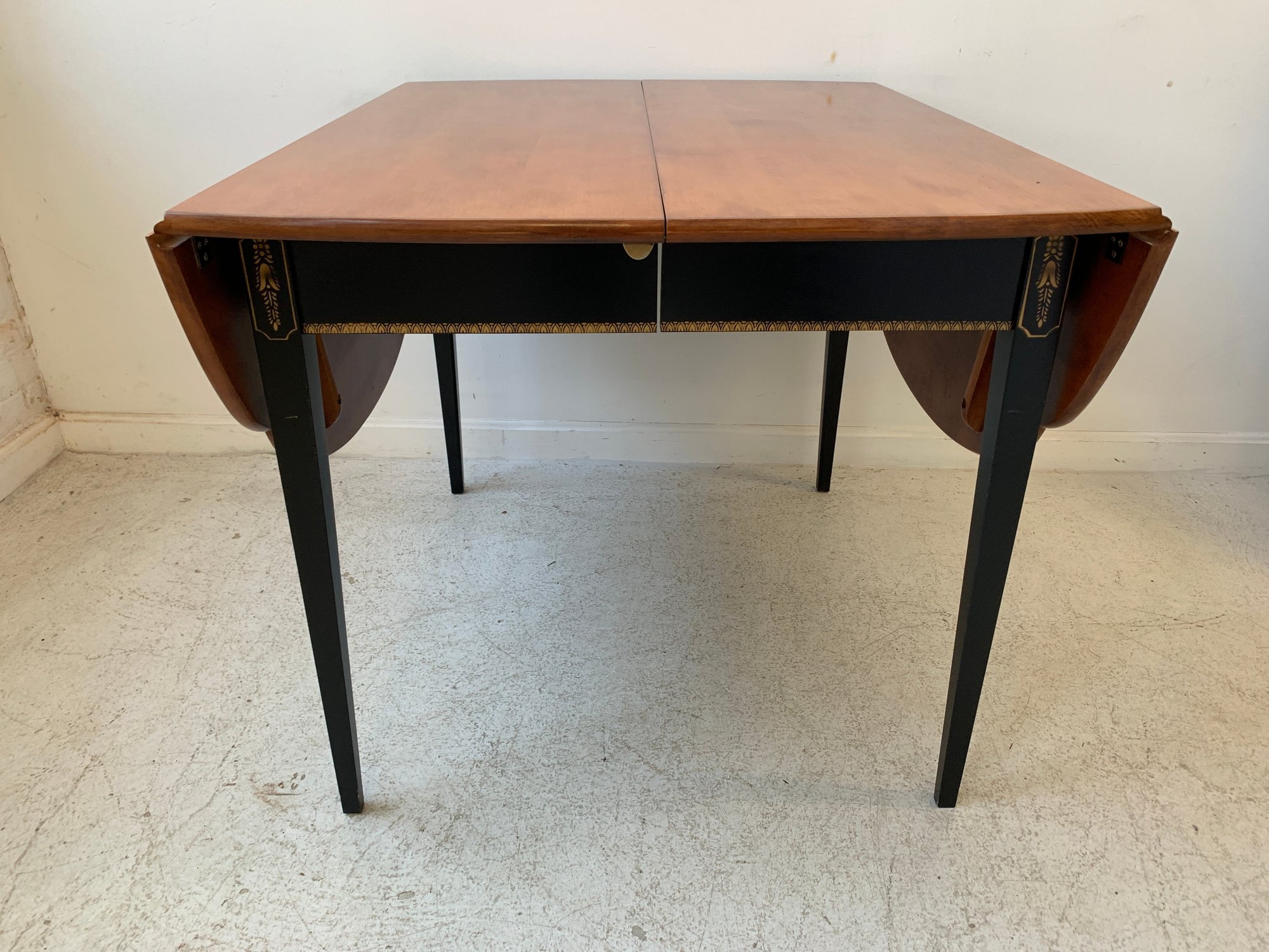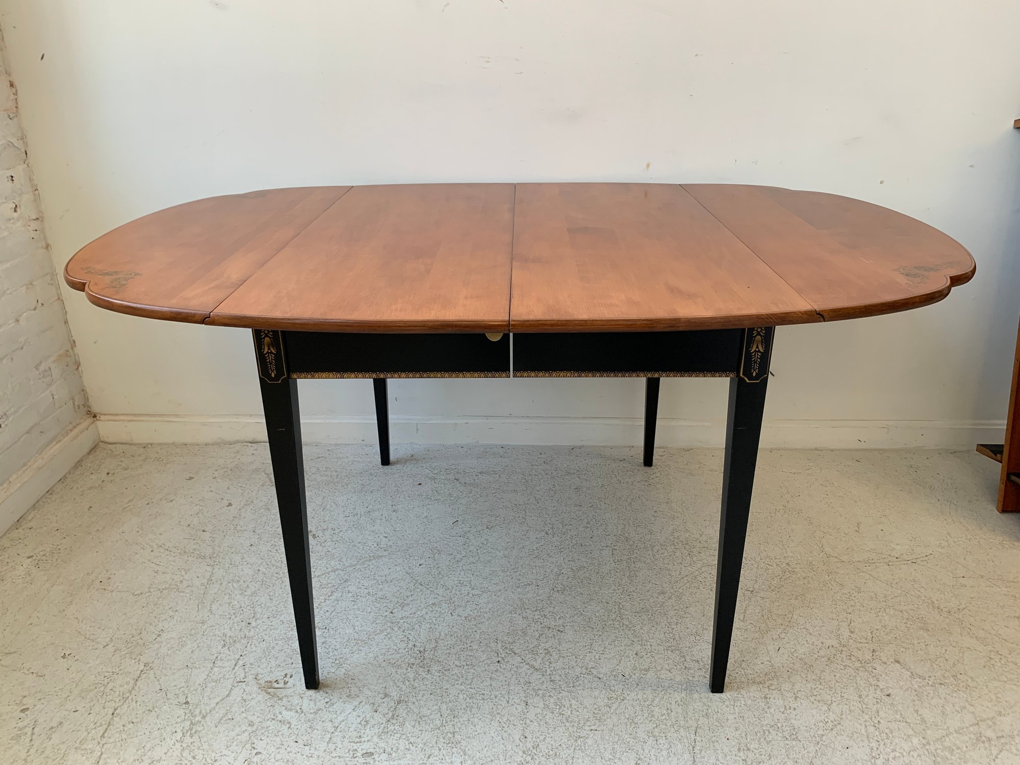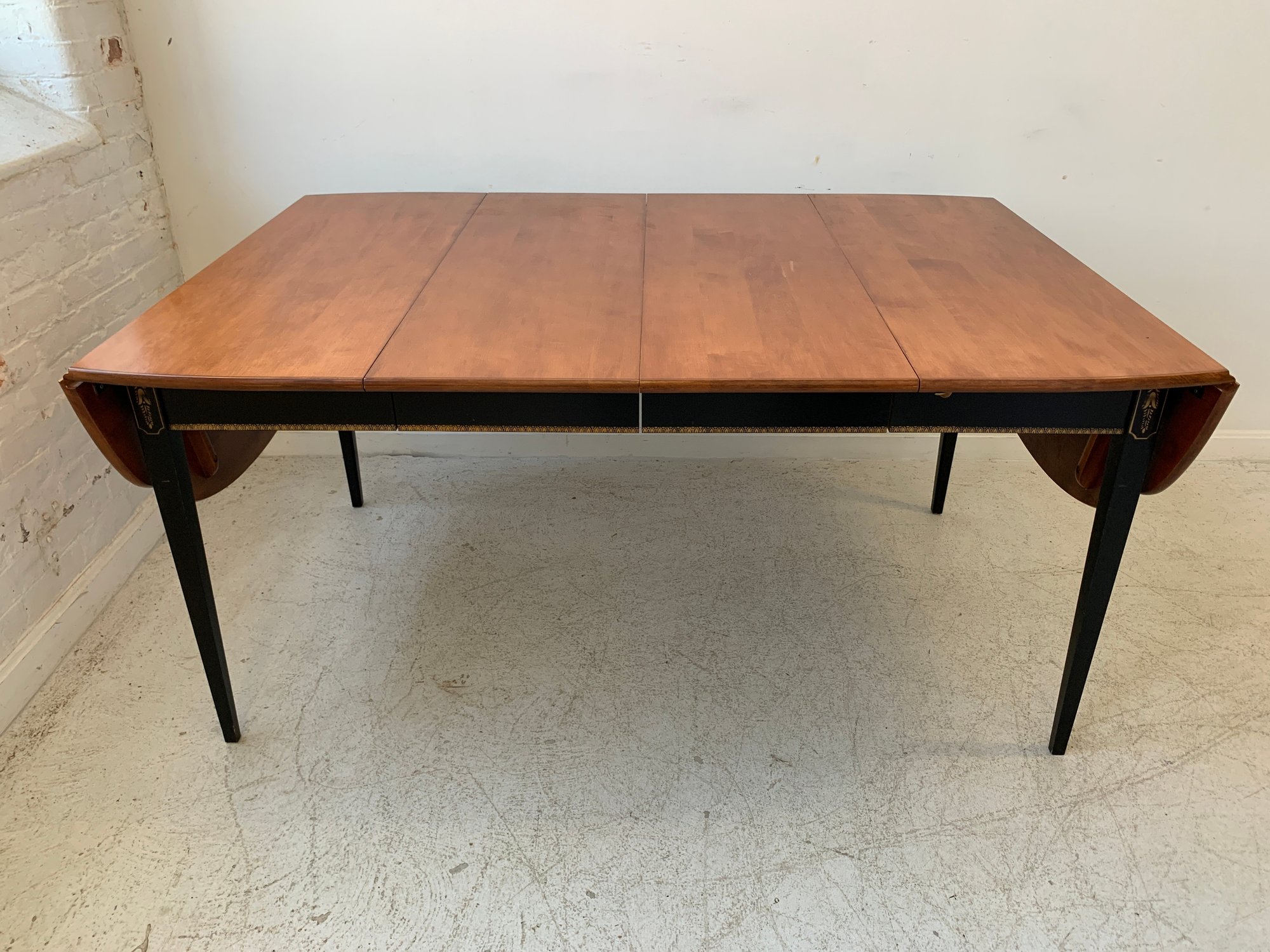 A maple top dining table with ebonized base, featuring a rectangular top with scalloped corners, drop leaves, and gold stenciled floral and foliate decoration on the apron corners and frieze. Raised on square tapered Sheraton style legs. Two additional leaves included.