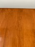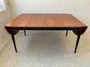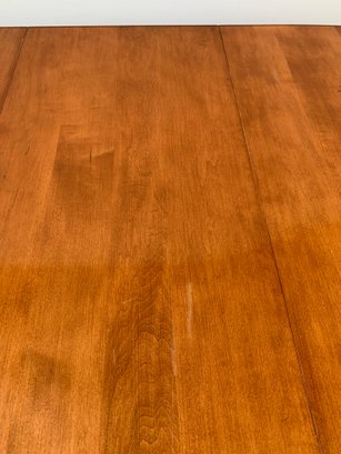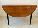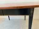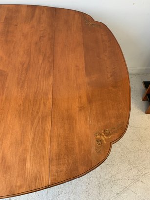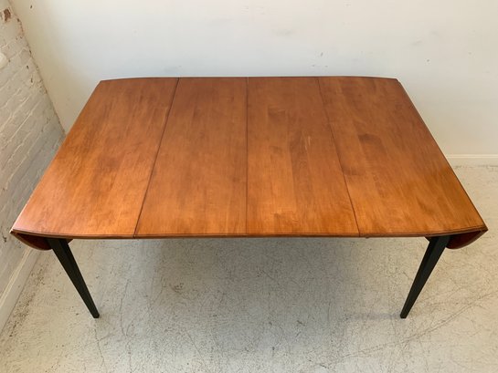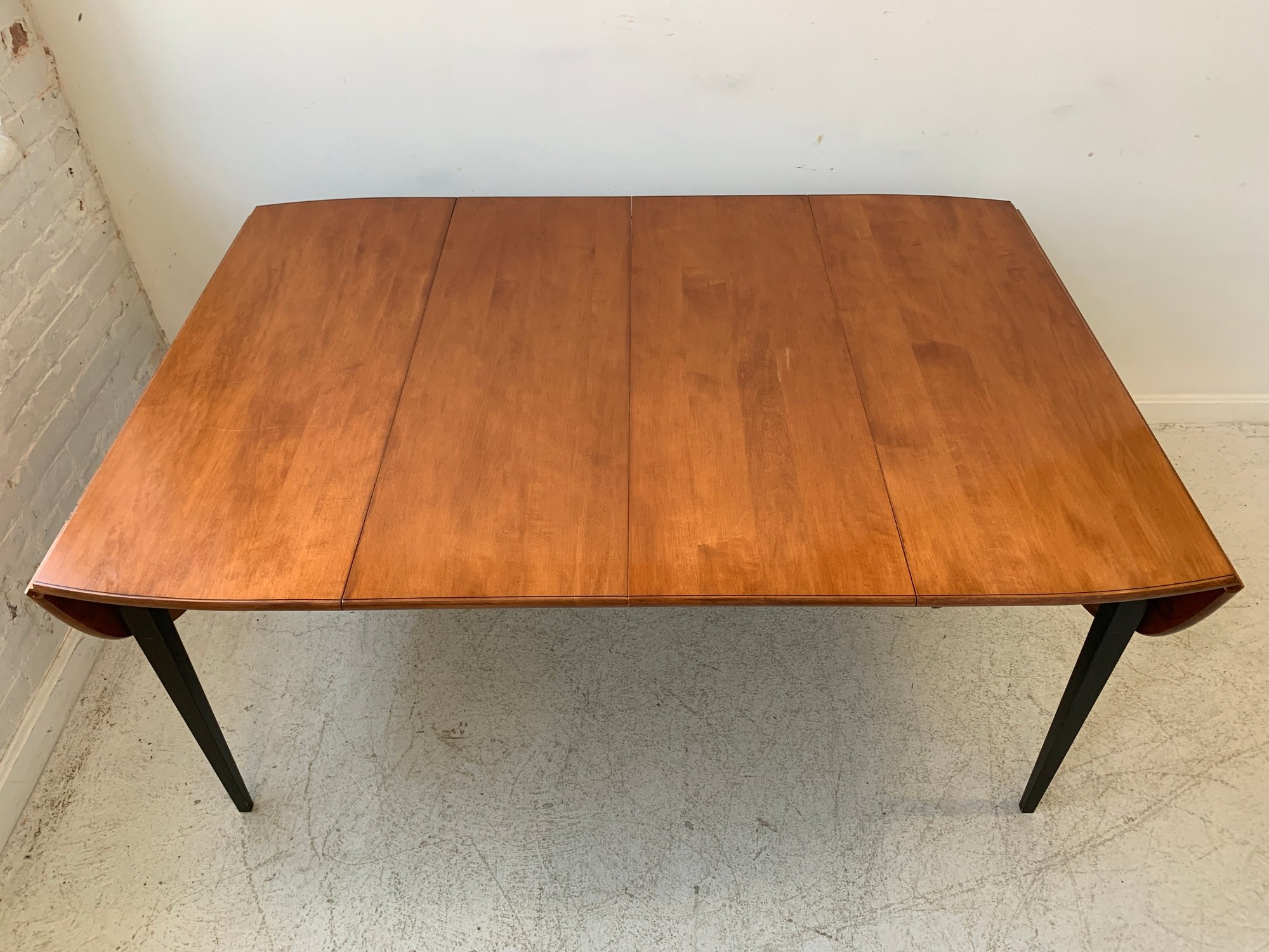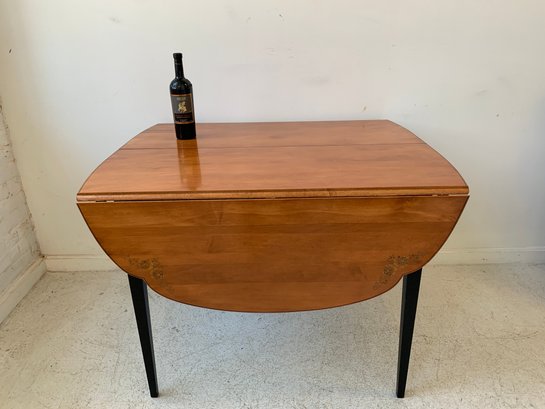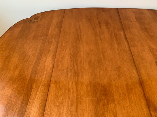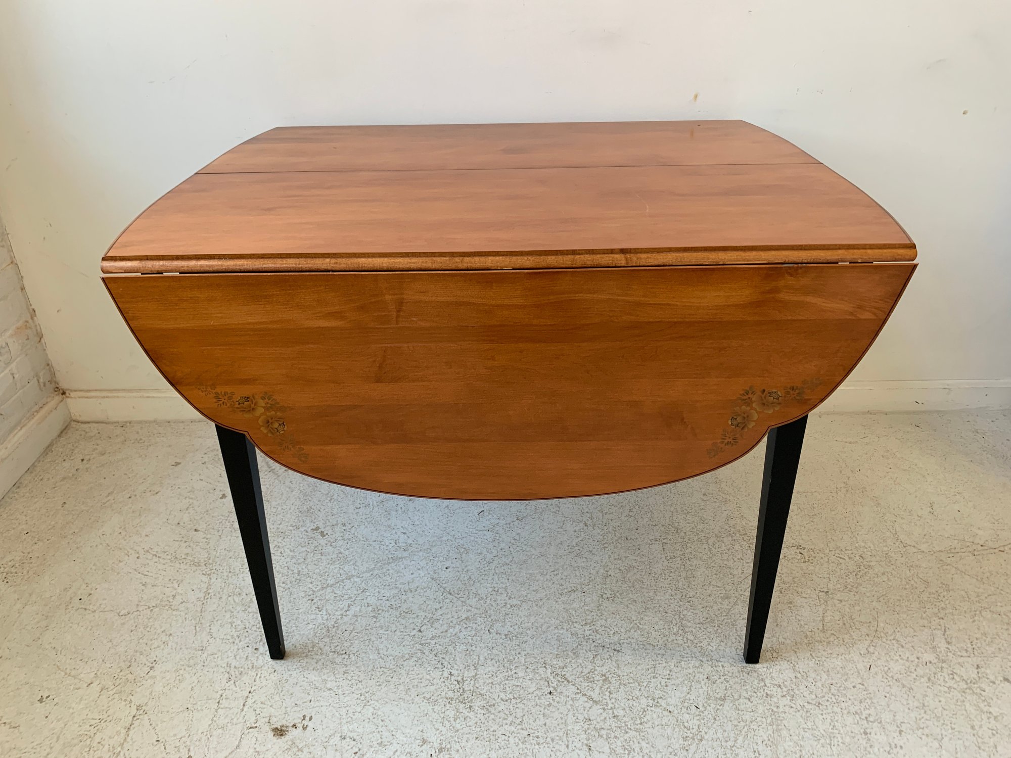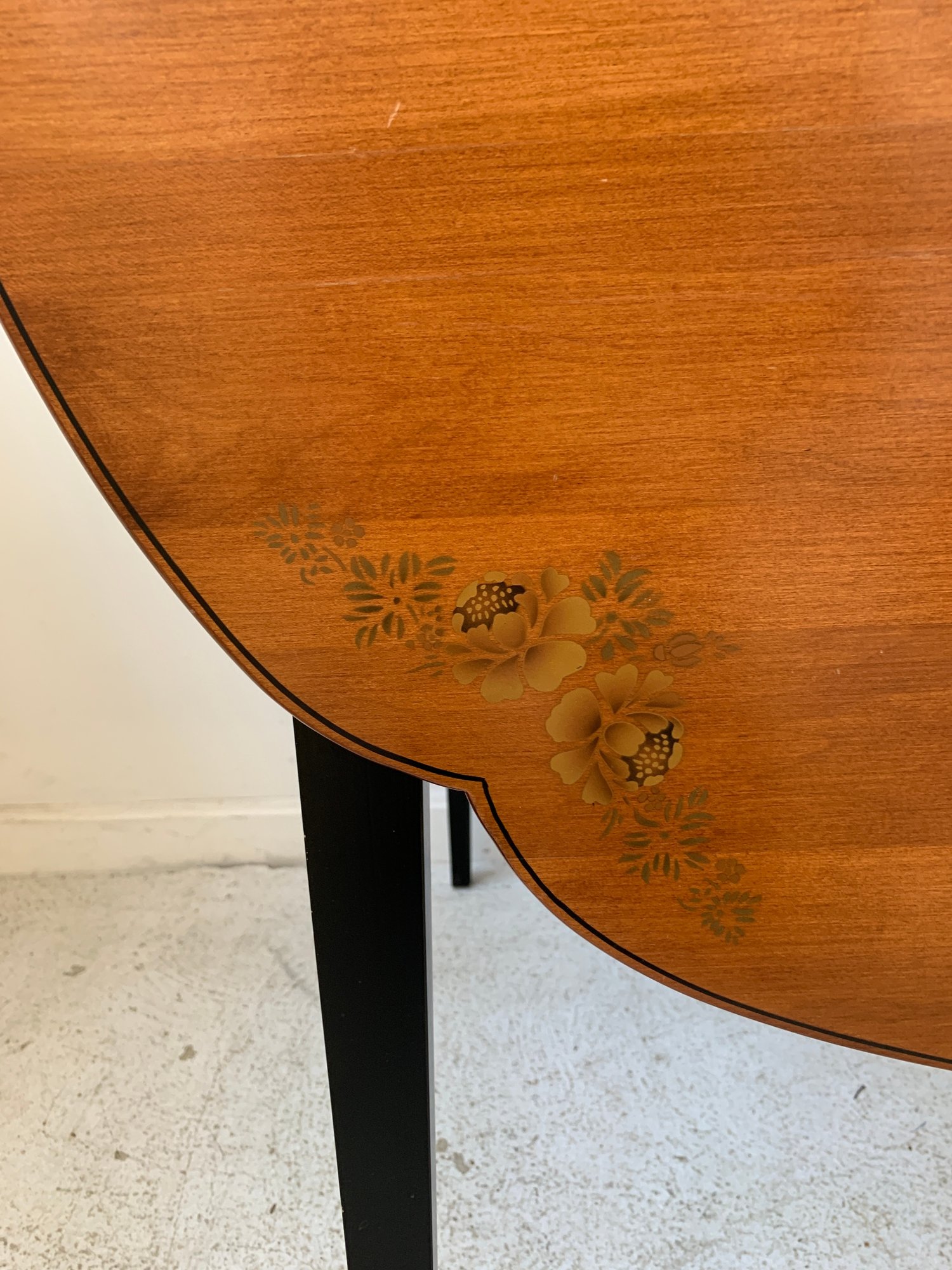 A maple top dining table with ebonized base, featuring a rectangular top with scalloped corners, drop leaves, and gold stenciled floral and foliate decoration on the apron corners and frieze. Raised on square tapered Sheraton style legs. Two additional leaves included.