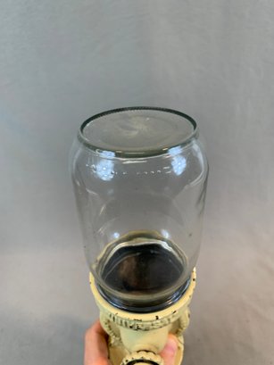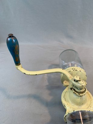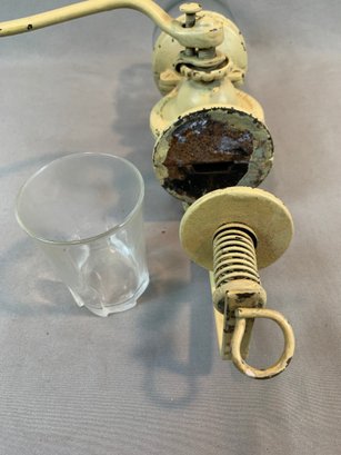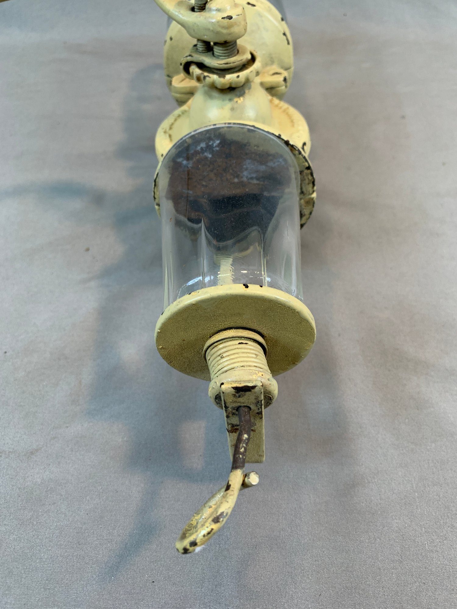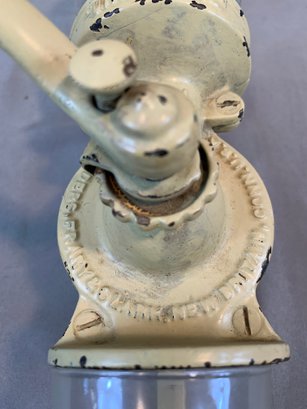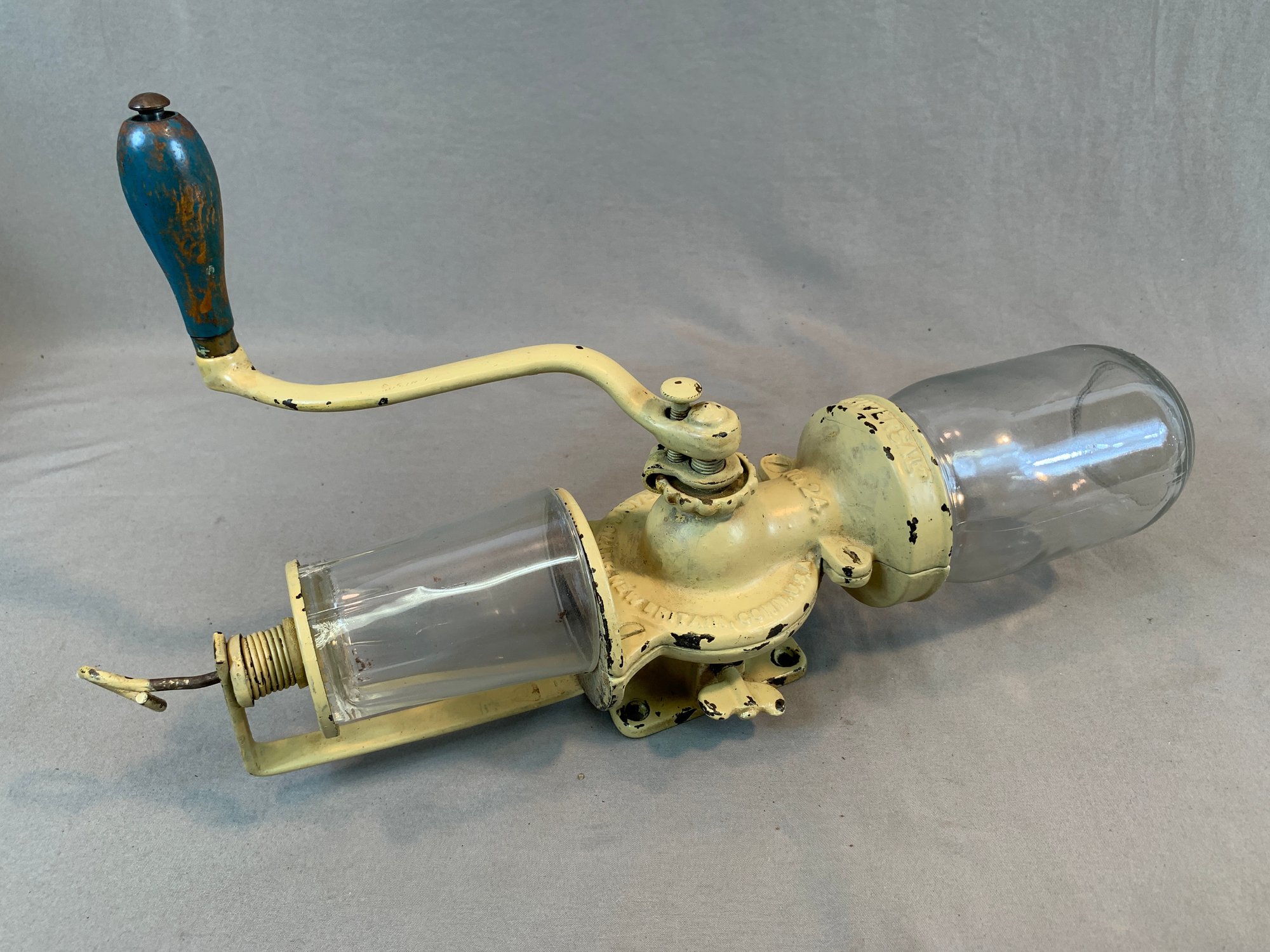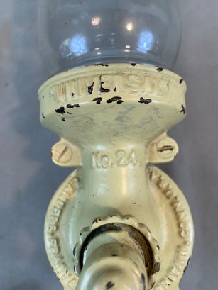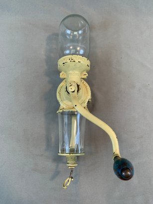 An antique cast iron wall-mount coffee grinder by Landers Frary & Clark, marked "Universal No. 24." Features cream-painted cast iron body, original glass bean hopper, glass catch cup, curved crank arm with turned wooden handle, and wall-mount bracket.