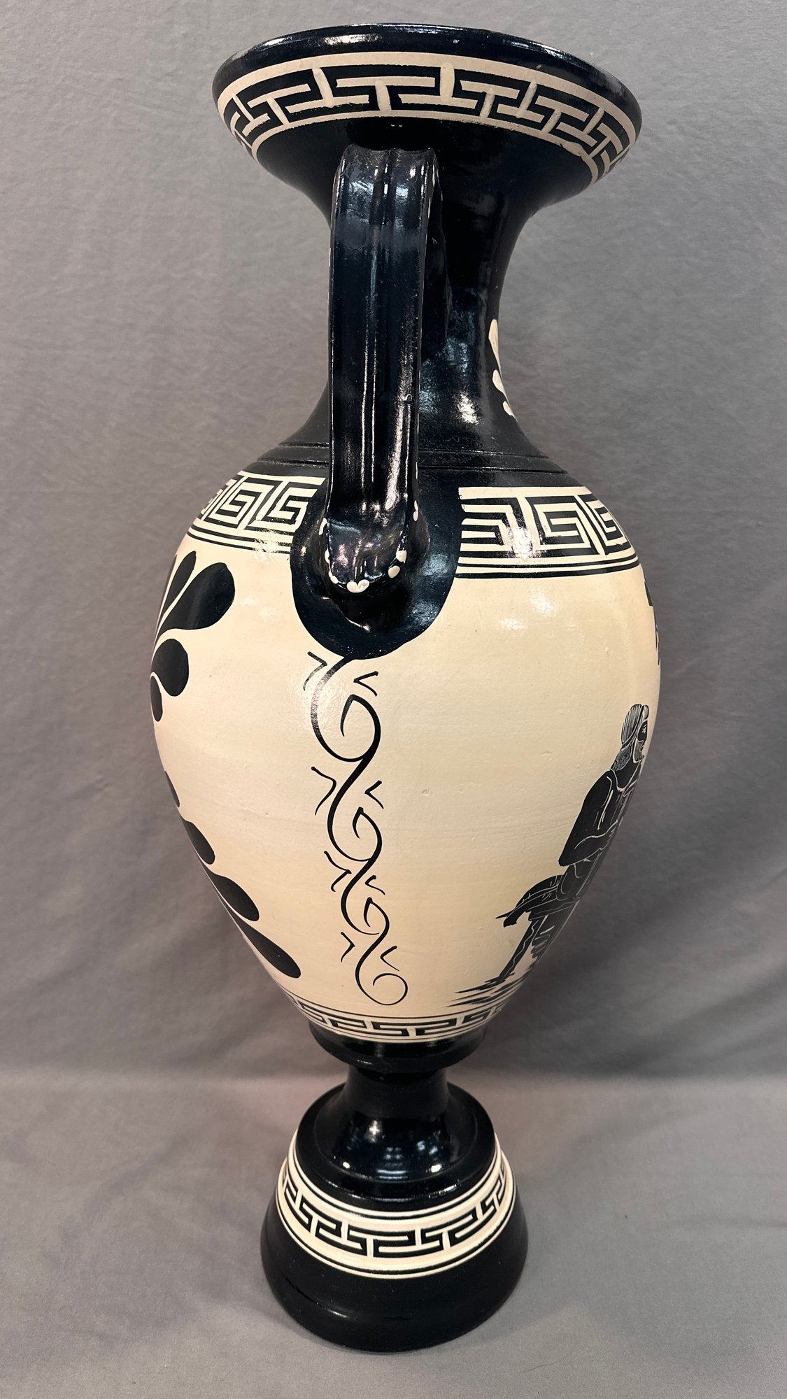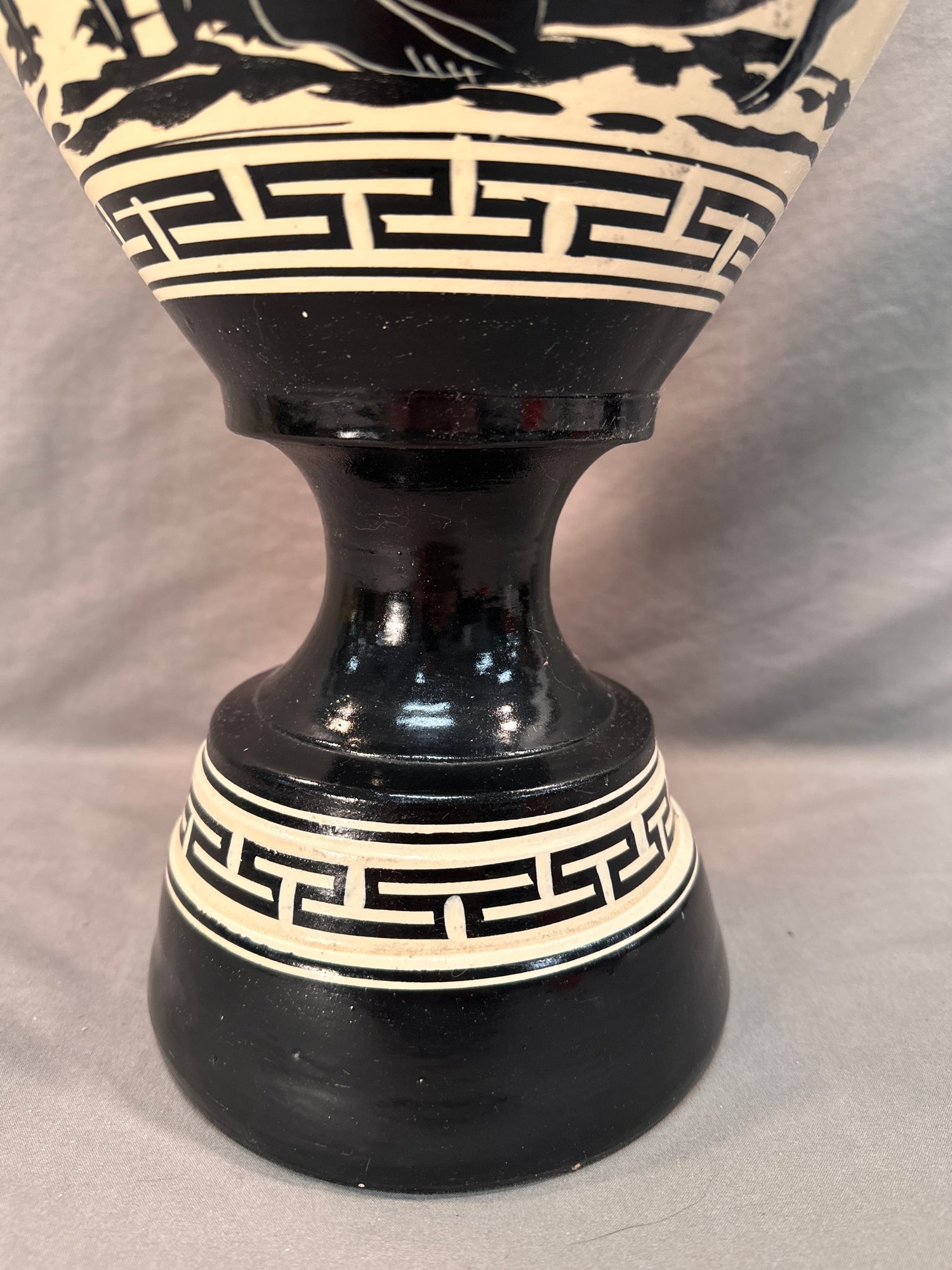 A double handled Grecian urn made of terracotta, hand painted depicting a classical greek scene with floral and scroll decoration. C. 1950's.
