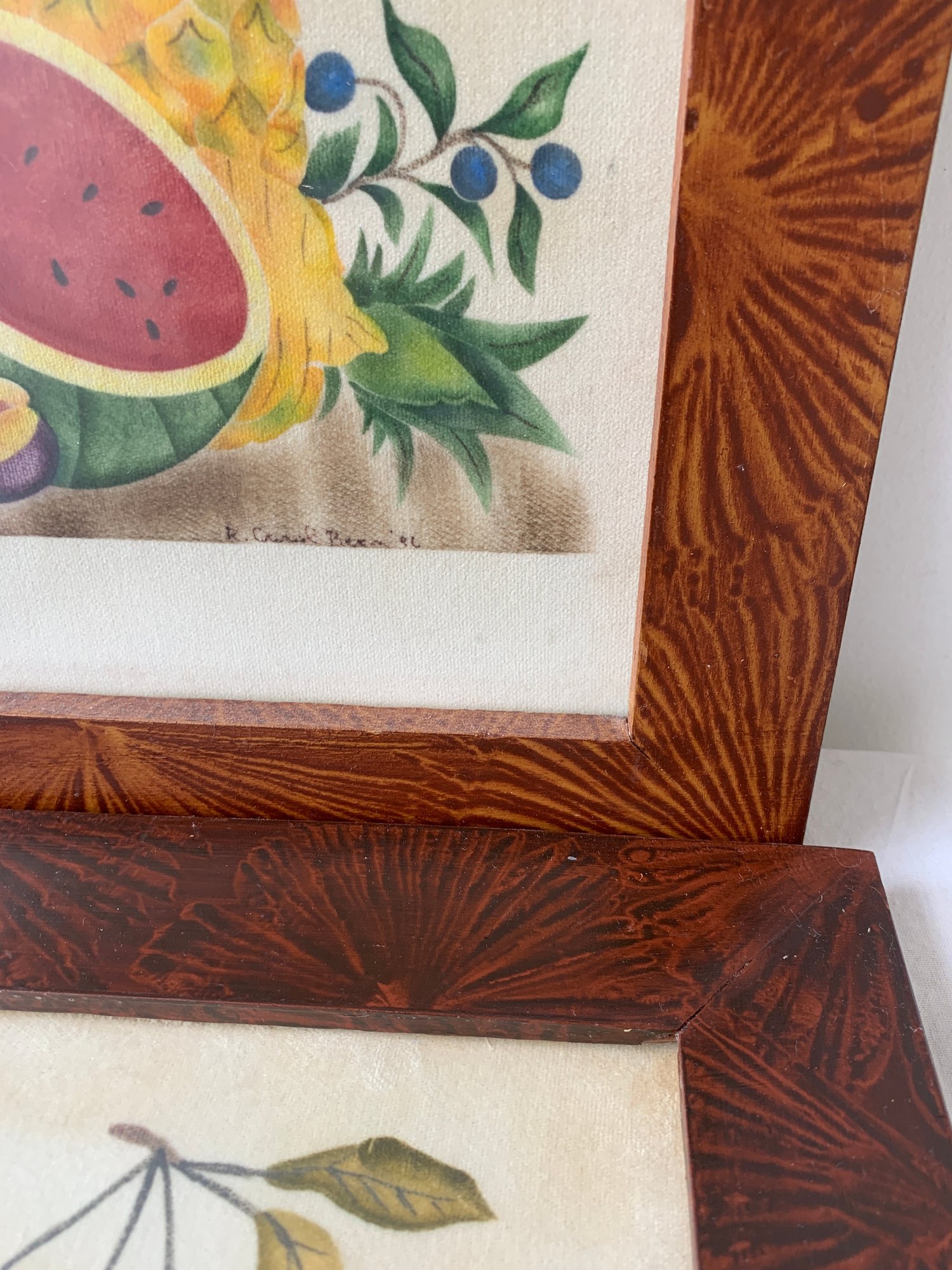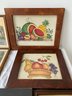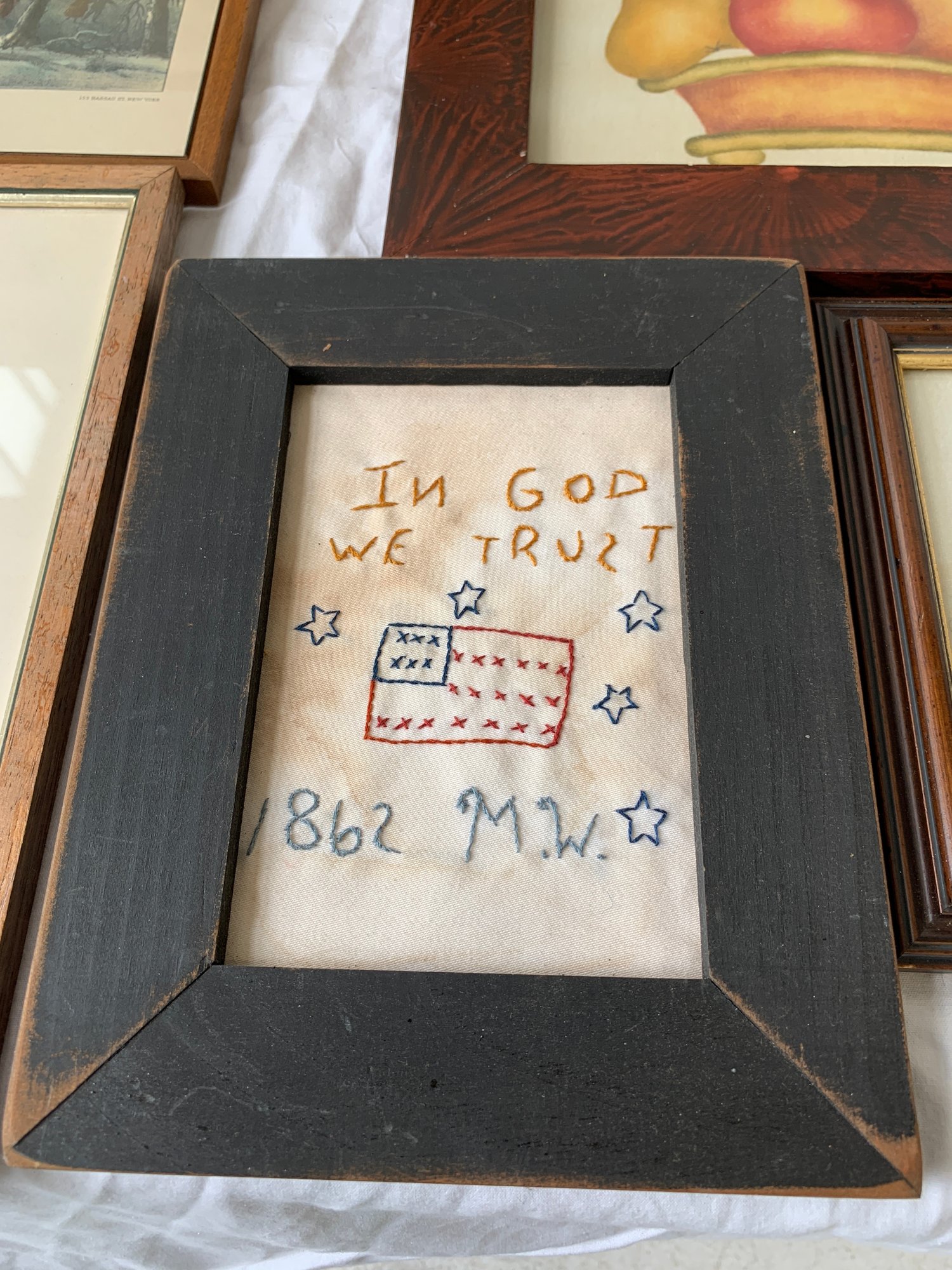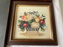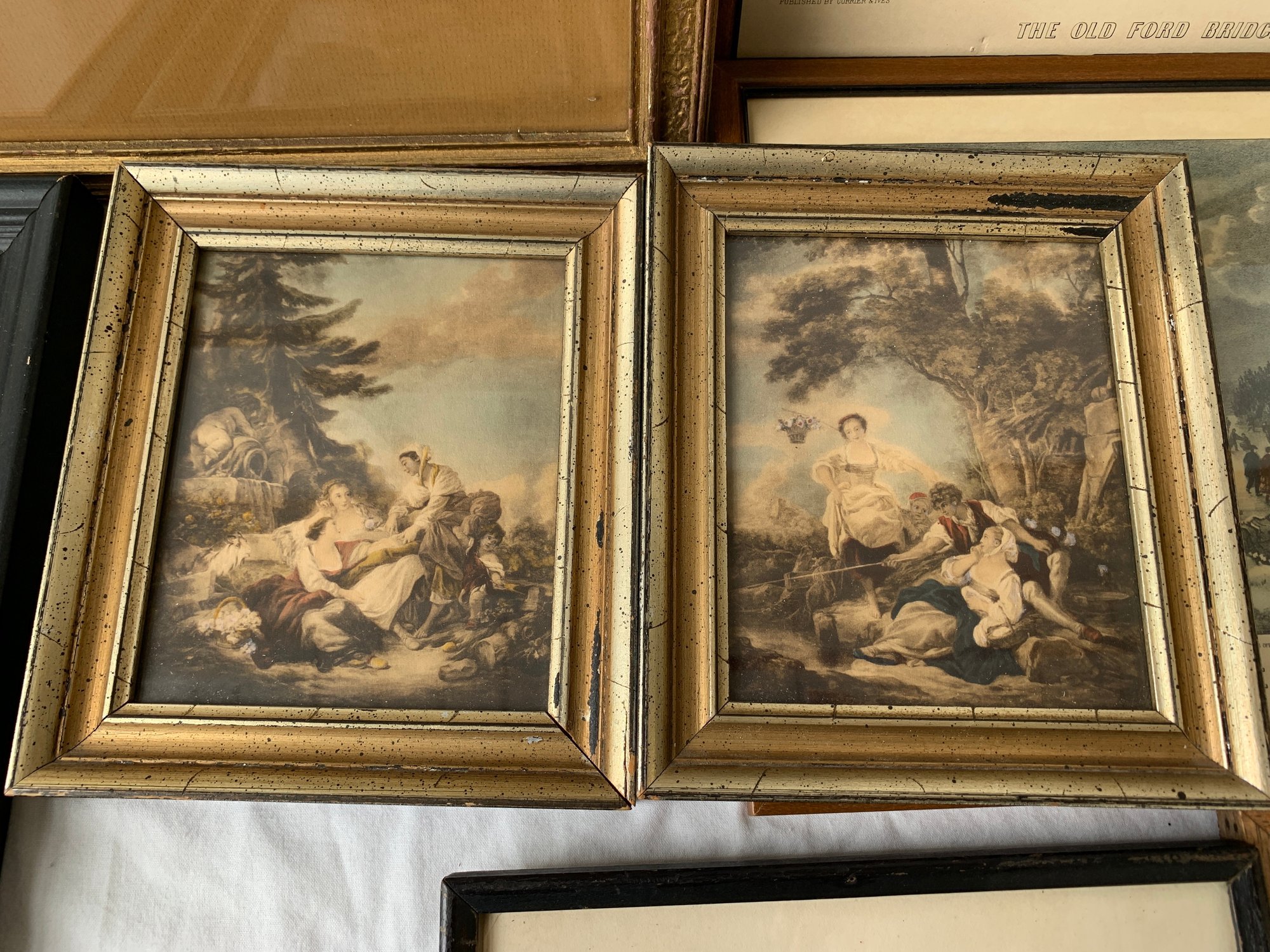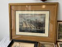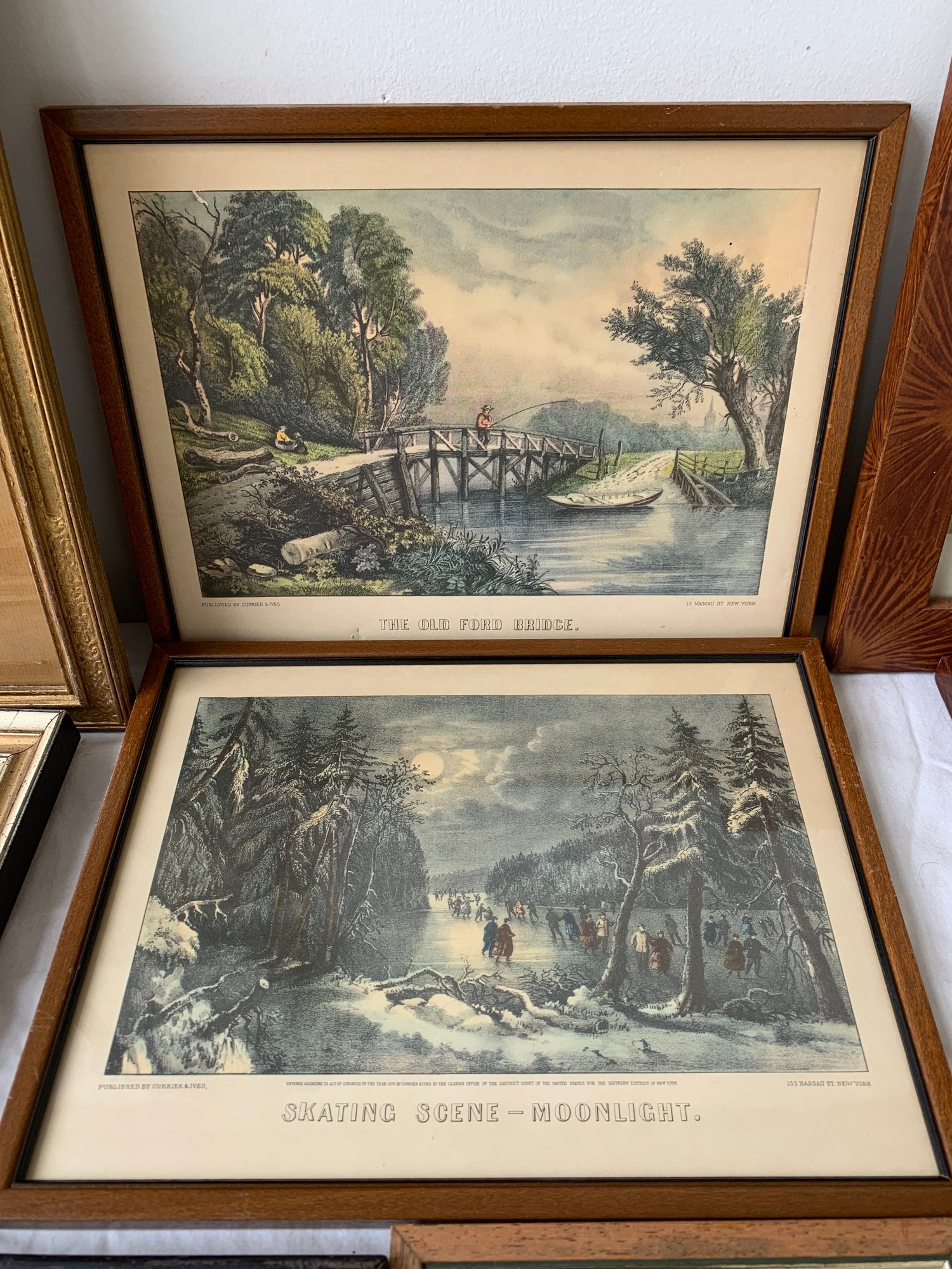 Lot of 14 antique/vintage framed pieces: Williamsburg Restoration Chippendale style mahogany scroll mirror, gold-framed nautical sailing lithograph, two Currier & Ives-style landscape prints ("Old Foot Bridge" & "Skating Scene Moonlight"), smaller sailing ship print, matched pair of fruit still lifes in grain painted frames, reproduction 1862 folk art "In God We Trust" sampler, Birdsey print, sailing print, pastoral print, still life print, and small fruit basket theorem style artwork. Assorted frames, varied condition.
