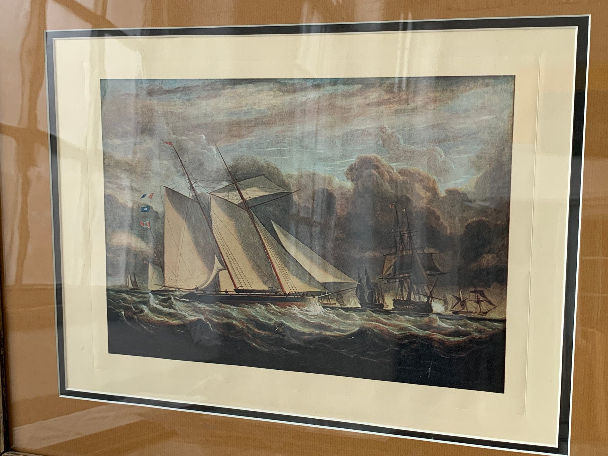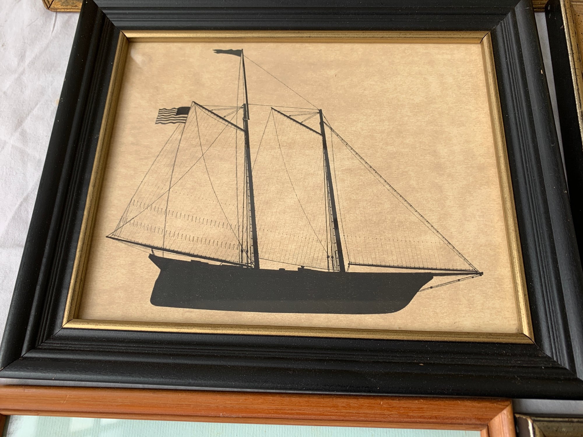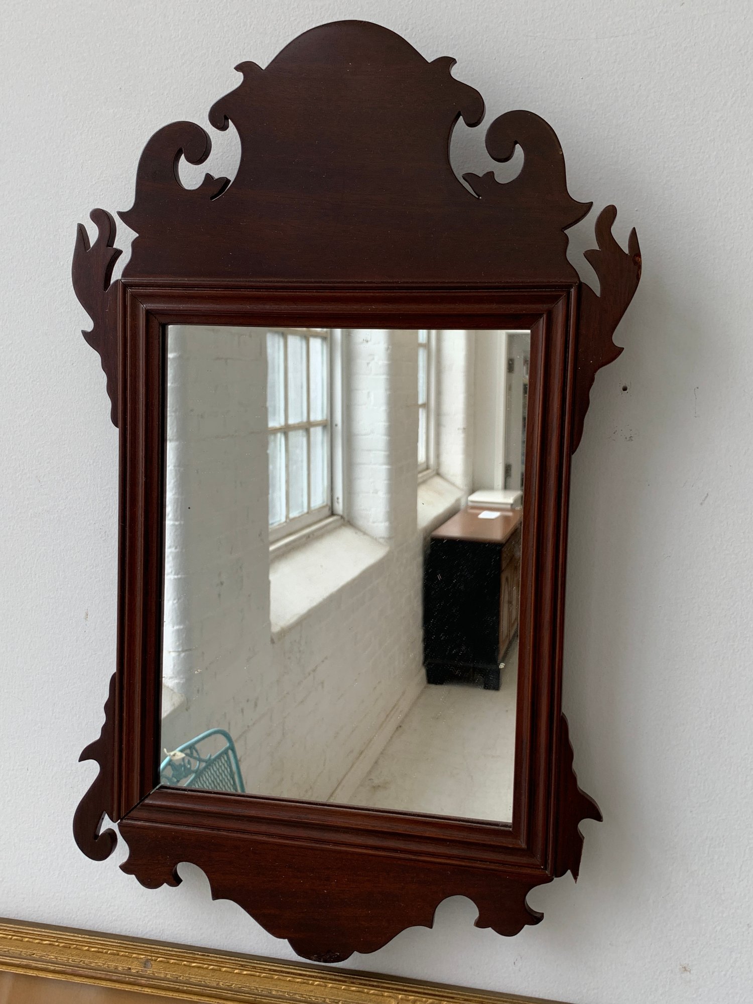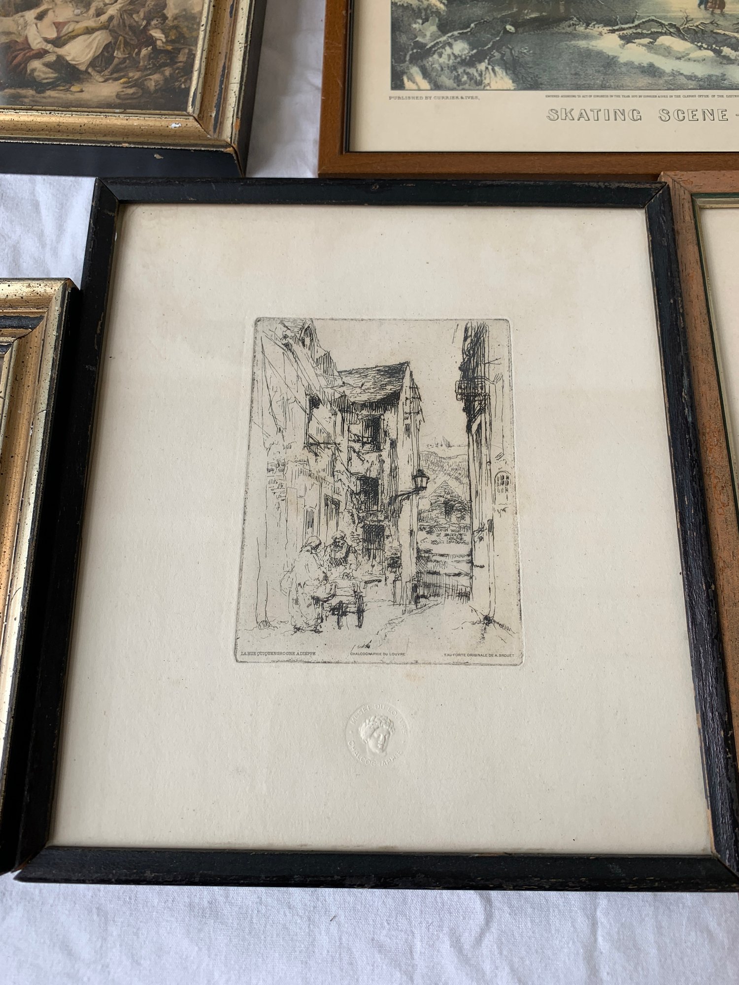 Lot of 14 antique/vintage framed pieces: Williamsburg Restoration Chippendale style mahogany scroll mirror, gold-framed nautical sailing lithograph, two Currier & Ives-style landscape prints ("Old Foot Bridge" & "Skating Scene Moonlight"), smaller sailing ship print, matched pair of fruit still lifes in grain painted frames, reproduction 1862 folk art "In God We Trust" sampler, Birdsey print, sailing print, pastoral print, still life print, and small fruit basket theorem style artwork. Assorted frames, varied condition.