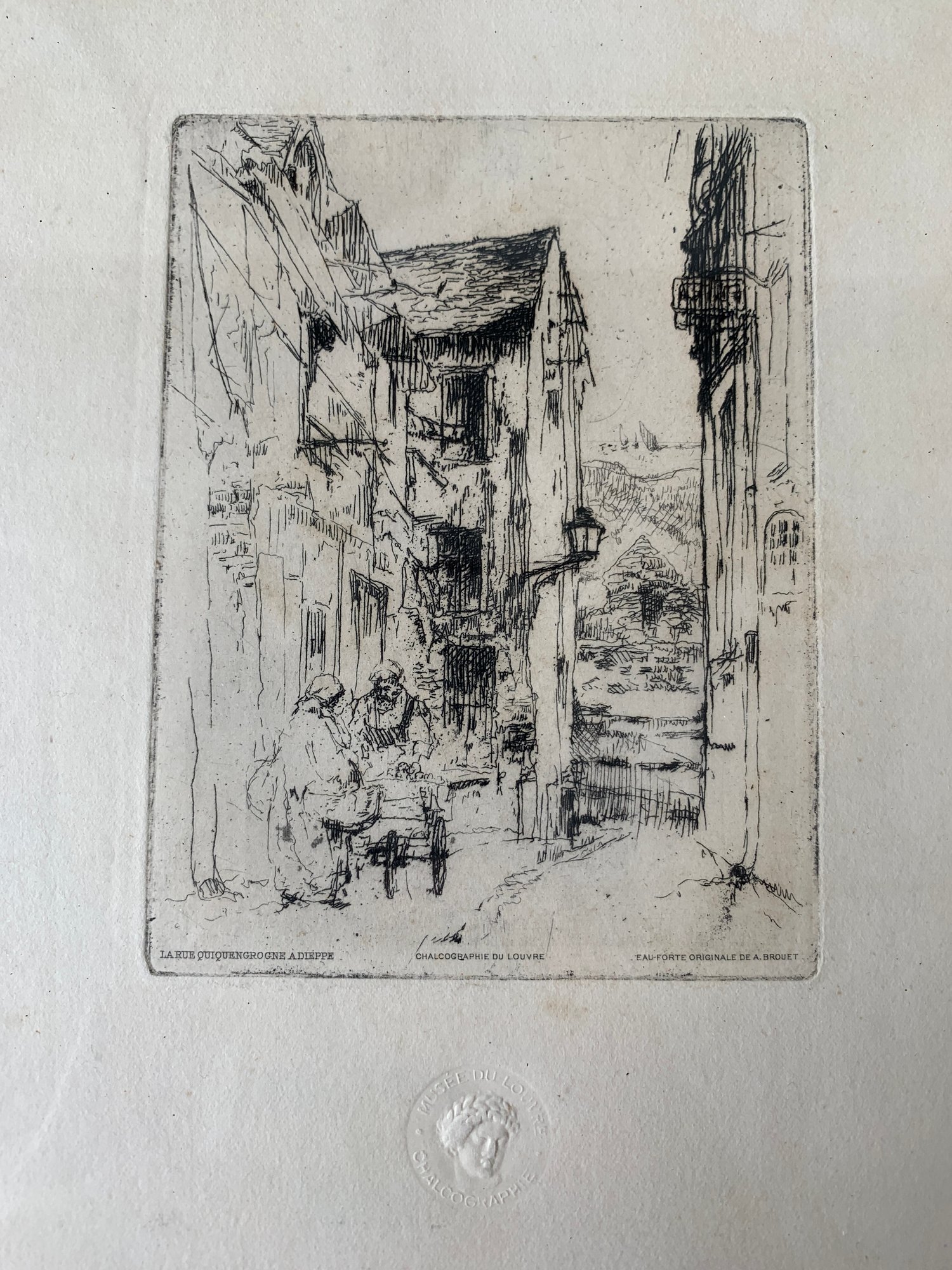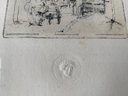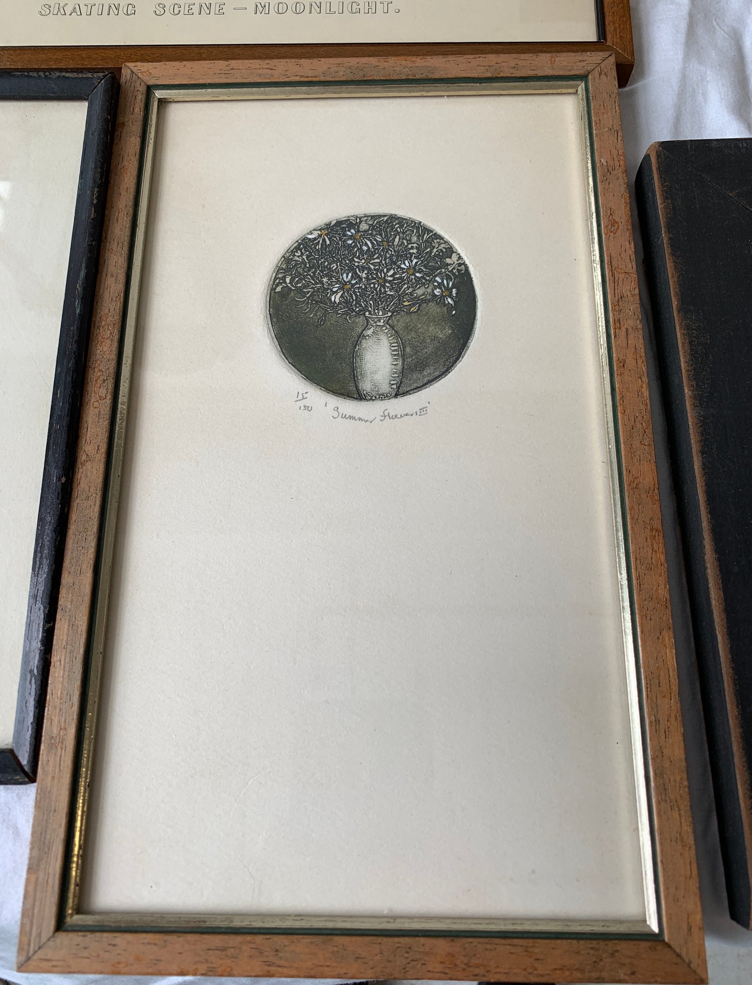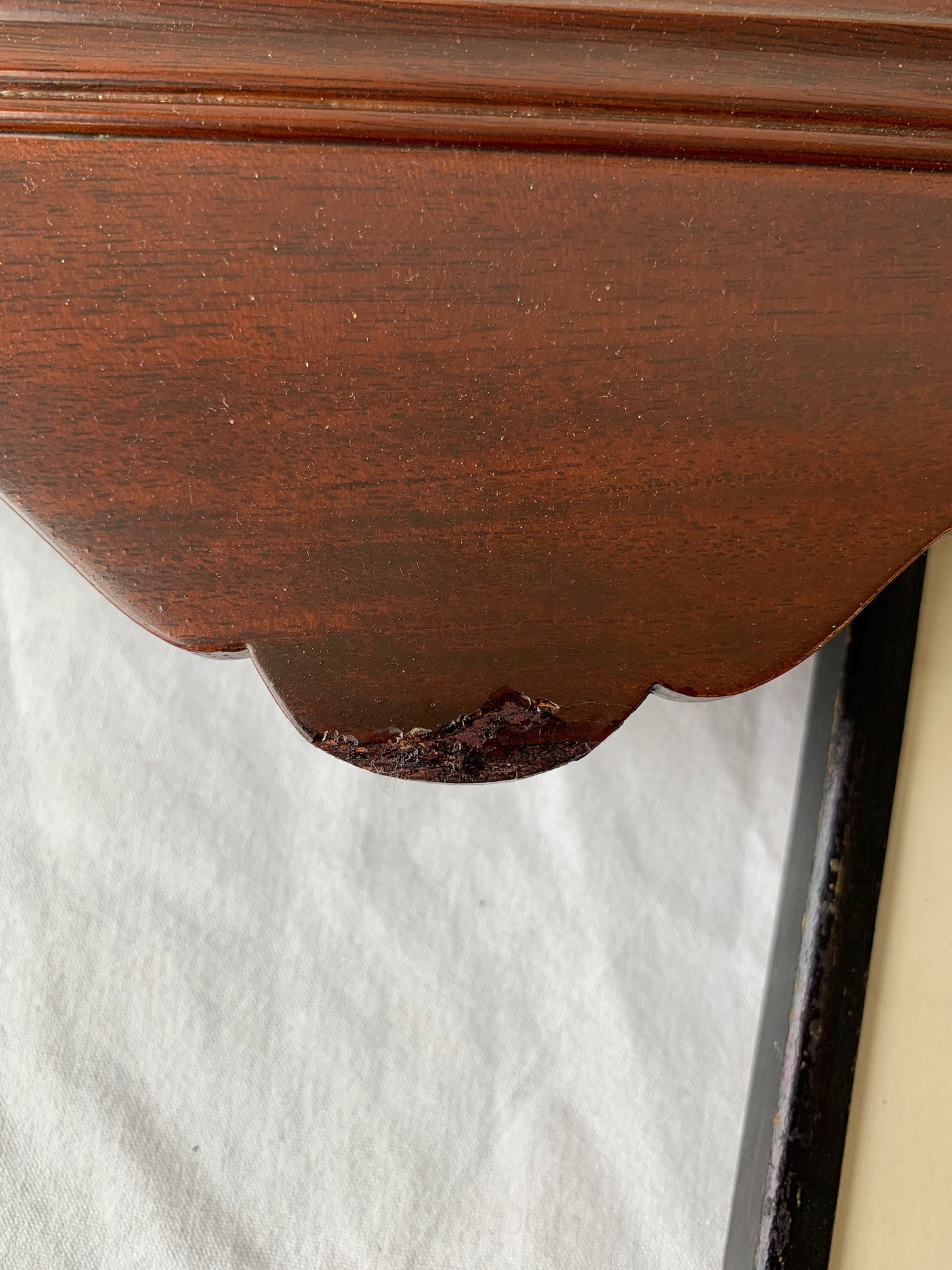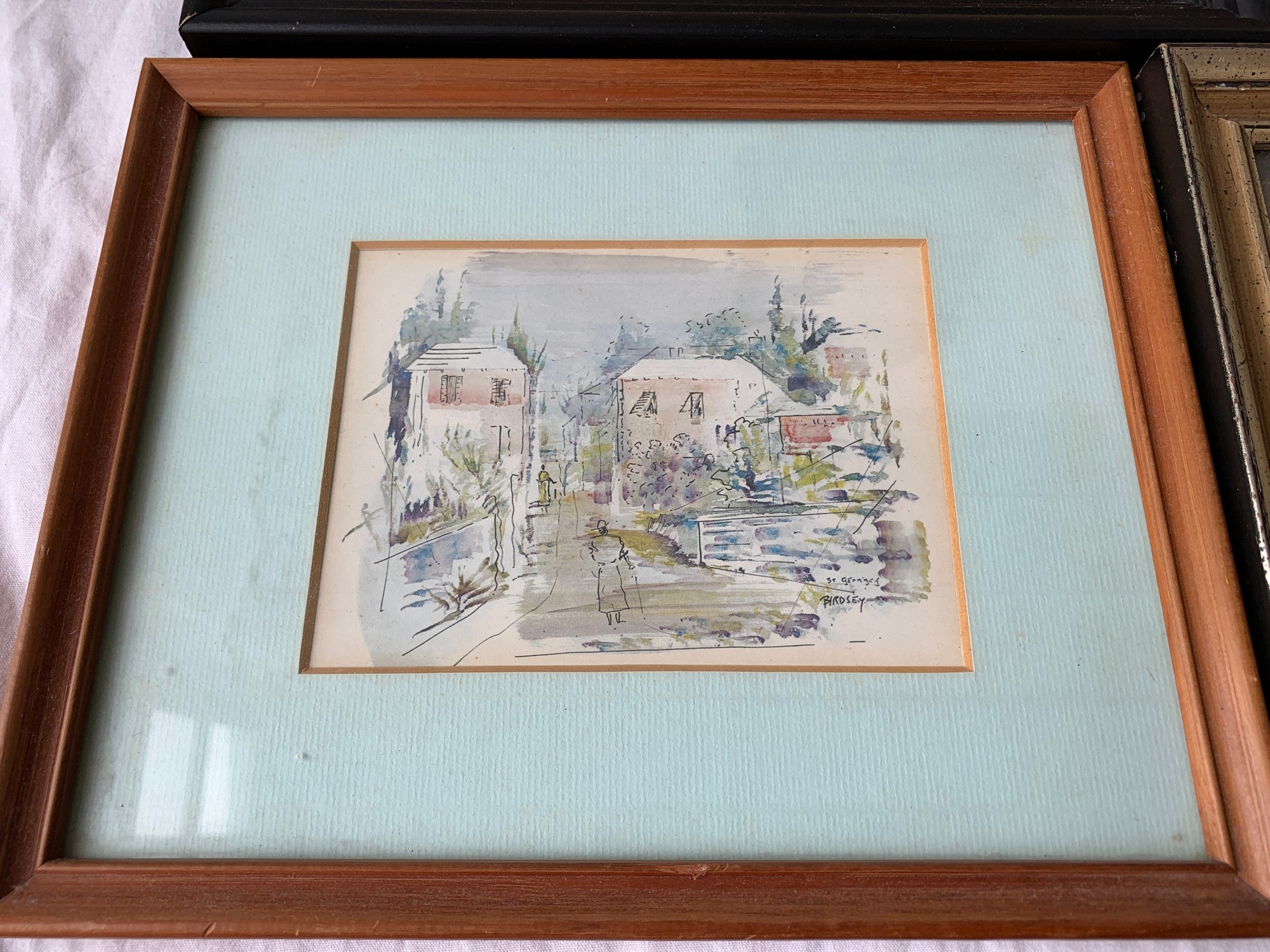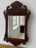 Lot of 14 antique/vintage framed pieces: Williamsburg Restoration Chippendale style mahogany scroll mirror, gold-framed nautical sailing lithograph, two Currier & Ives-style landscape prints ("Old Foot Bridge" & "Skating Scene Moonlight"), smaller sailing ship print, matched pair of fruit still lifes in grain painted frames, reproduction 1862 folk art "In God We Trust" sampler, Birdsey print, sailing print, pastoral print, still life print, and small fruit basket theorem style artwork. Assorted frames, varied condition.