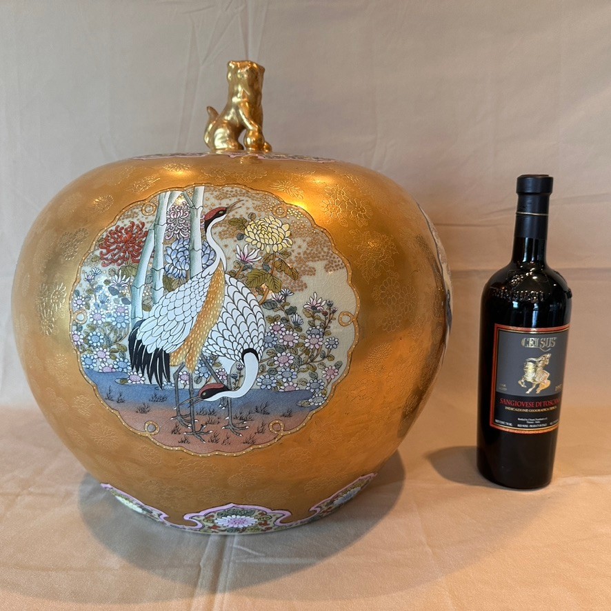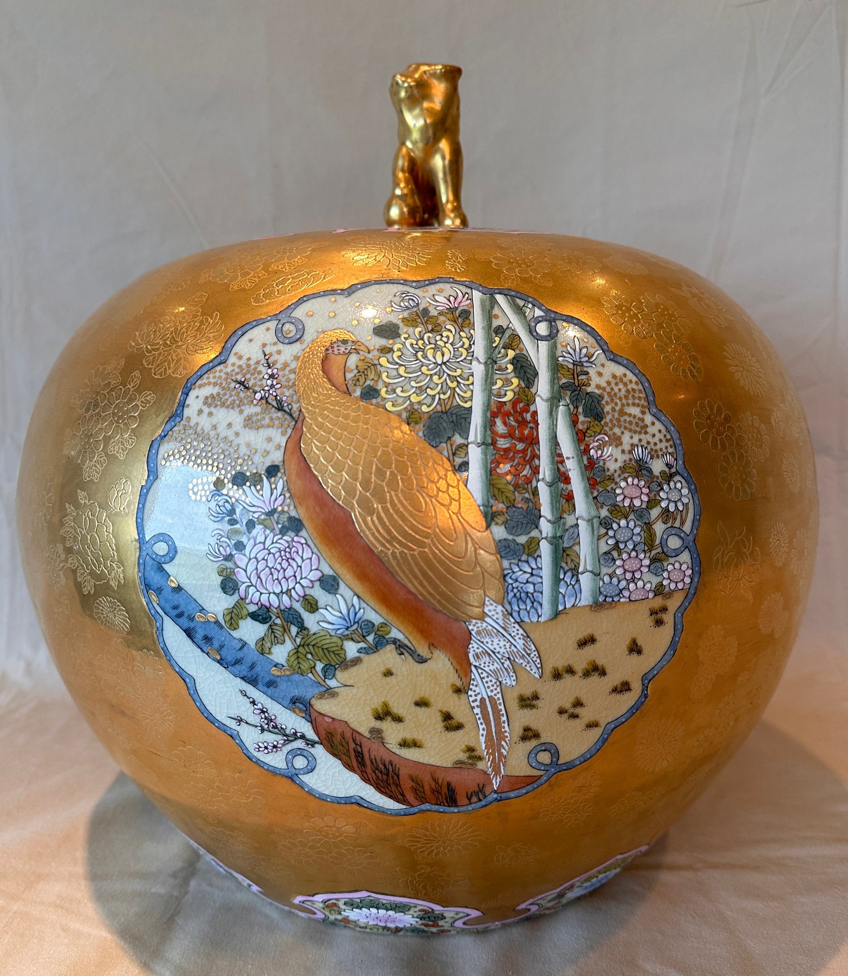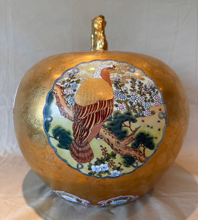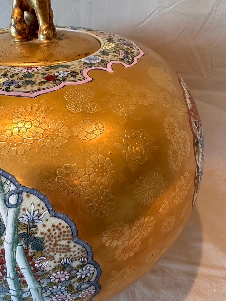 Highly decorative Japanese Satsuma ginger jar featuring a richly painted gold leaf background and four detailed scenes of birds in their natural habitats. The jar is further embellished with a lotus motif around the base and floral decoration around the top. Finished with a traditional Fu Dog finial on the lid.