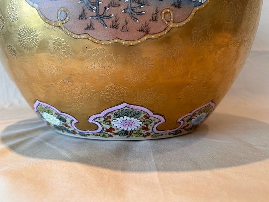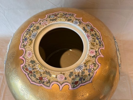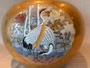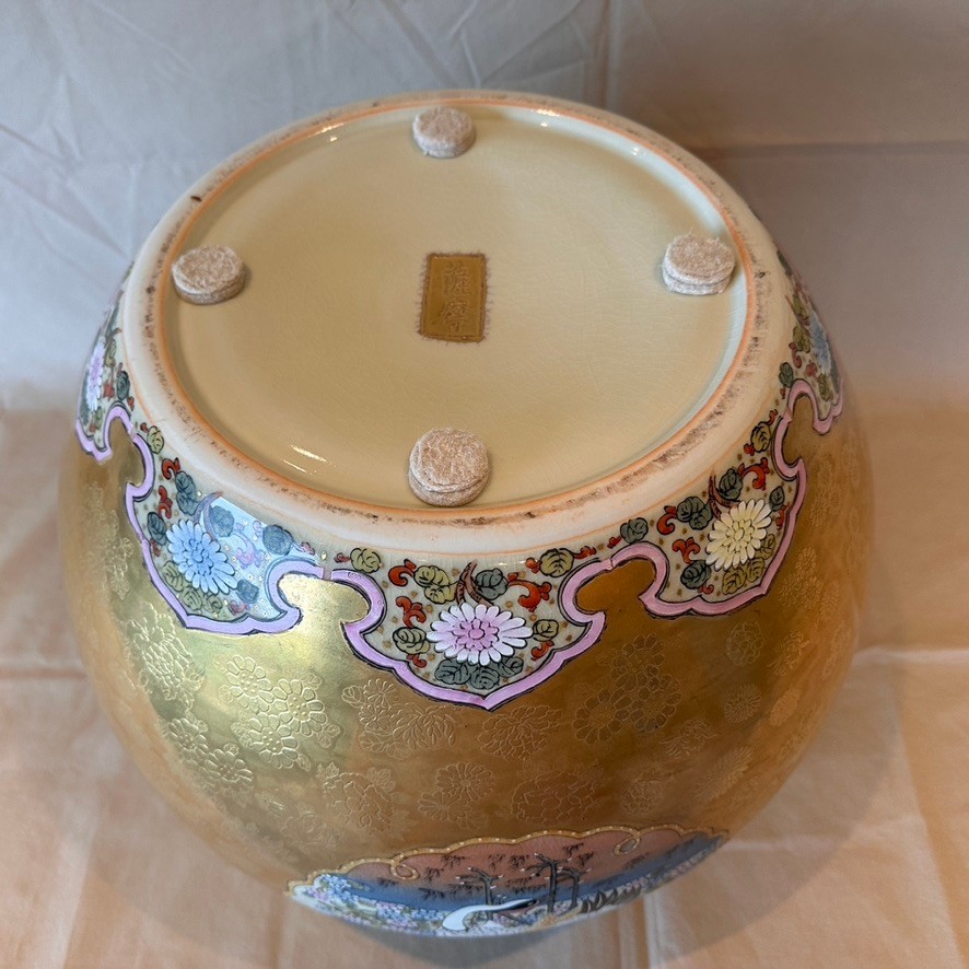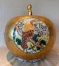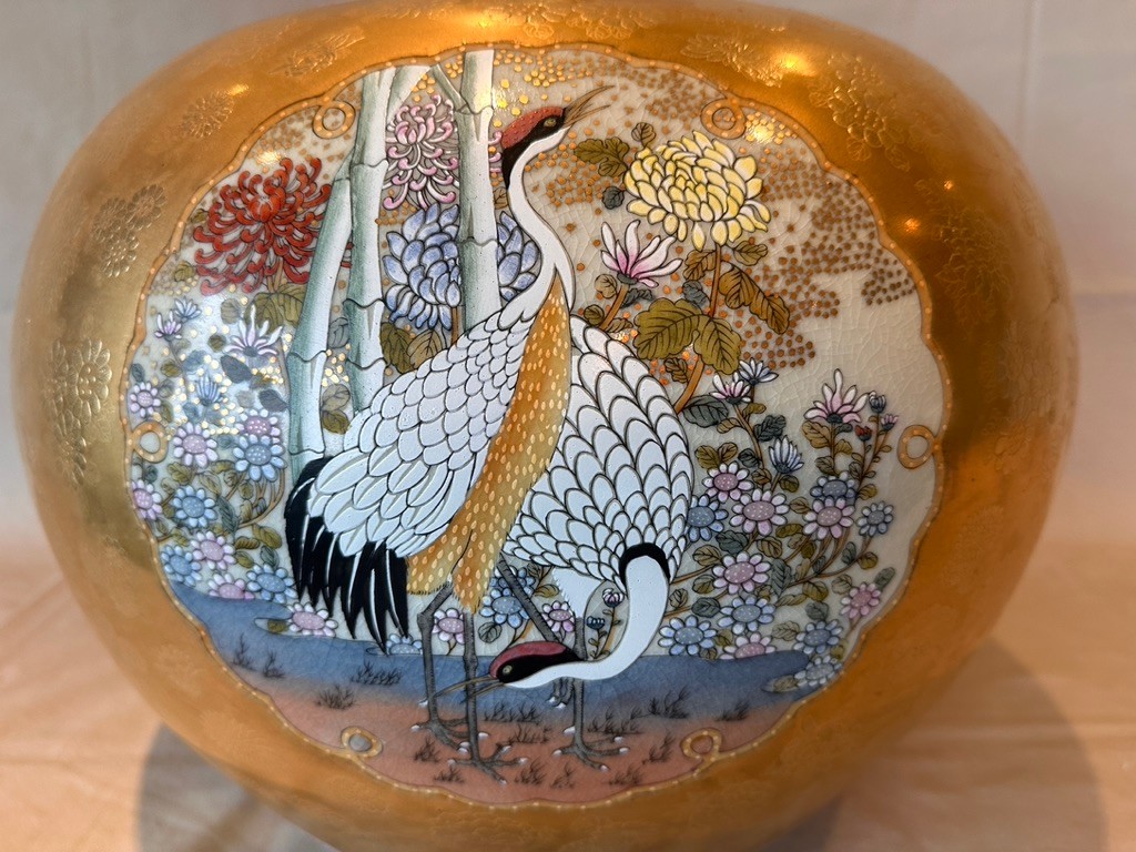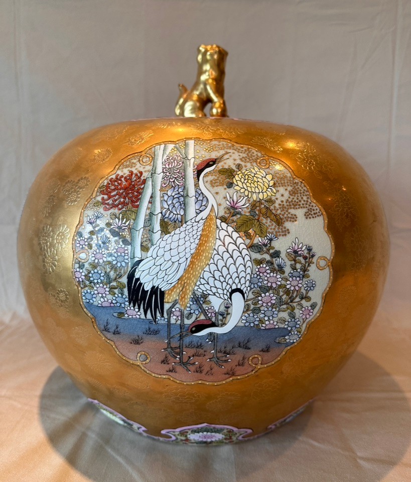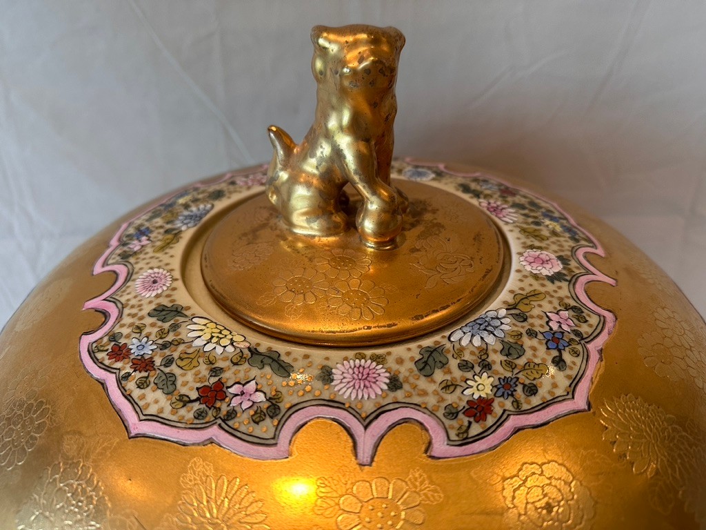 Highly decorative Japanese Satsuma ginger jar featuring a richly painted gold leaf background and four detailed scenes of birds in their natural habitats. The jar is further embellished with a lotus motif around the base and floral decoration around the top. Finished with a traditional Fu Dog finial on the lid.