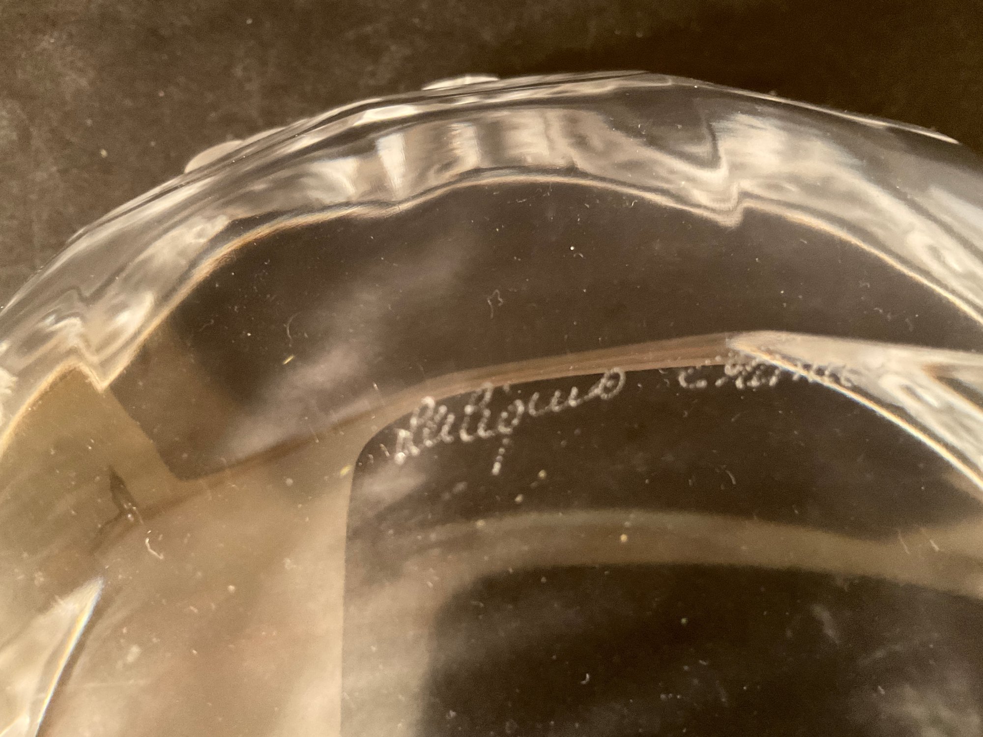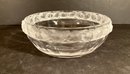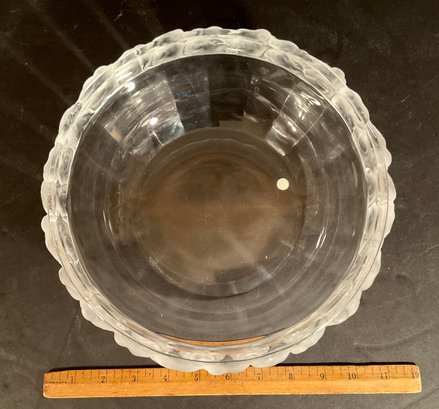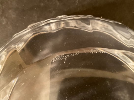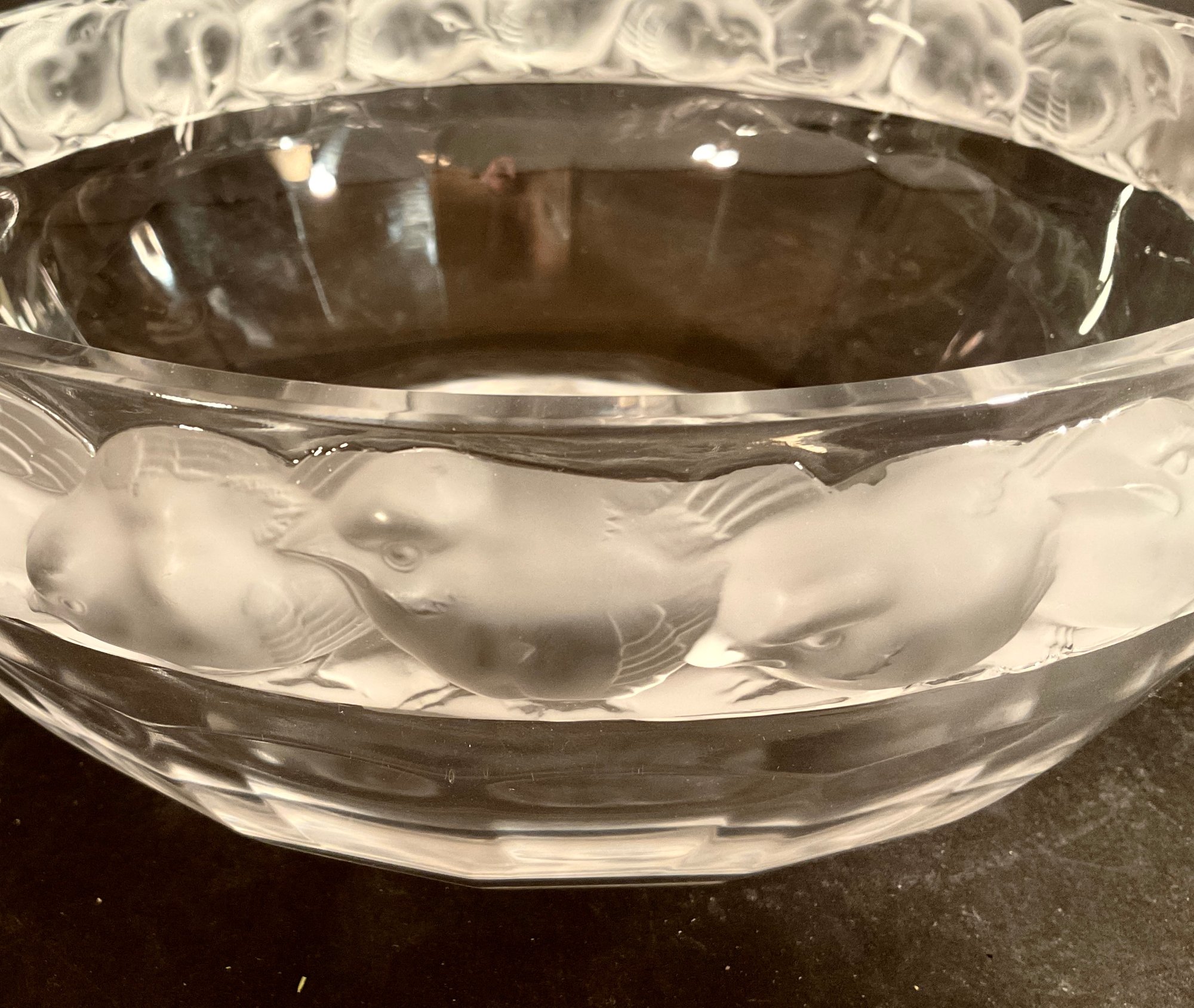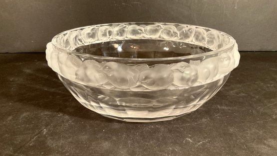 A beautiful Lalique crystal bowl with decorated frosted rim of birds. Signed on base in script.
