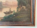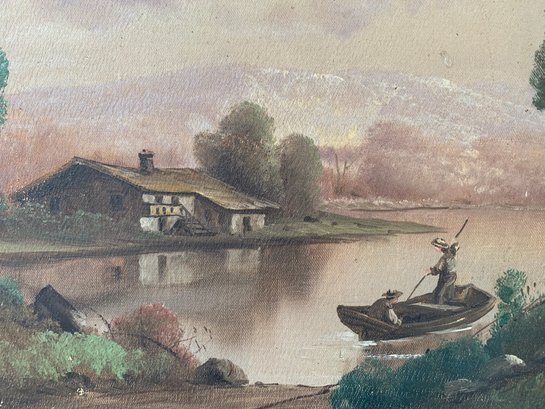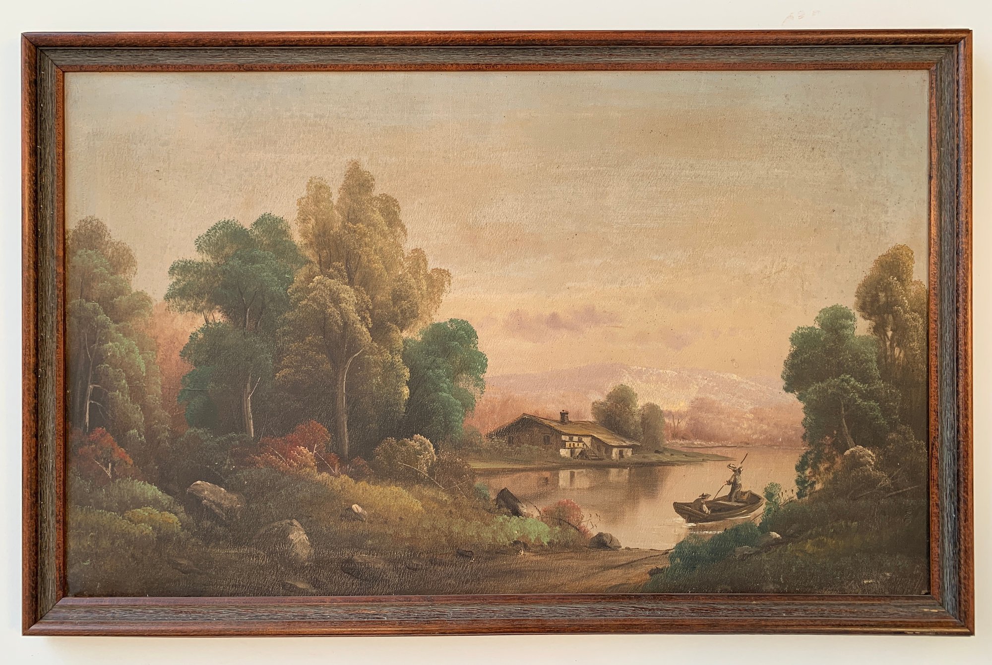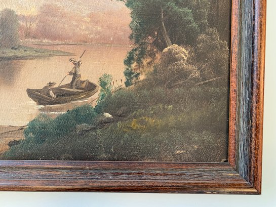An unsigned oil on canvas depicting two figures in a boat on a calm river, with a house visible in the background. Typical British landscape of the period. Frame in the style of the period.