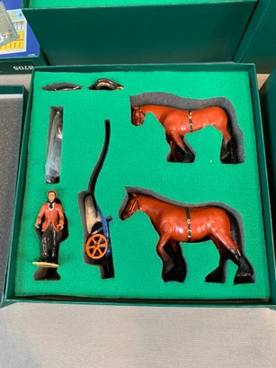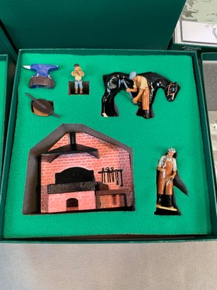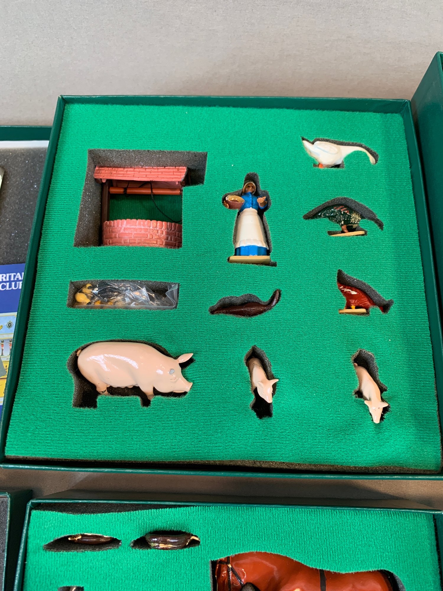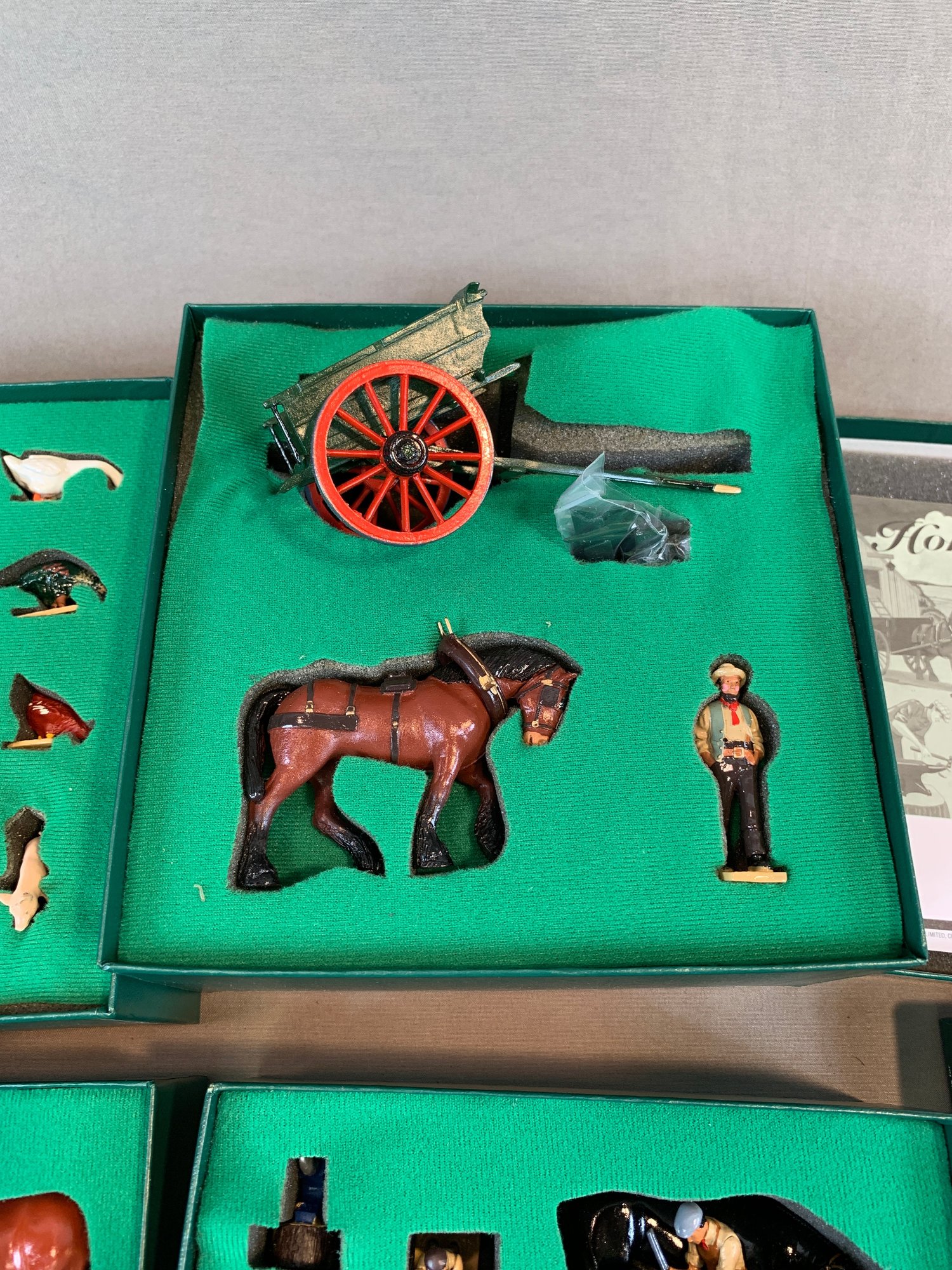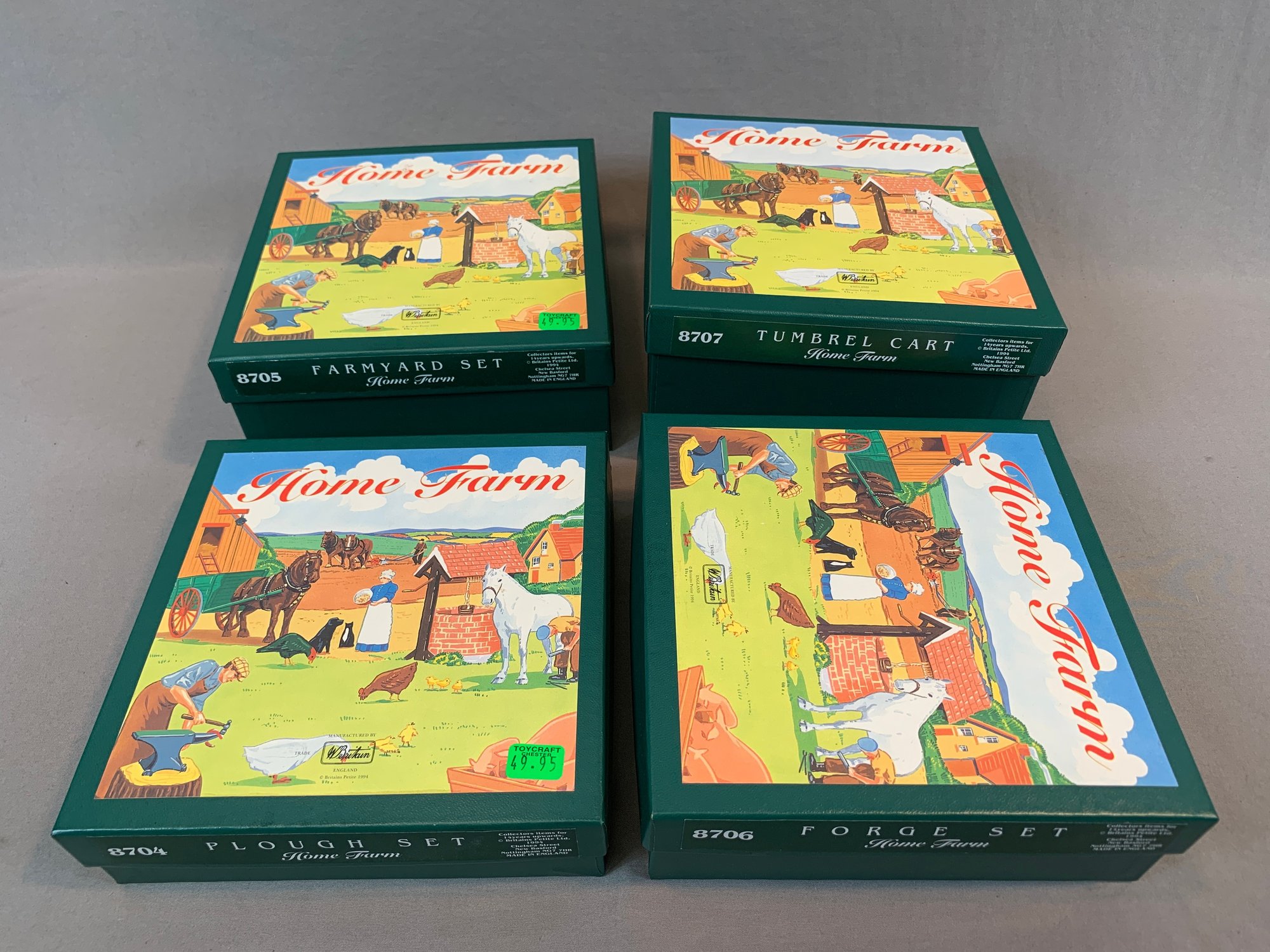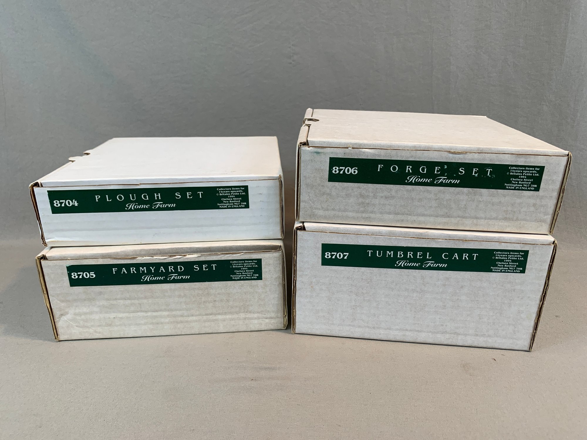 Four Britains Home Farm collector sets in original boxes comprising No. 8704 Plough Set, No. 8705 Farmyard Set, No. 8706 Forge Set, and No. 8707 Tumbrel Cart. Sets include hand-painted metal figures, draft horses, farm animals, vehicles, and accessories. Original boxes, inserts, booklets, and paperwork included.