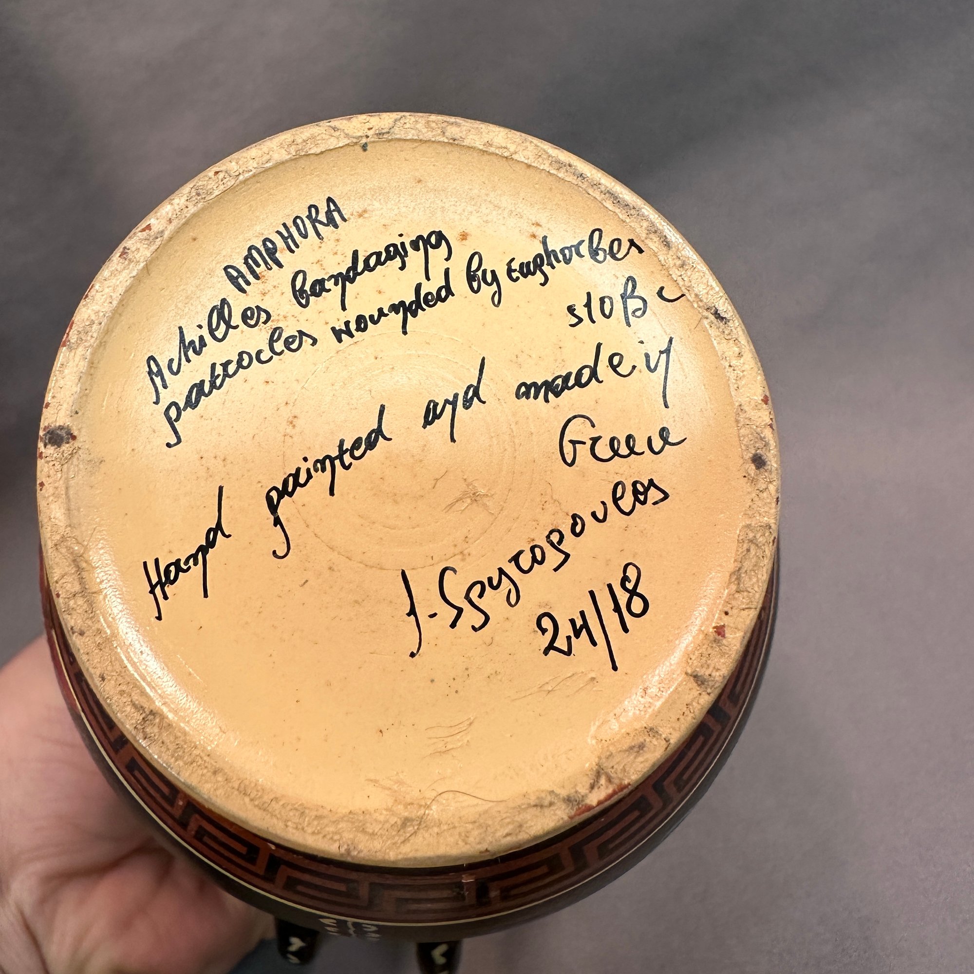 Including 4 hand painted wall plates (9" Diameter, 7.5" Diameter), a hand painted ceramic vessel (7" H), and a double handled ceramic urn with gold trim (8" H). All made in Greece.