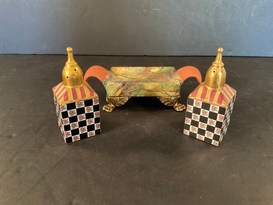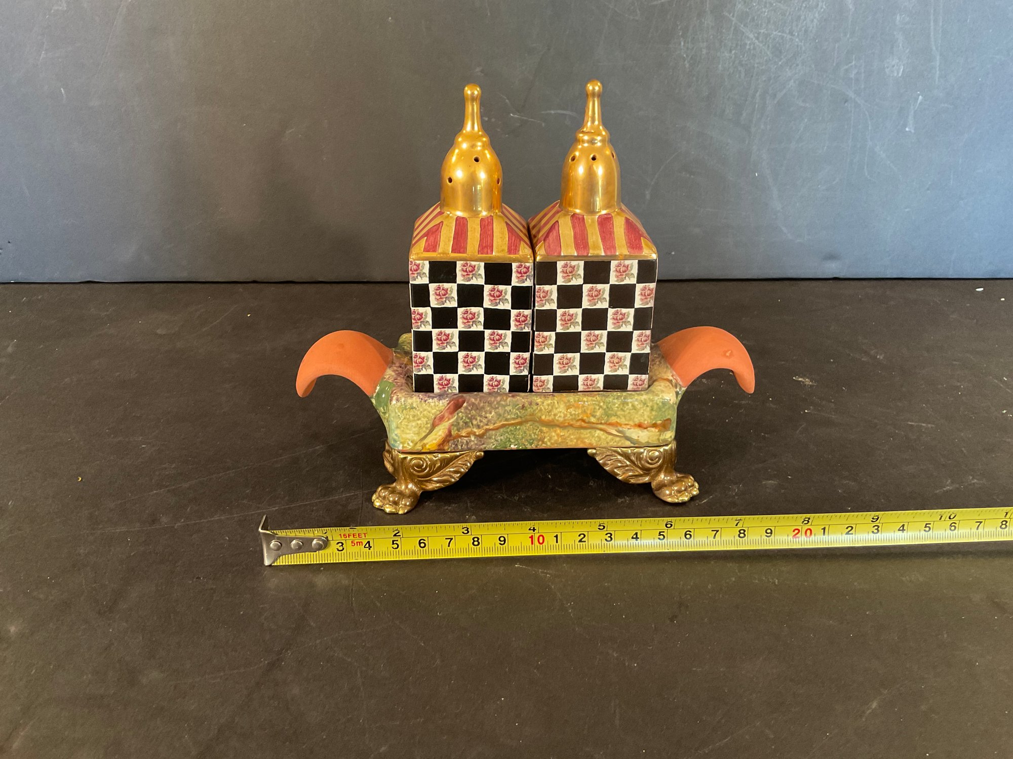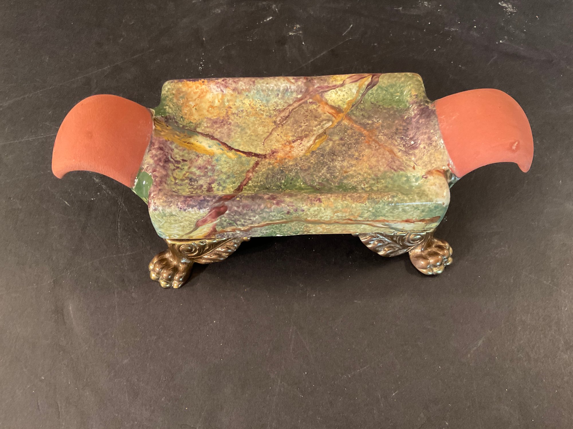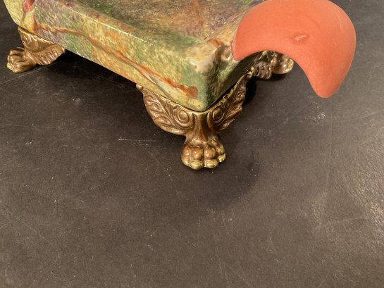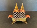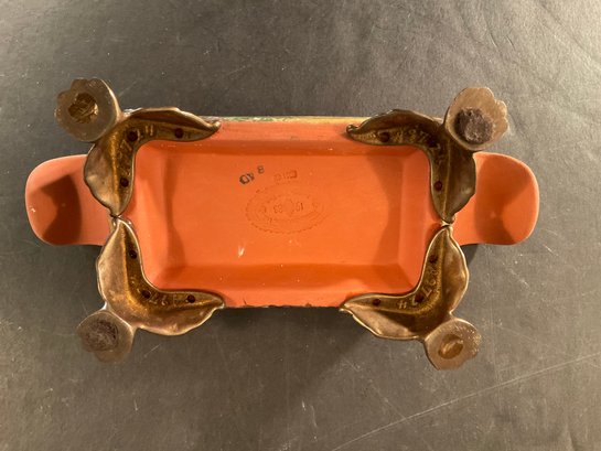 This set has brass feet, and is very colorful with a good glaze. Stamped on the bottom. Out of production and can only be bought on the secondary market.
