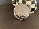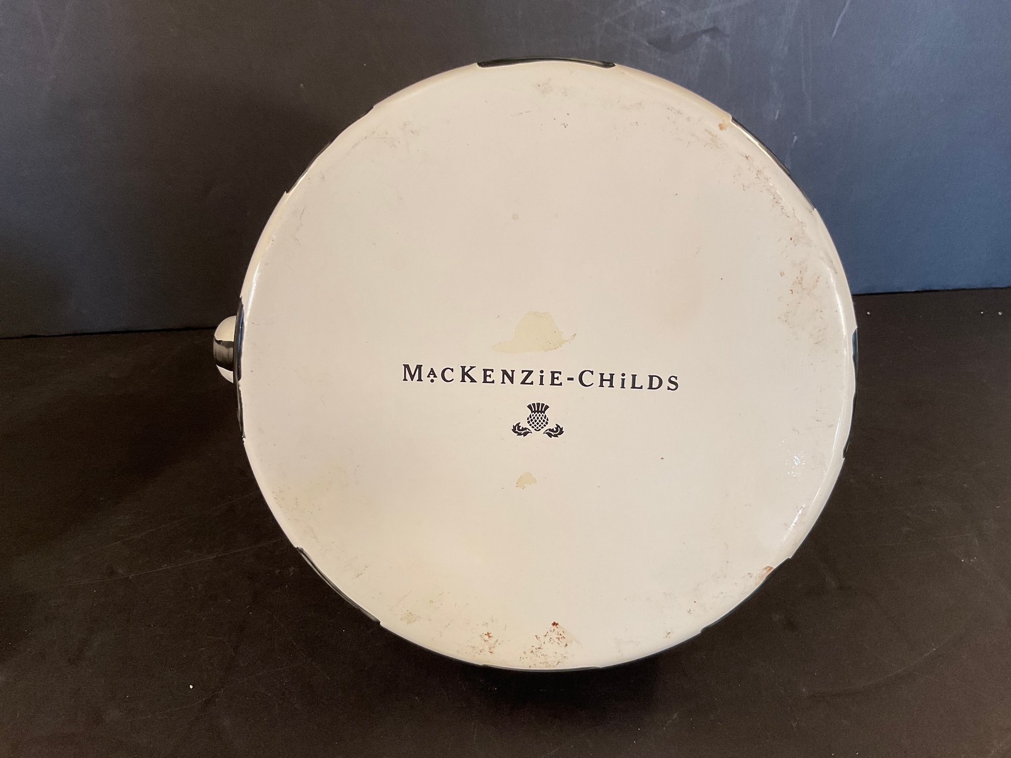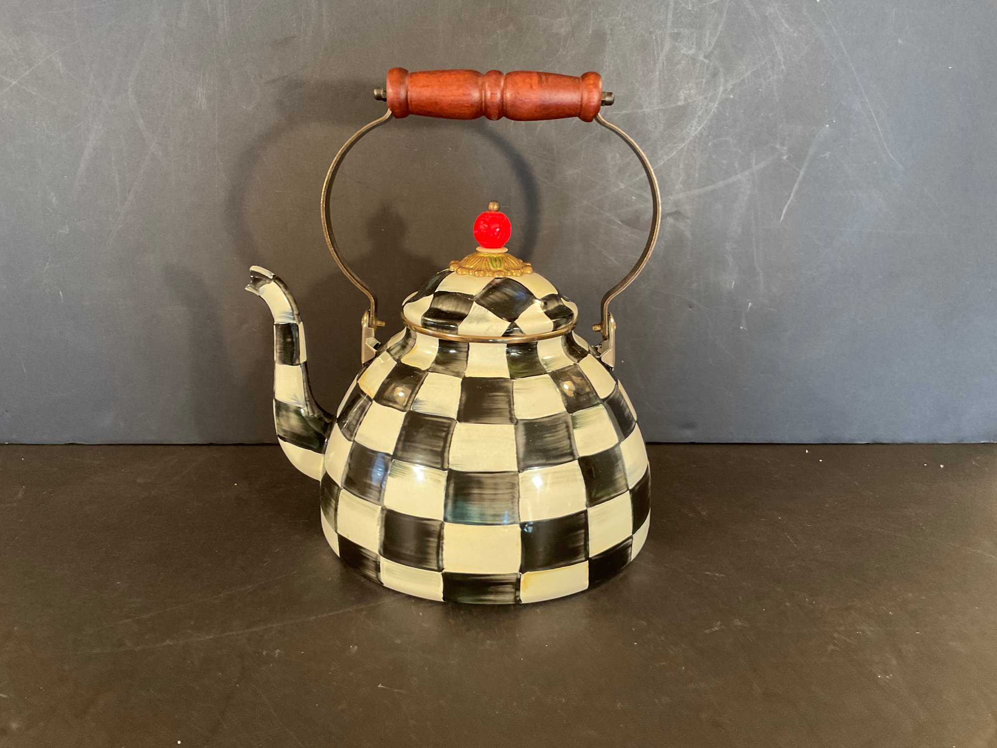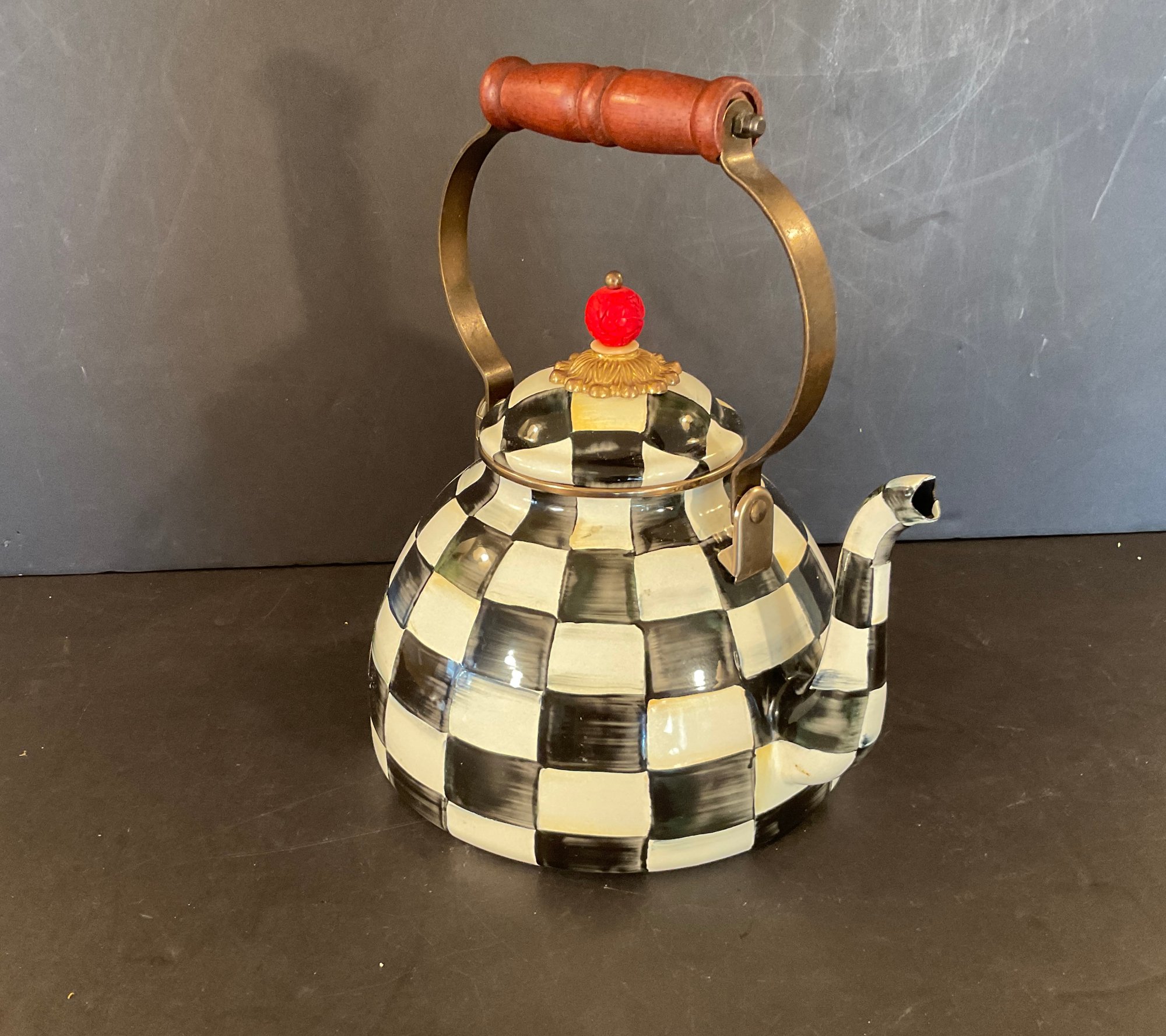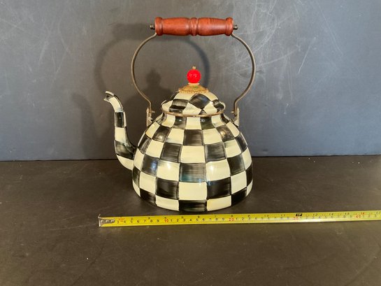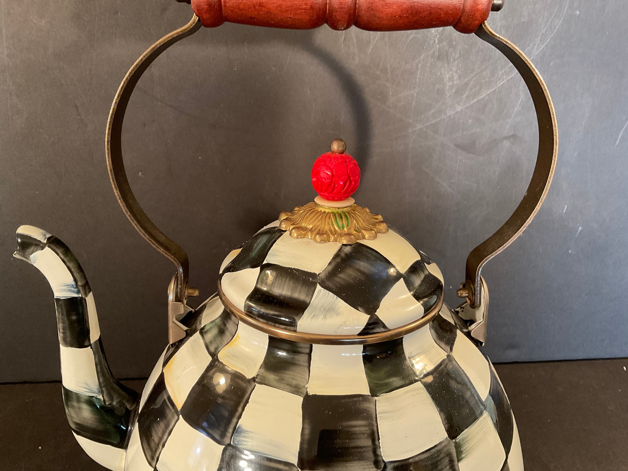A courtly check pattern metal tea kettle with cinnabar finial. Signed on the bottom.