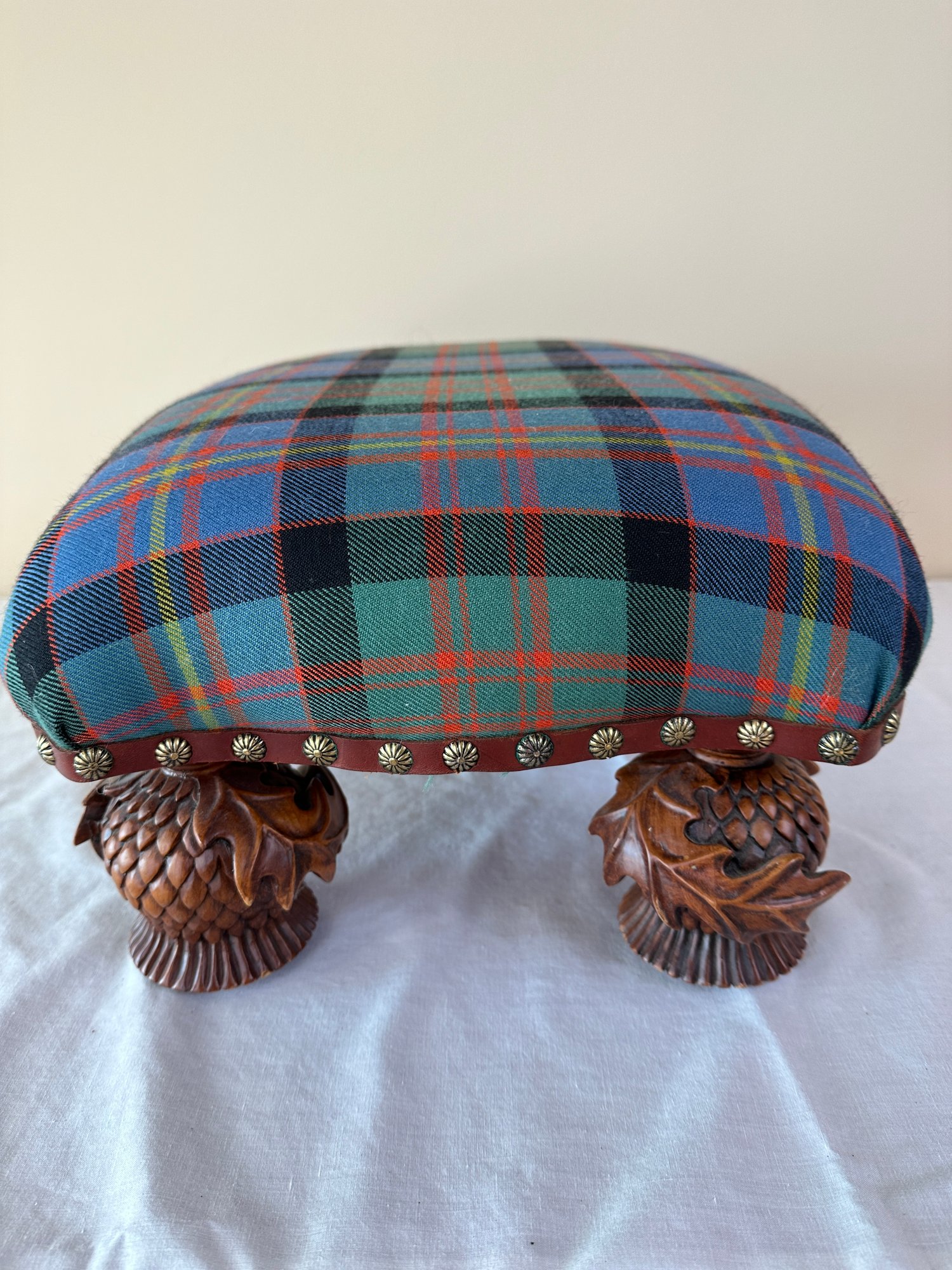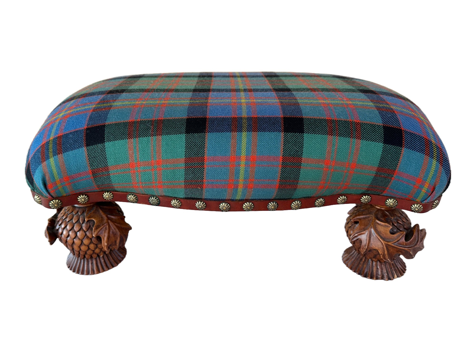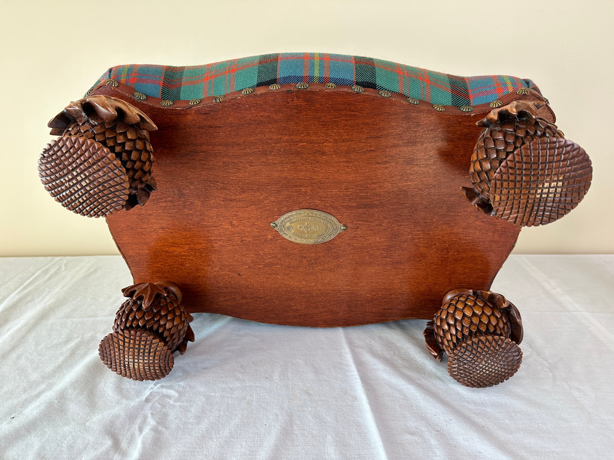 In plaid upholstery seated on decorative carved pine cone feet. Signed brass plaque underneath.