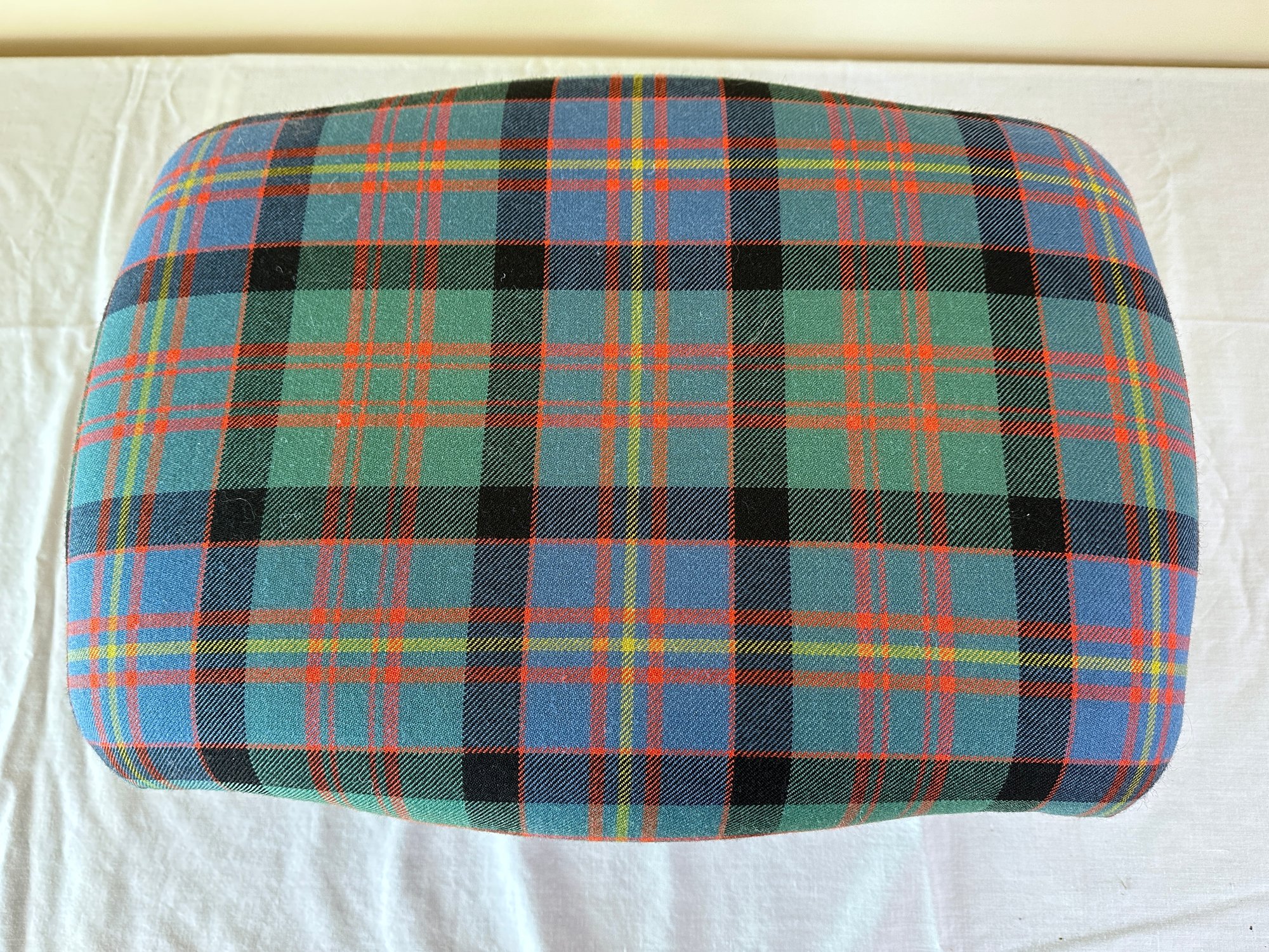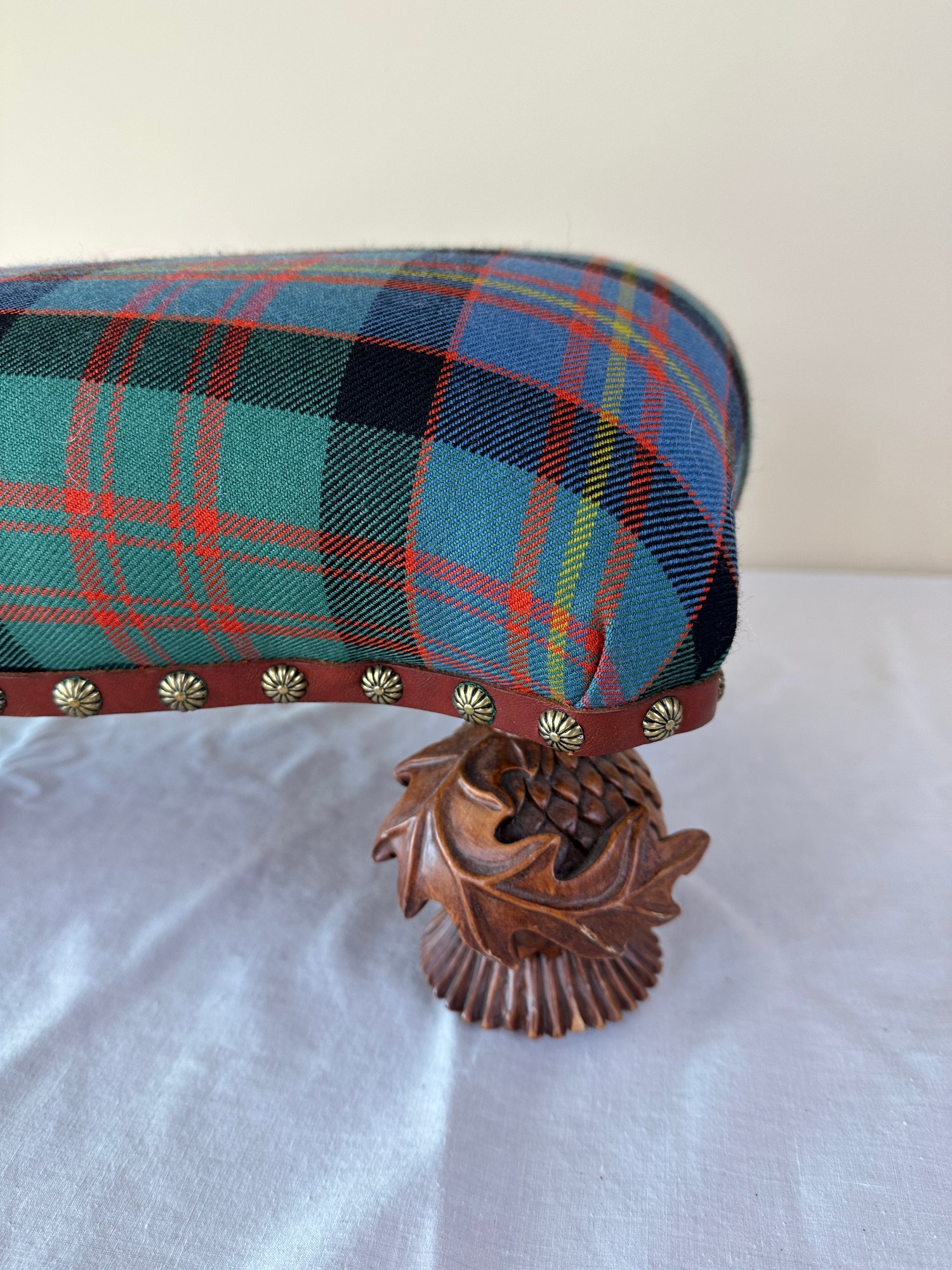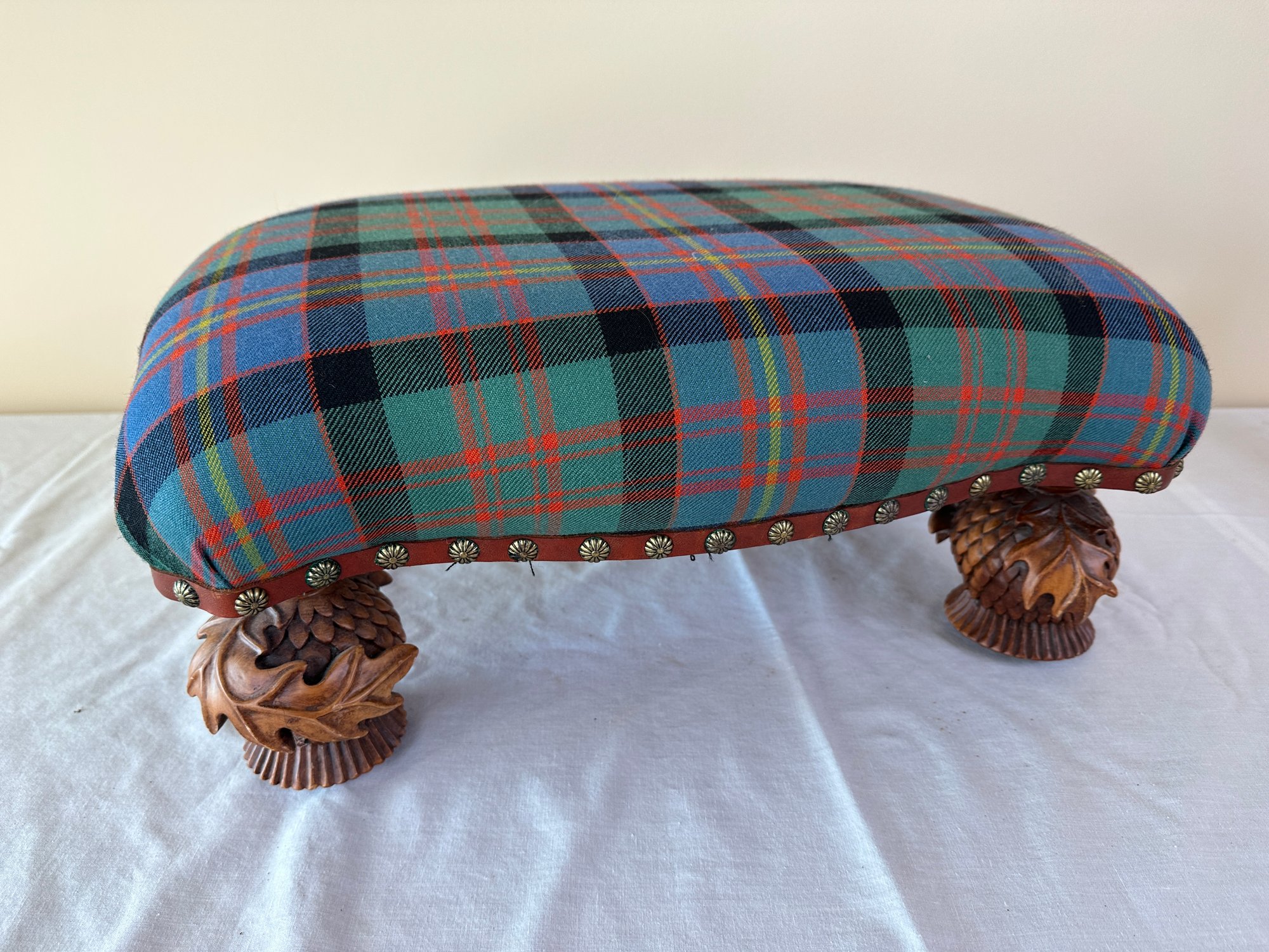 In plaid upholstery seated on decorative carved pine cone feet. Signed brass plaque underneath.