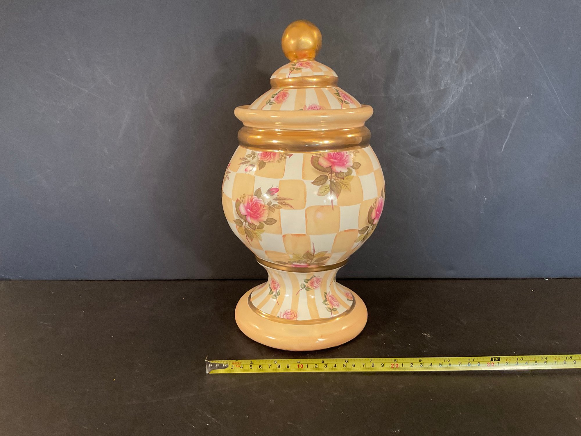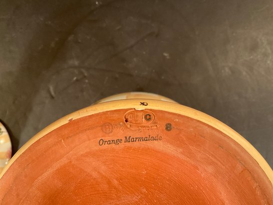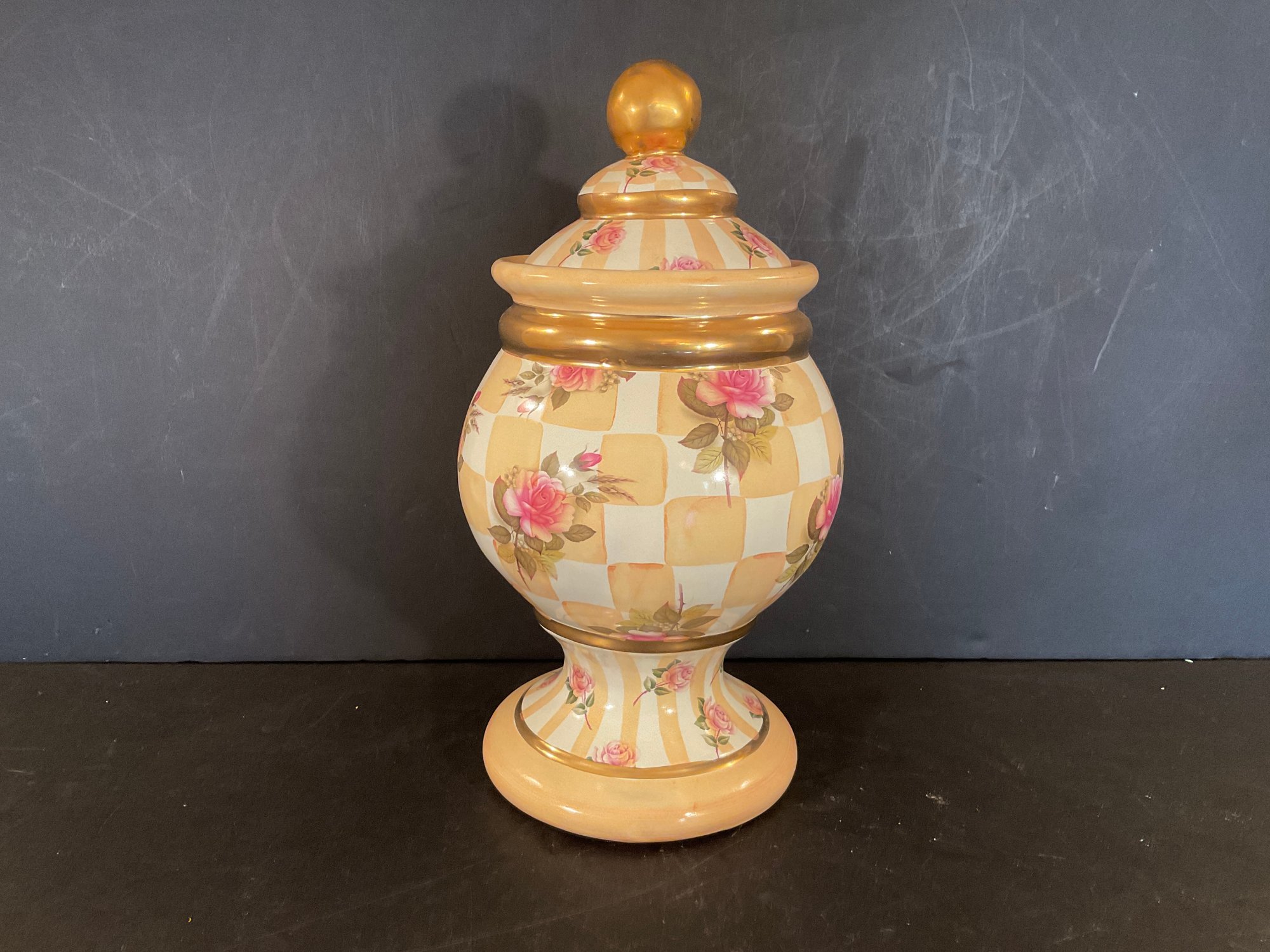 A very nice globe shaped covered urn signed by MacKenzie Childs. This urn is in the orange marmalade pattern.