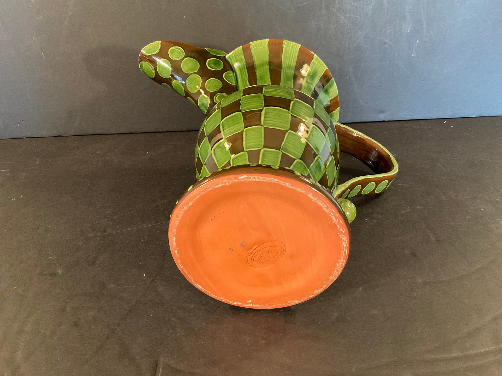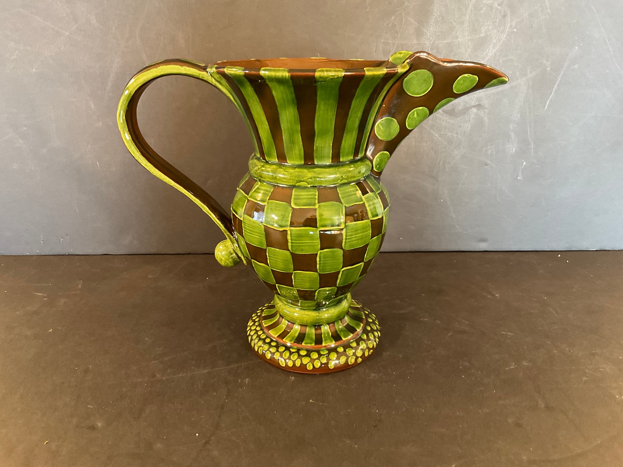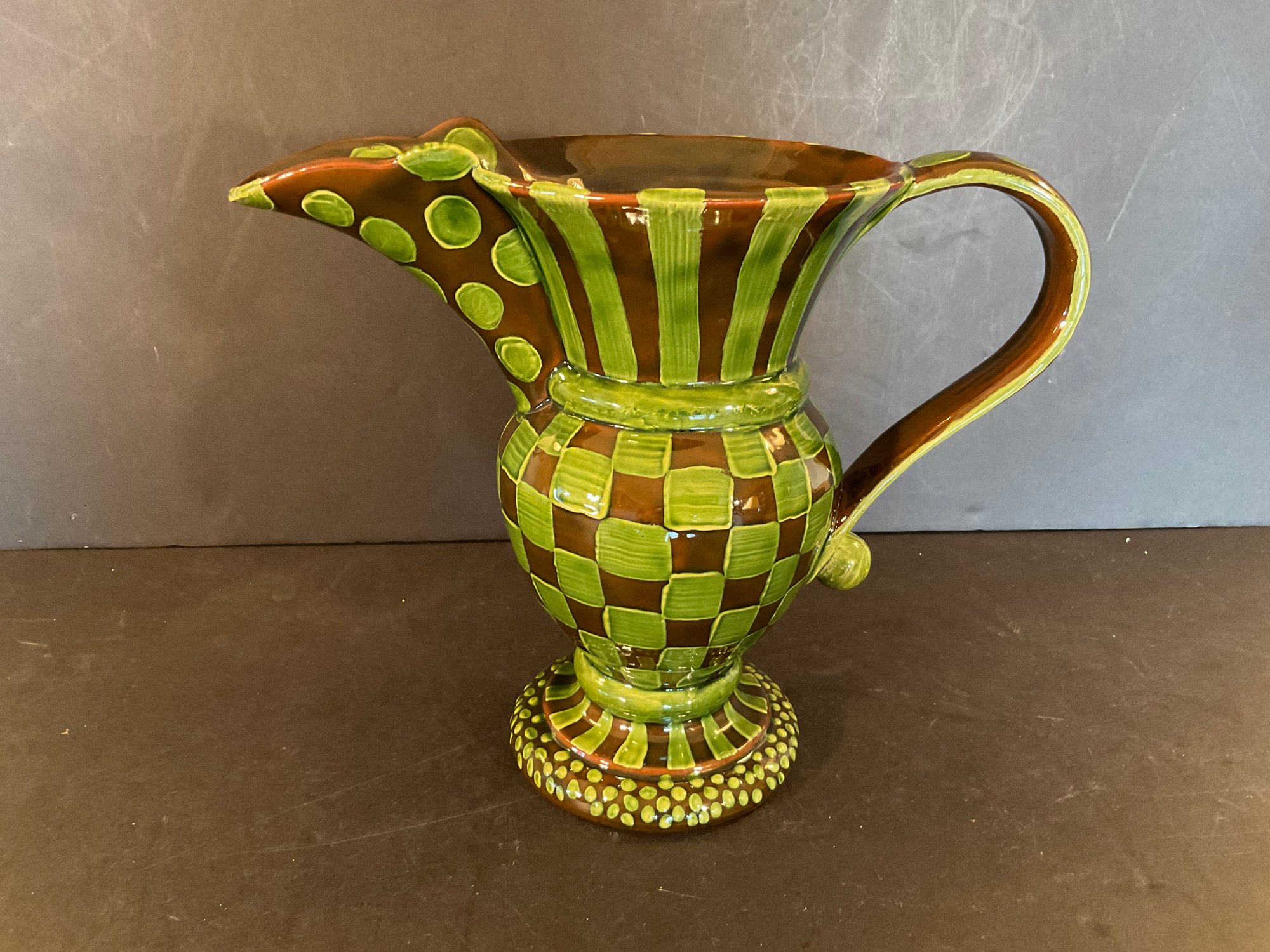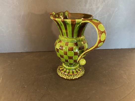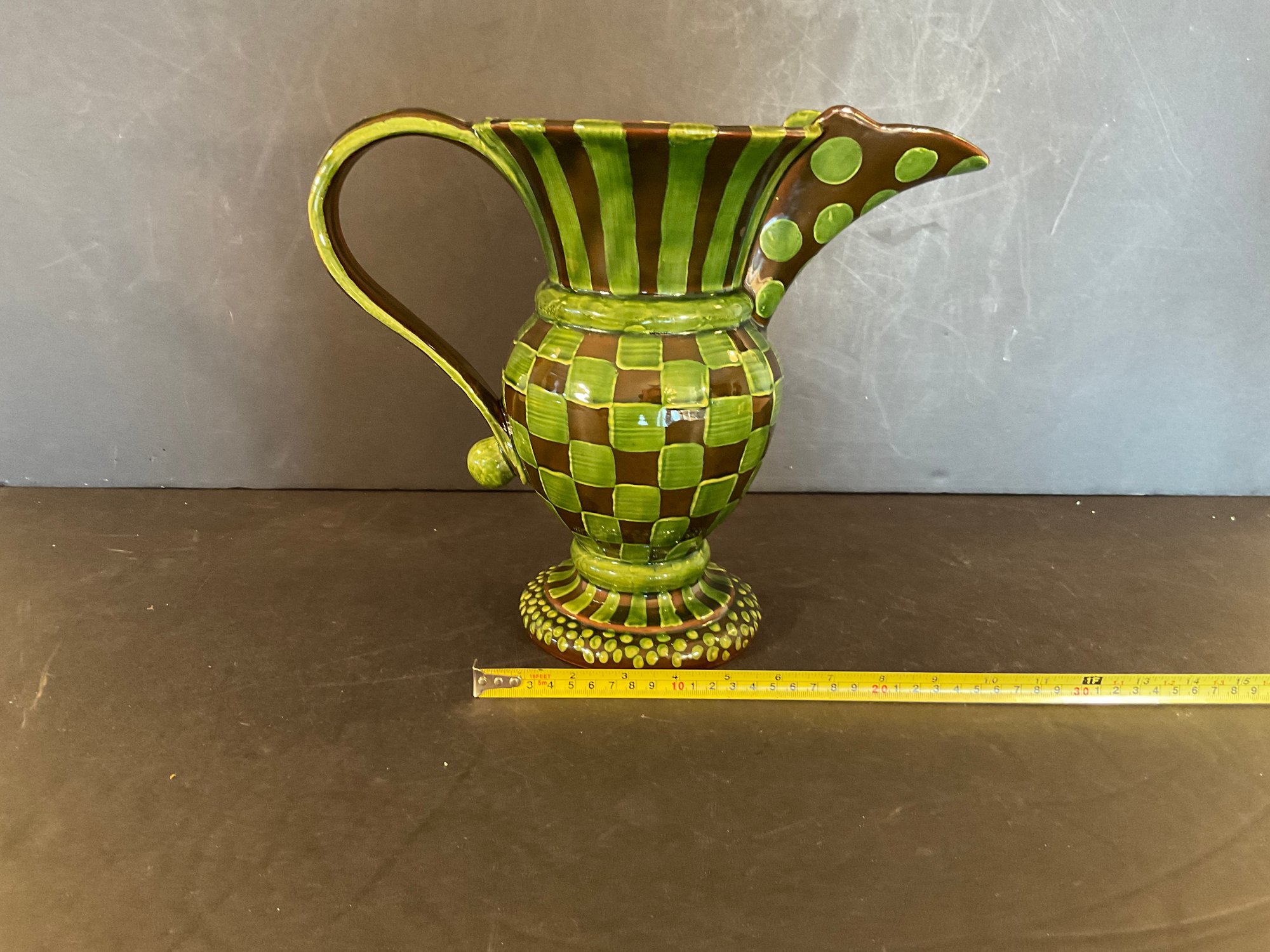 Large and impressive MacKenzie Childs Wittika pickle pitcher. A fabulous green glaze. Stamped on the bottom.