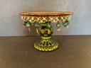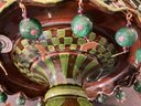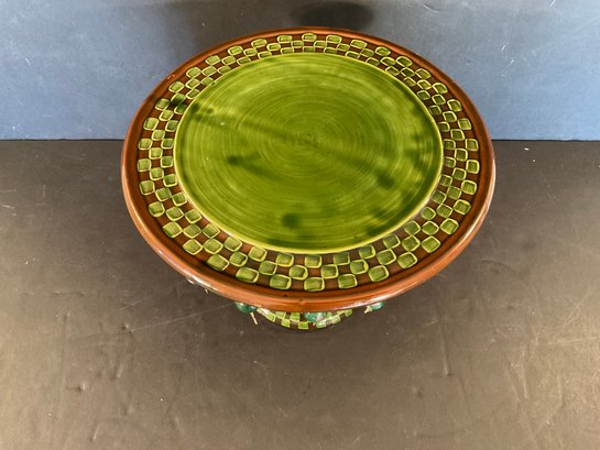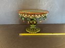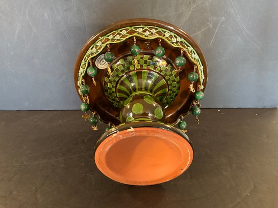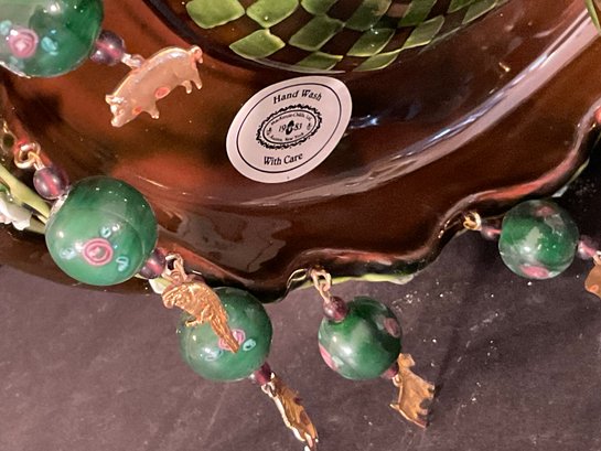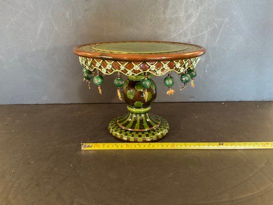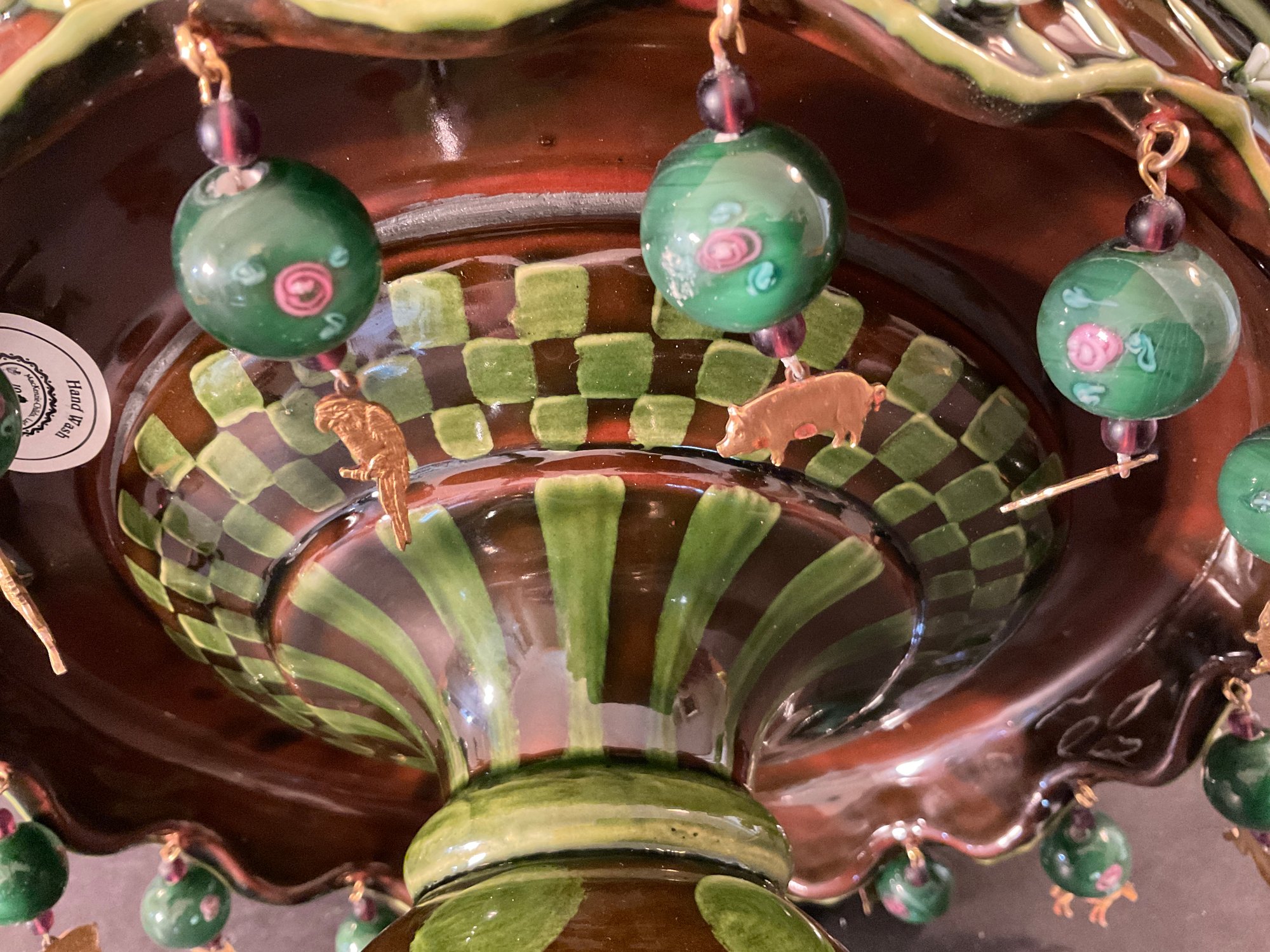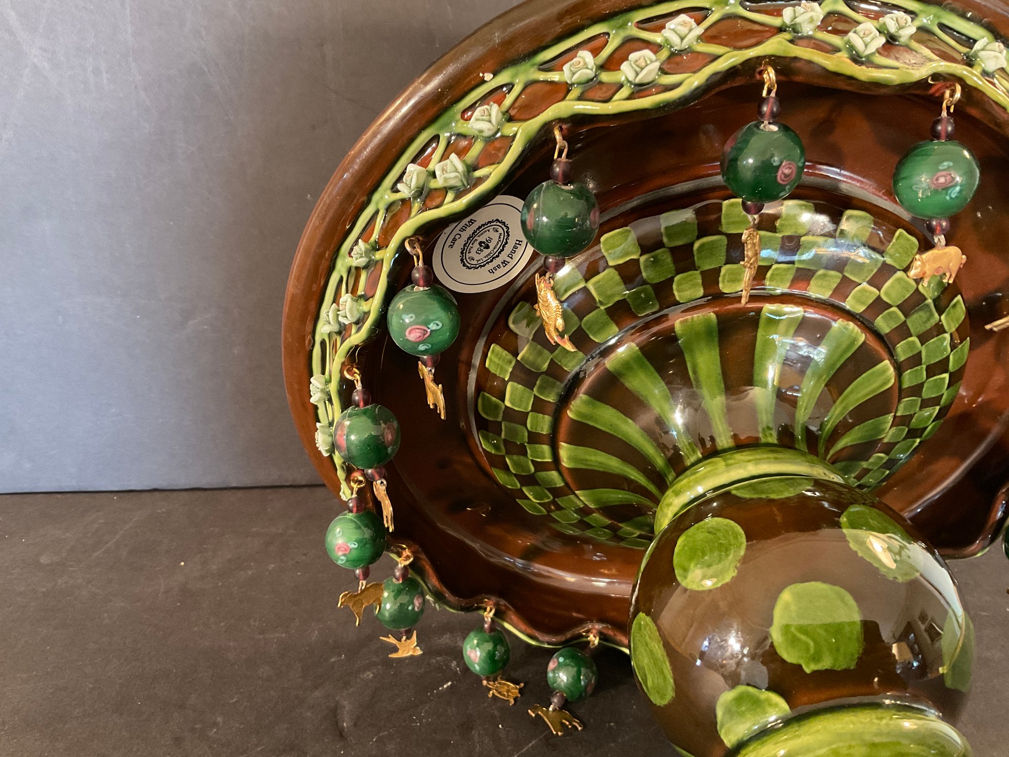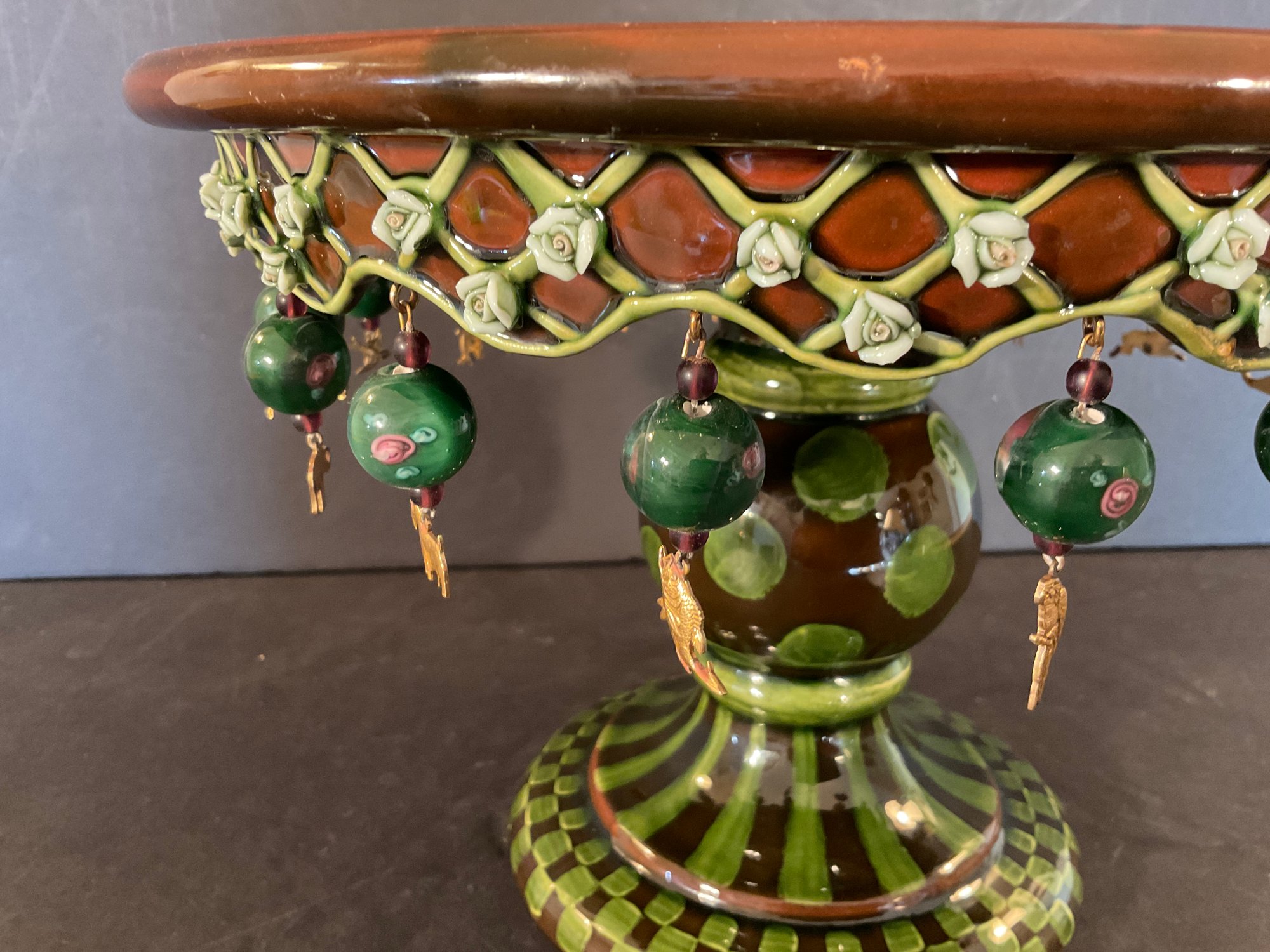 All the little brass dangling animals are different very interesting green glaze on this wonderful side MacKenzie Childs Wittika cake stand.