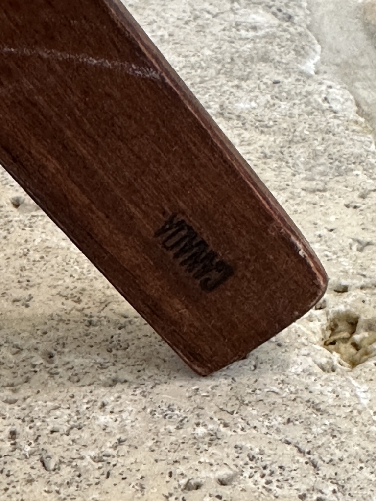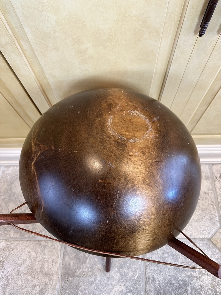 A vintage dough bowl with a tripod stand. Signed Canada.