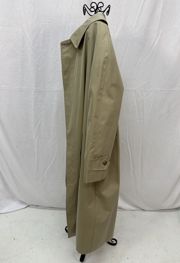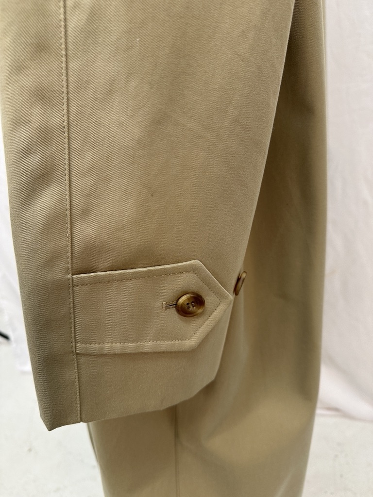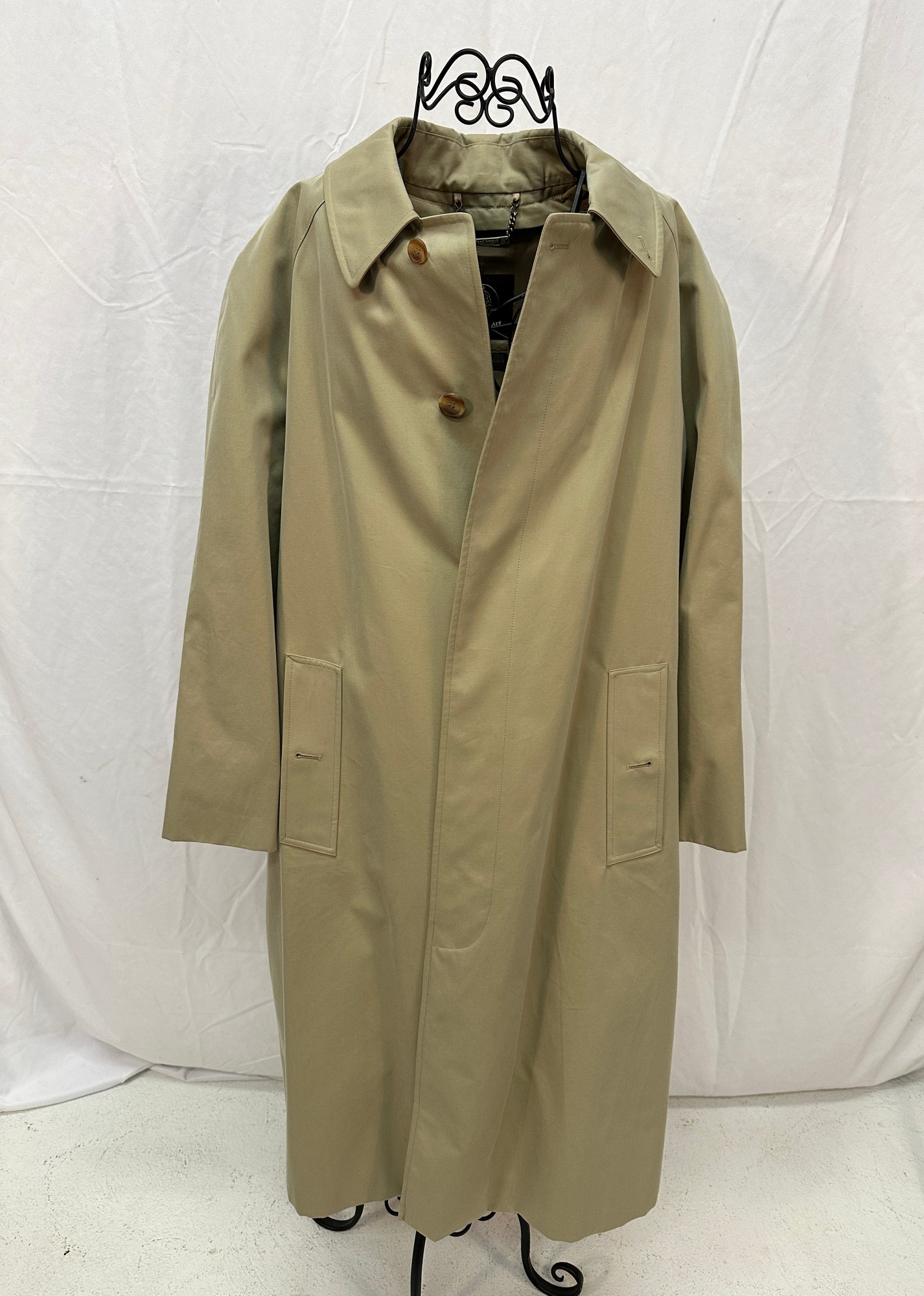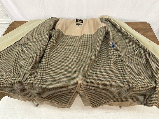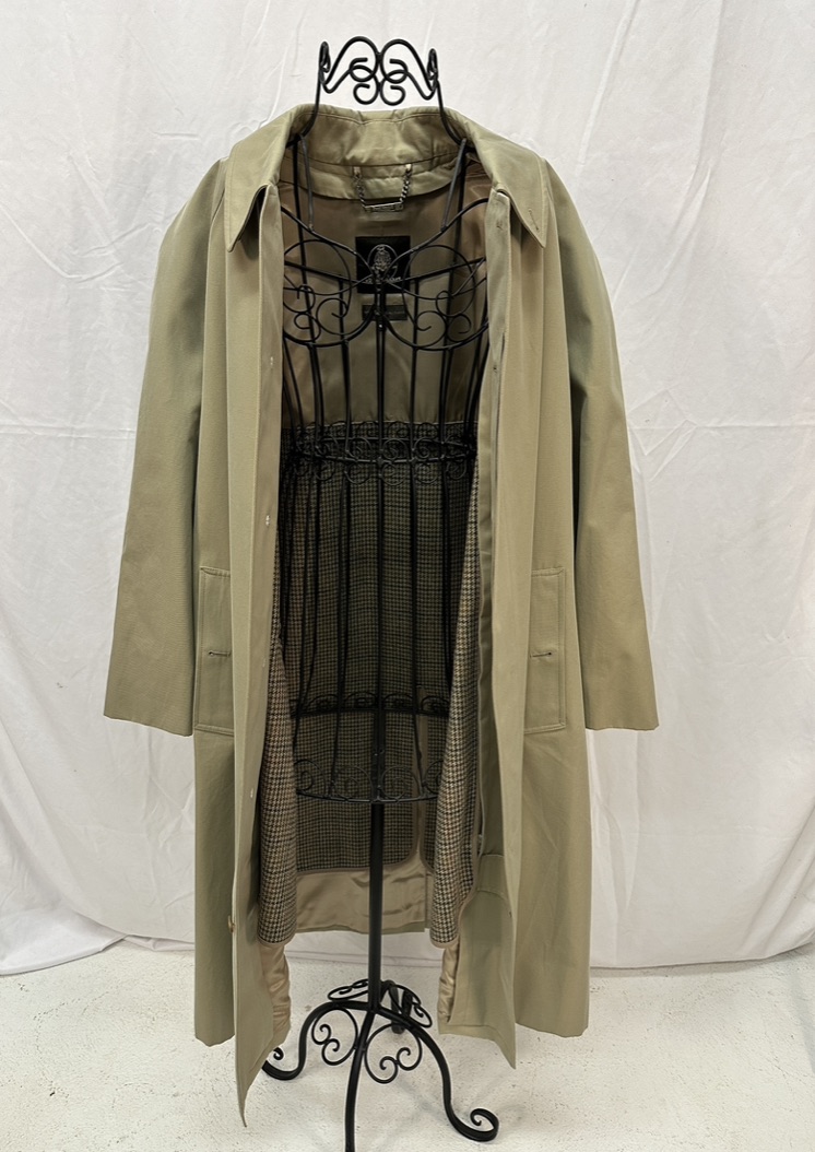A Paul Stuart trench coat made of cotton, with a houndstooth removable interior wool liner and pockets. Made in England.